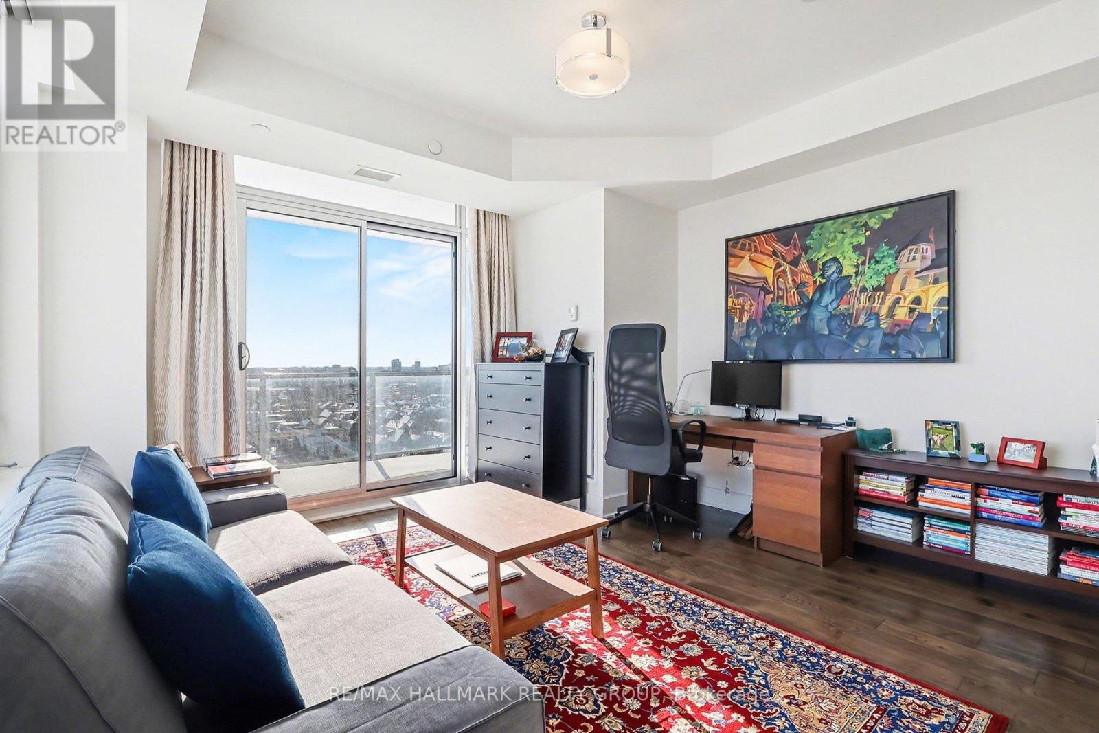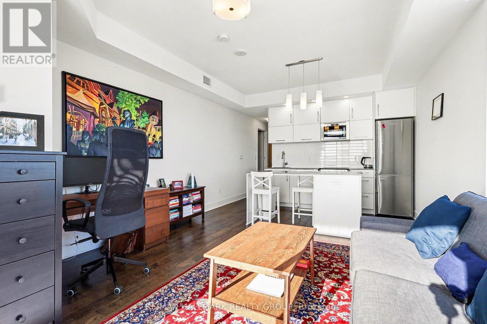 Rare Corner Unit at The Bowery! This bright & stylish 1-bedroom, 1-bath condo offers the layout homeowners crave & the light they can't fake. With south and east exposure & windows on two sides, this corner suite is flooded with natural light throughout the day & enjoys open urban views. The well-designed floor plan features hardwood floors & an open-concept kitchen, living/dining area ideal for modern living. The kitchen offers quartz countertops, 4 stainless steel appliances, ample cabinetry, & a generous island perfect for cooking, entertaining, or casual dining. The bedroom is spacious & sun-filled, while the full bathroom is finished with clean, contemporary style. An in-unit laundry adds everyday convenience. Private balcony offers distant, unobstructed views to the south and to the east above the city below. Residents of The Bowery enjoy premium amenities including a rooftop terrace with panoramic views, indoor saltwater pool, sauna, fully equipped fitness centre with yoga studio, lounge and dining spaces, business centre, & guest suites. Located in the heart of Centretown, just steps to LRT, Parliament Hill, shops, restaurants, & everyday essentials. A rare opportunity to own a true corner unit in one of downtown Ottawa's more desirable condo buildings - bright, efficient, and perfectly positioned for urban living. (id:64974)