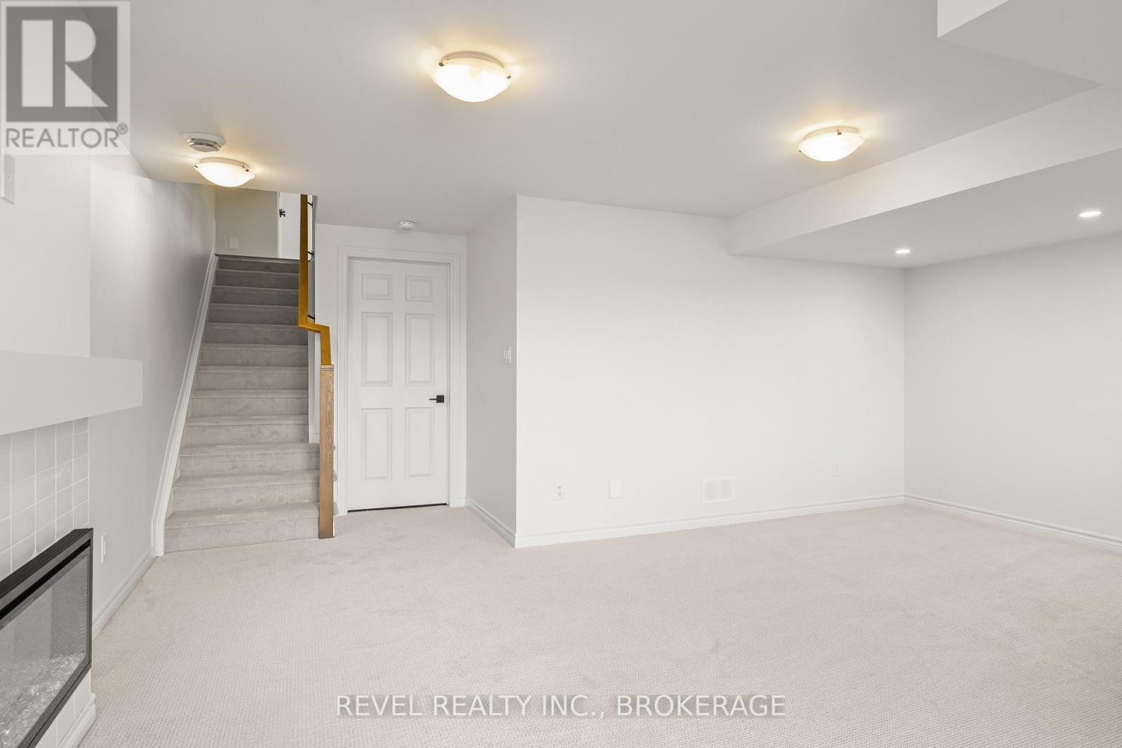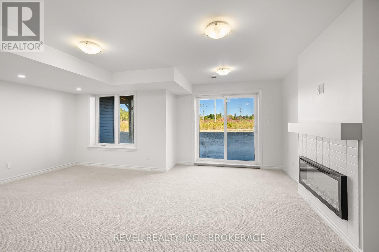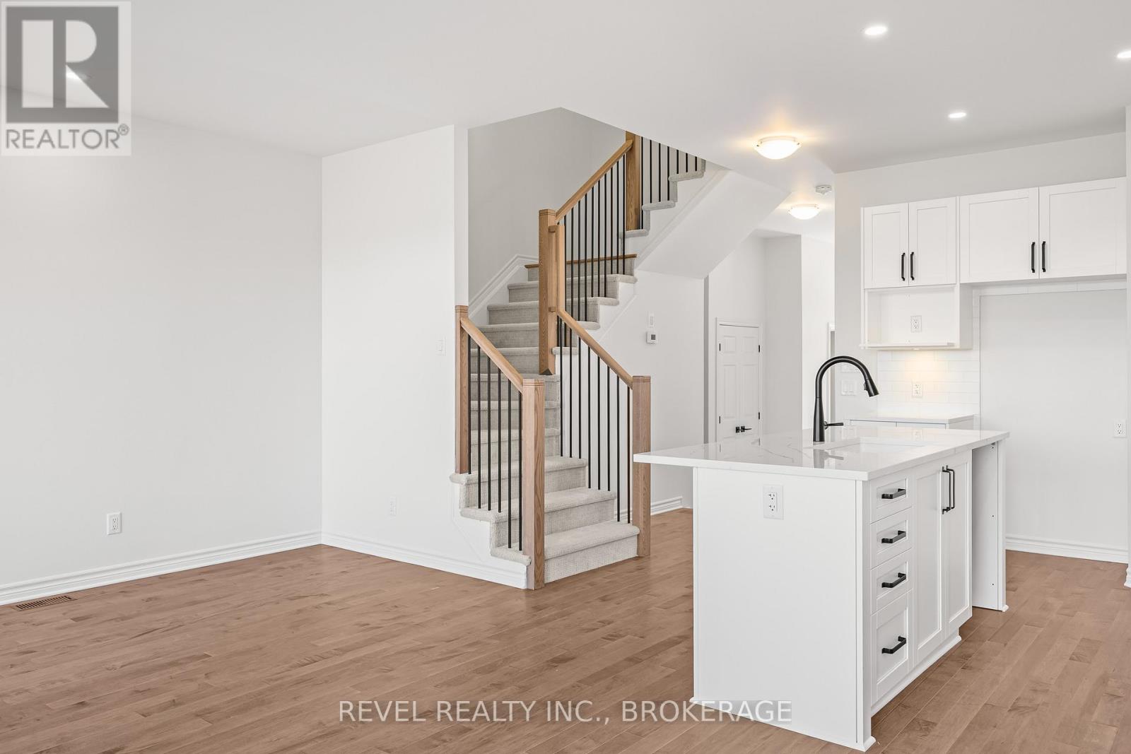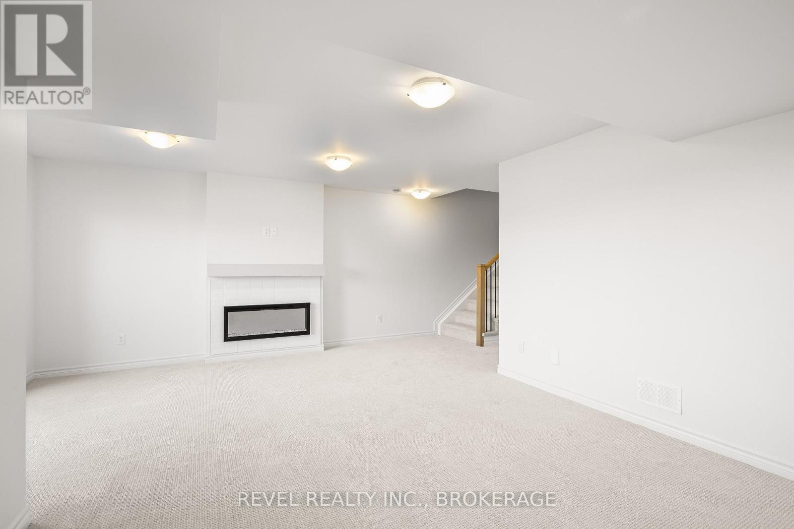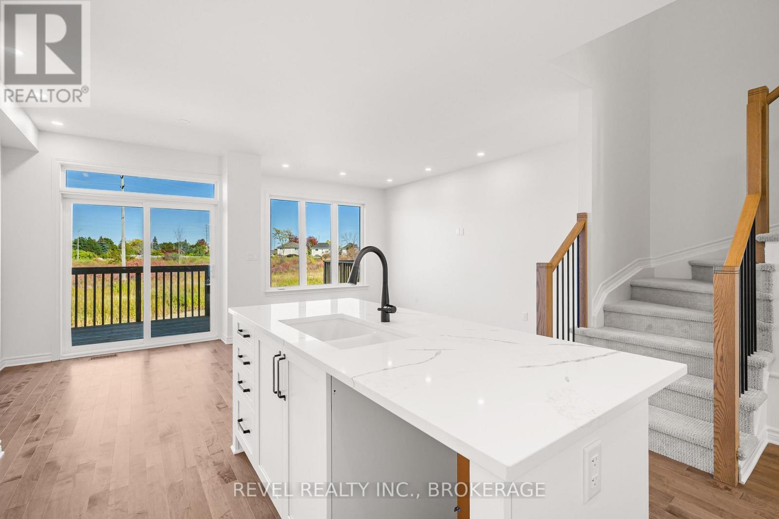 The Abbey model offers 1,855 square feet of finished stylish living in Kingstons West Village community. The main floor showcases maple hardwood, a modern kitchen with quartz counters, white shaker cabinetry, an upgraded sink, and a spacious walk-in pantry. A cozy gas fireplace anchors the living area. Upstairs, the primary suite includes a luxurious 4-piece ensuite with a freestanding tub and a walk-in tile-and-glass shower. The home also features a finished walkout basement with a rough-in for a future bathroom, giving you plenty of extra living space and flexibility. ENERGY STAR certified for efficiency, this home is close to the Rio Can, Cataraqui Centre, new schools, and parks. (id:64974)