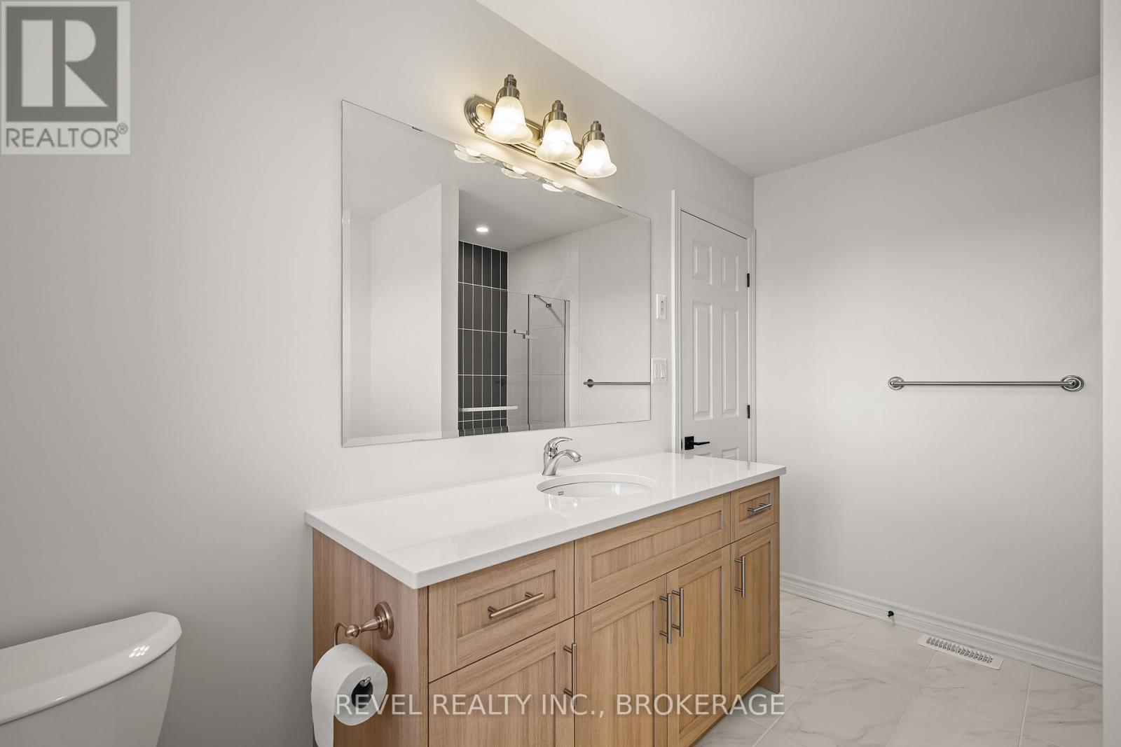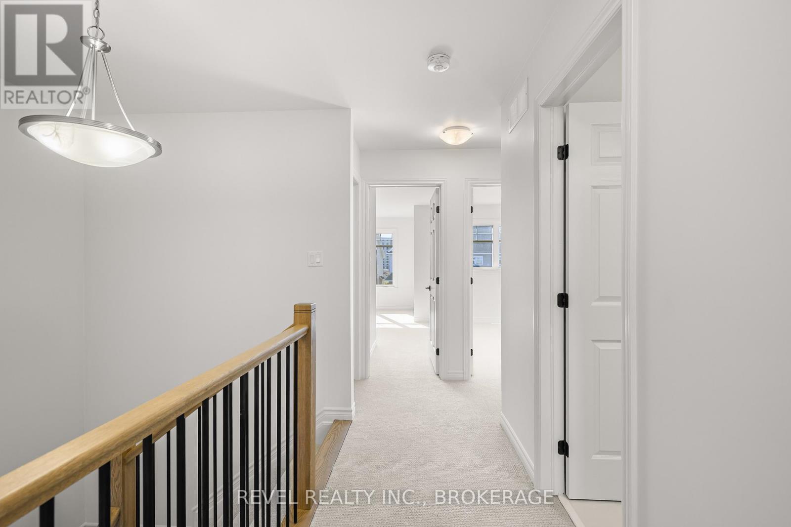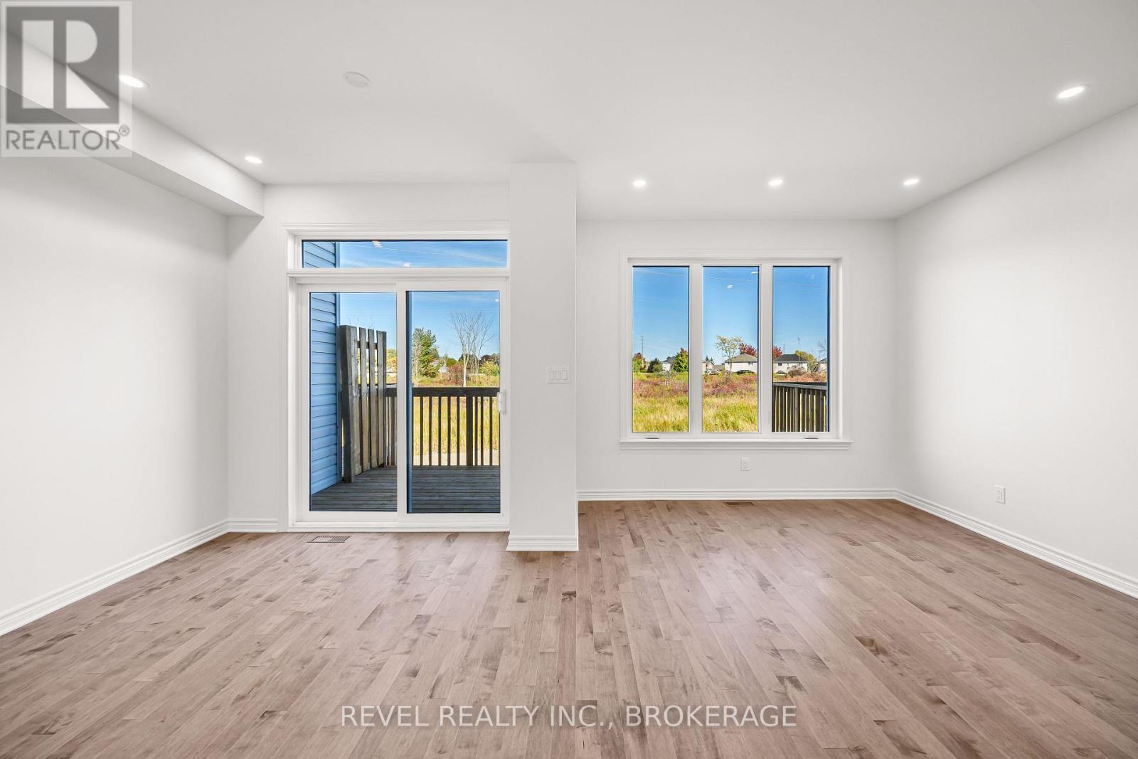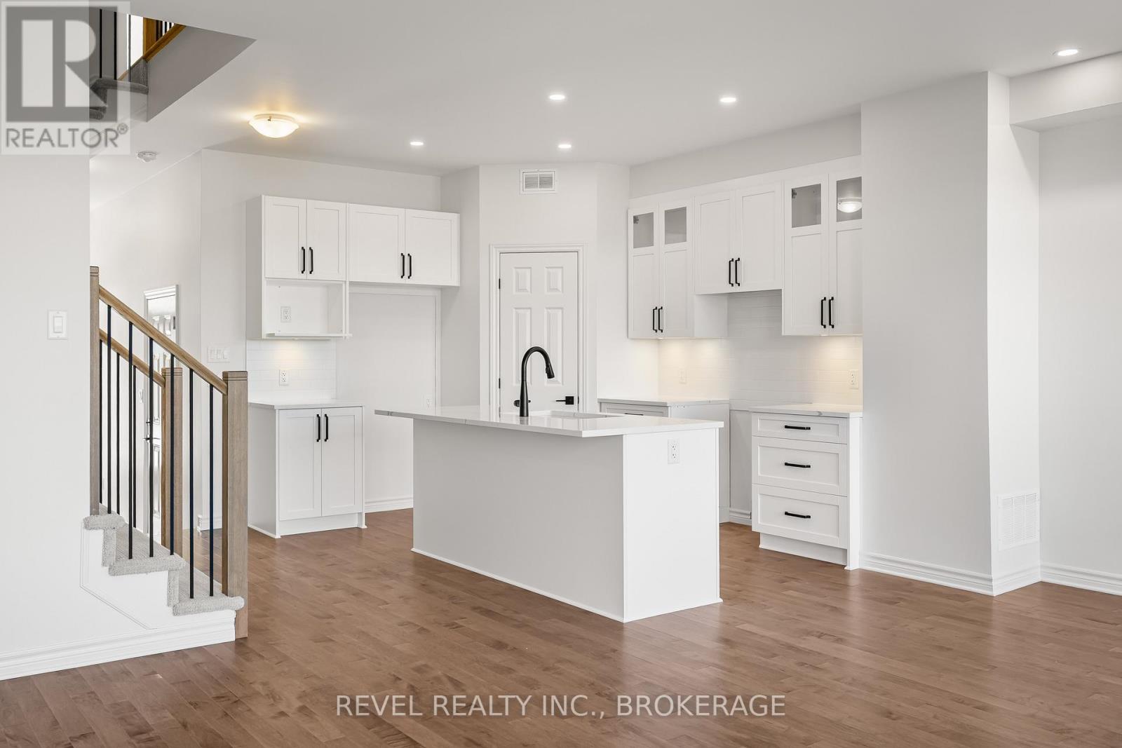 The Abbey model offers 1,855 square feet of finished stylish living in Kingstons West Village community. The main floor showcases maple hardwood, a modern kitchen with quartz counters, white shaker cabinetry, an upgraded sink, and a spacious walk-in pantry. A cozy gas fireplace anchors the living area. Upstairs, the primary suite includes a luxurious 4-piece ensuite with a freestanding tub and a walk-in tile-and-glass shower. The home also features a finished walkout basement with a rough-in for a future bathroom, giving you plenty of extra living space and flexibility. ENERGY STAR certified for efficiency, this home is close to the Rio Can, Cataraqui Centre, new schools, and parks. (id:64974)