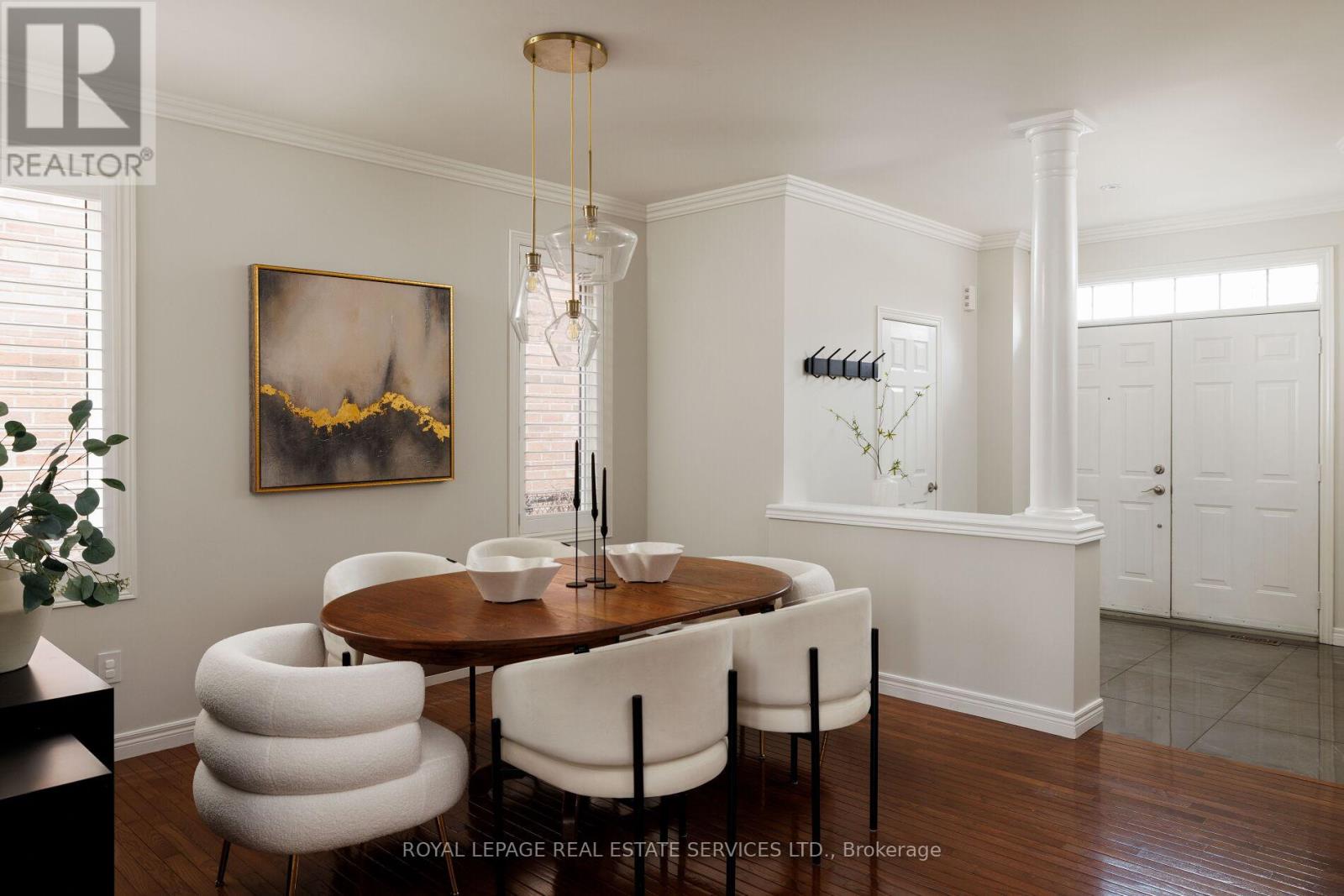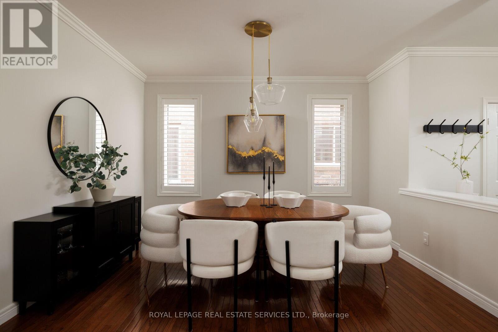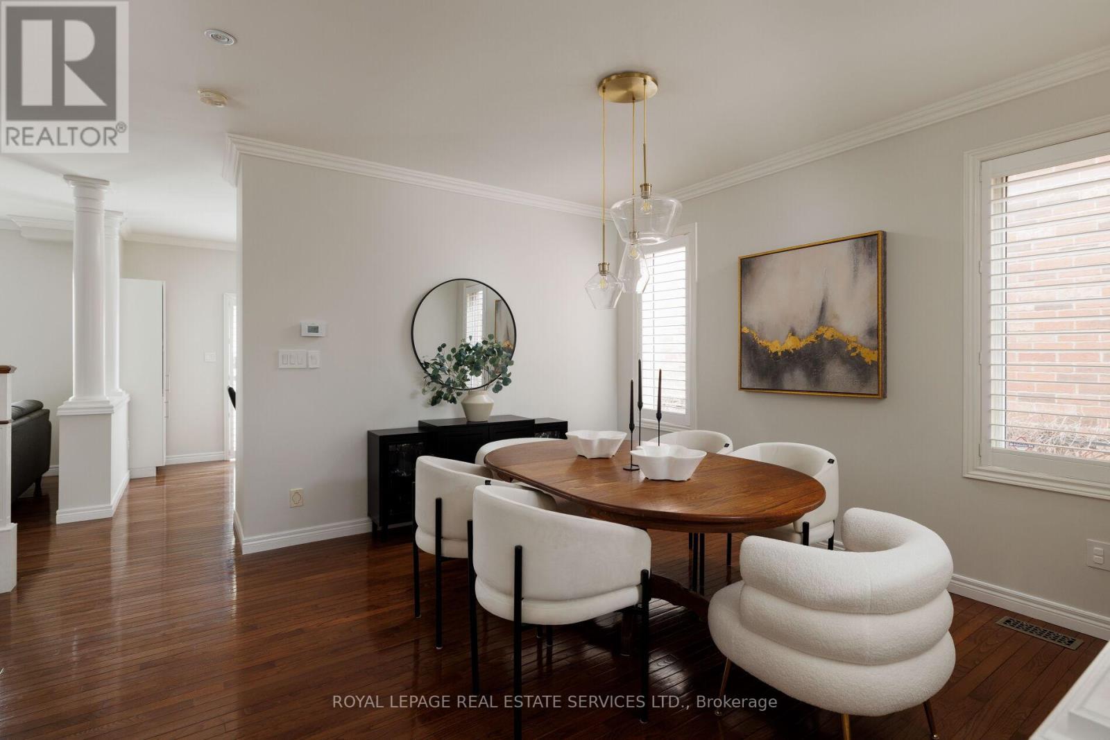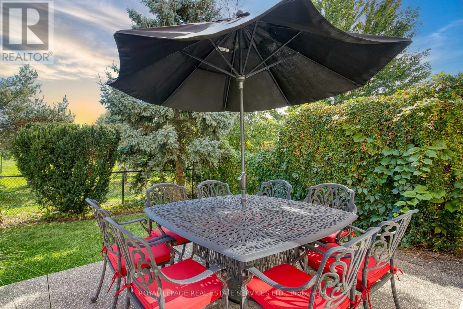 Stunning, turnkey home in sought-after West Oak Trails, backing directly onto Bloomfield Park with no rear neighbours-an exceptional setting offering privacy, tranquil views, and direct gate access to green space and trails. Located in a top-rated school district and minutes to Oakville Trafalgar Memorial Hospital, Glen Abbey Community Centre, The Abbey Plaza, Bronte GO Station and highways (QEW/407), this home blends nature with urban convenience. Exceptional curb appeal features beautiful, manicured gardens, an exposed aggregate double driveway leading to the double garage with inside entry, while soffit lighting enhances the upgraded brick exterior. The private backyard retreat boasts a spacious exposed-aggregate patio-ideal for entertaining or relaxing in a serene, park-like setting. Offering well-designed above-grade living space plus a finished basement, this home showcases hardwood floors, crown mouldings, California shutters, 9' ceilings, pot lights, and an upgraded staircase with metal pickets. The bright family room, with elegant crown mouldings, a gas fireplace, and a wall of windows, overlooks the park. A formal dining room is perfect for hosting, and the kitchen features maple cabinetry with valance lighting, quartz counters, stainless steel appliances, a centre island with a breakfast bar, and a walkout to the yard. Upstairs offers 3 bedrooms, plus a versatile den (optional 4th bedroom), and 2 renovated baths, including a luxurious primary retreat with a spa-inspired 5-piece ensuite, heated floor tiles, soaker tub, and glass shower with body jets. The finished basement adds a large rec room, 4th bedroom (no closet) with fireplace, and 3-piece bath-ideal for families or multi-generational living. Updates: roof (2015), furnace & HWT (2016), A/C (2021). (id:64974)