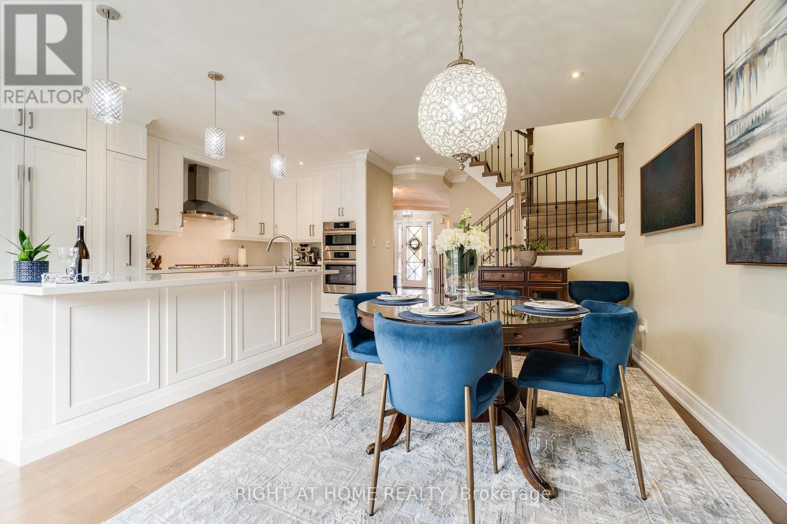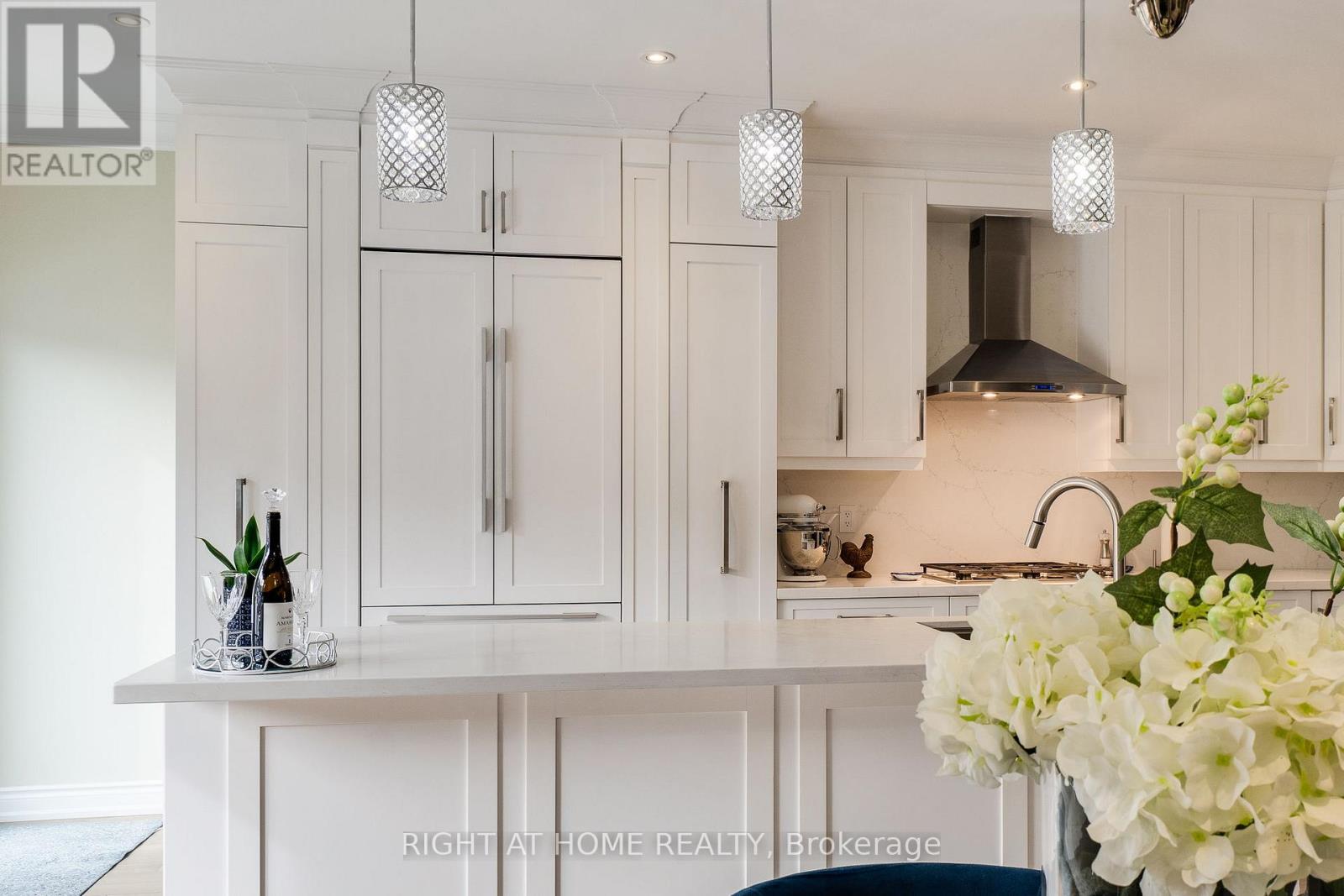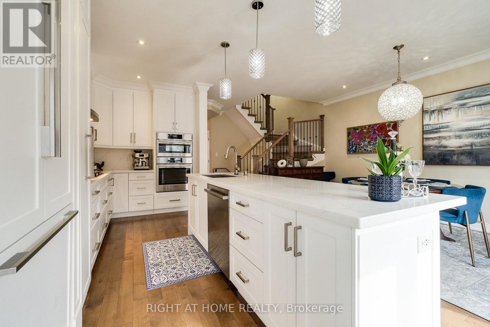 Welcome to this beautifully and extensively renovated 3-bedroom detached home in the highly sought-after River Oaks community, offering refined design and over $300,000 in premium upgrades. The main floor features an elegant open-concept living and dining layout anchored by a stunning custom kitchen completed in 2024, showcasing a large quartz island and backsplash, and high-end appliances including a Dacor gas cooktop, Bosch double wall ovens, Dacor paneled refrigerator with dual motor and temperature control and dual filtered water dispenser, and Bosch dishwasher, with a walkout to a private fully fenced backyard patio ideal for entertaining. New hardwood flooring installed throughout the home, including second floor bedrooms (2024), complements the modern aesthetic, with Cheney black casement windows, updated railings and handrails, and fresh paint enhance the home's craftsmanship. The second floor offers a spacious family room with built-in entertainment unit that can easily convert to a 4th bedroom. The large walk-in closet can be converted back to a second floor laundry room. A private level is dedicated to the primary retreat, featuring a walk-in closet, a luxurious 4-piece ensuite with glass-enclosed shower and stand-alone soaker tub, and a bonus area with built-in closets and vaulted ceiling, ideal for a nursery or home office. The finished basement provides additional living or recreational space. complemented by a double-car garage. Major upgrades include Cheney Custom Windows and Front Door (2024), kitchen and bathrooms (2024), backyard and exterior stonework ,lighting , fencing and landscaping (2020). Double car garage, new garage door(2018).Ideally located near top-rated schools, parks, trails, shopping, dining, Oakville GO, and the QEW, this exceptional home blends luxury, space, and lifestyle convenience. (id:64974)