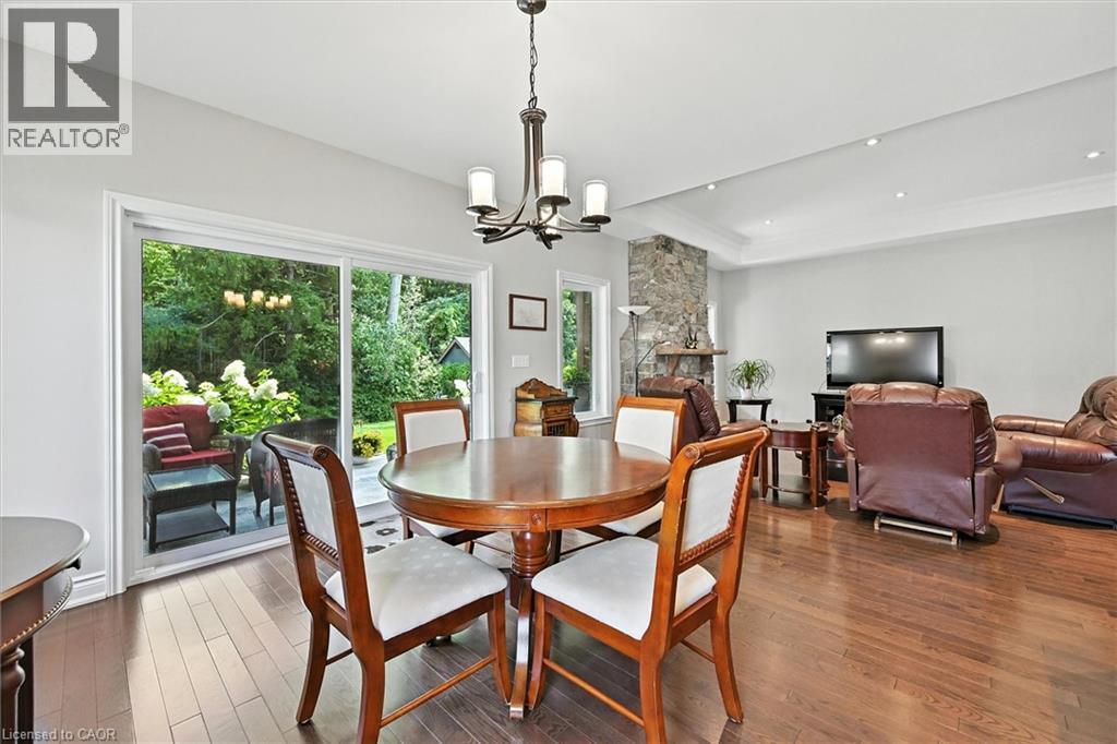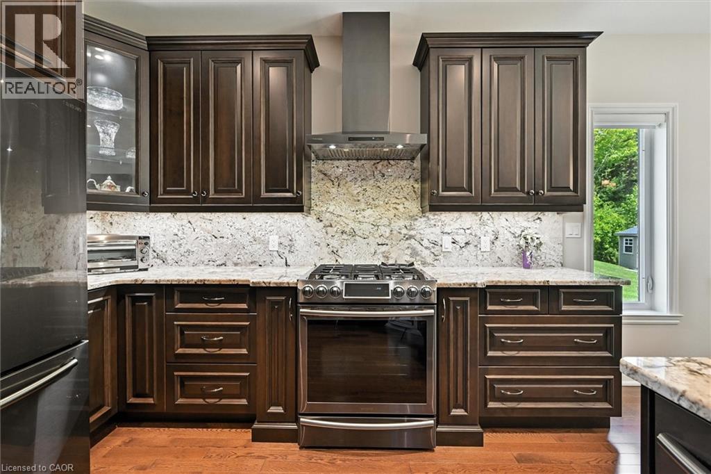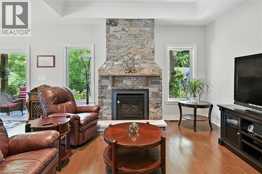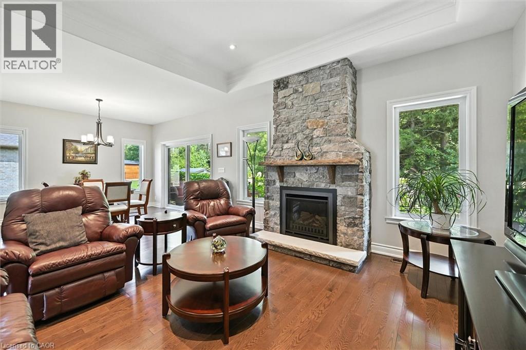 Welcome to this beautifully designed bungalow, perfectly situated on a highly sought-after 65’ x 130’ wooded lot, offering exceptional privacy and natural beauty. Thoughtfully upgraded throughout, The upscale kitchen and bathrooms feature luxurious granite countertops, providing both style and durability. Two cozy gas fireplaces add warmth and character, while rich hardwood floors bring timeless charm to the main living spaces. Expansive windows fill the home with natural light, creating a bright, uplifting atmosphere in every room. An oversized garage offers ample parking and storage, and a built-in sprinkler system ensures the landscaped yard stays lush and beautiful with ease. The fully finished basement (8’4” ceilings) offers versatile living space with a brick gas fireplace, two bedrooms, a wet bar with built-in cabinetry, a three-piece bathroom, and additional large windows. Move-in ready and meticulously maintained, this home perfectly combines comfort, functionality, and elegance—set against the tranquil backdrop of a private, wooded property. (id:64974)