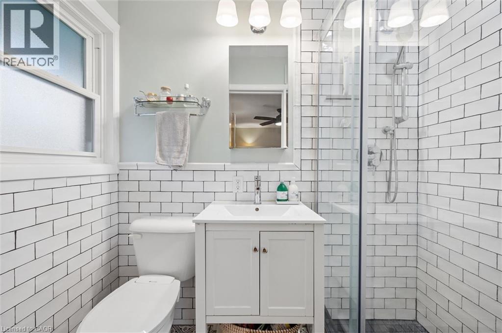 Set on a picturesque, tree-lined street in the sought-after Forest Hill neighborhood of Kitchener, this bright and spacious home offers a rare combination of features. This beautifully updated, oversized bungalow boasts over 1,500 square feet on the main floor and sits on a stunning mature lot. The gorgeous kitchen, renovated in 2018, is highlighted by sleek cabinetry with soft-close drawers, quartz countertops, stainless steel appliances, a tiled backsplash, a stylish range hood for the gas stove, and modern pot lighting. A standout feature for a bungalow of this vintage is the primary suite, which includes a luxurious three-piece ensuite and a walk-in closet. Quality continues throughout the home, as the main four-piece bathroom upstairs and the three-piece bathroom downstairs both feature quartz counters, extensive subway tile, and upgraded fixtures.The inviting tiled foyer opens into an L-shaped living and dining area featuring gleaming new hardwood floors. Natural light and views abound through a large bay window at the front and oversized sliding patio doors at the back. The remainder of the main level consists of two additional bedrooms with original hardwood floors. The finished basement offers an amazing recreation room perfect for entertaining, anchored by a floor-to-ceiling gas fireplace insert. This level also includes a second luxury three-piece bathroom and a versatile fourth bedroom or office. Other extensive updates providing peace of mind include paintable James Hardie siding and all-new windows (2021), furnace, AC, and humidifier (2021), deck and four-person Hydropool hot tub (approx. 2022), roof shingles (2014), and a custom shed/greenhouse (2025). (id:64974)