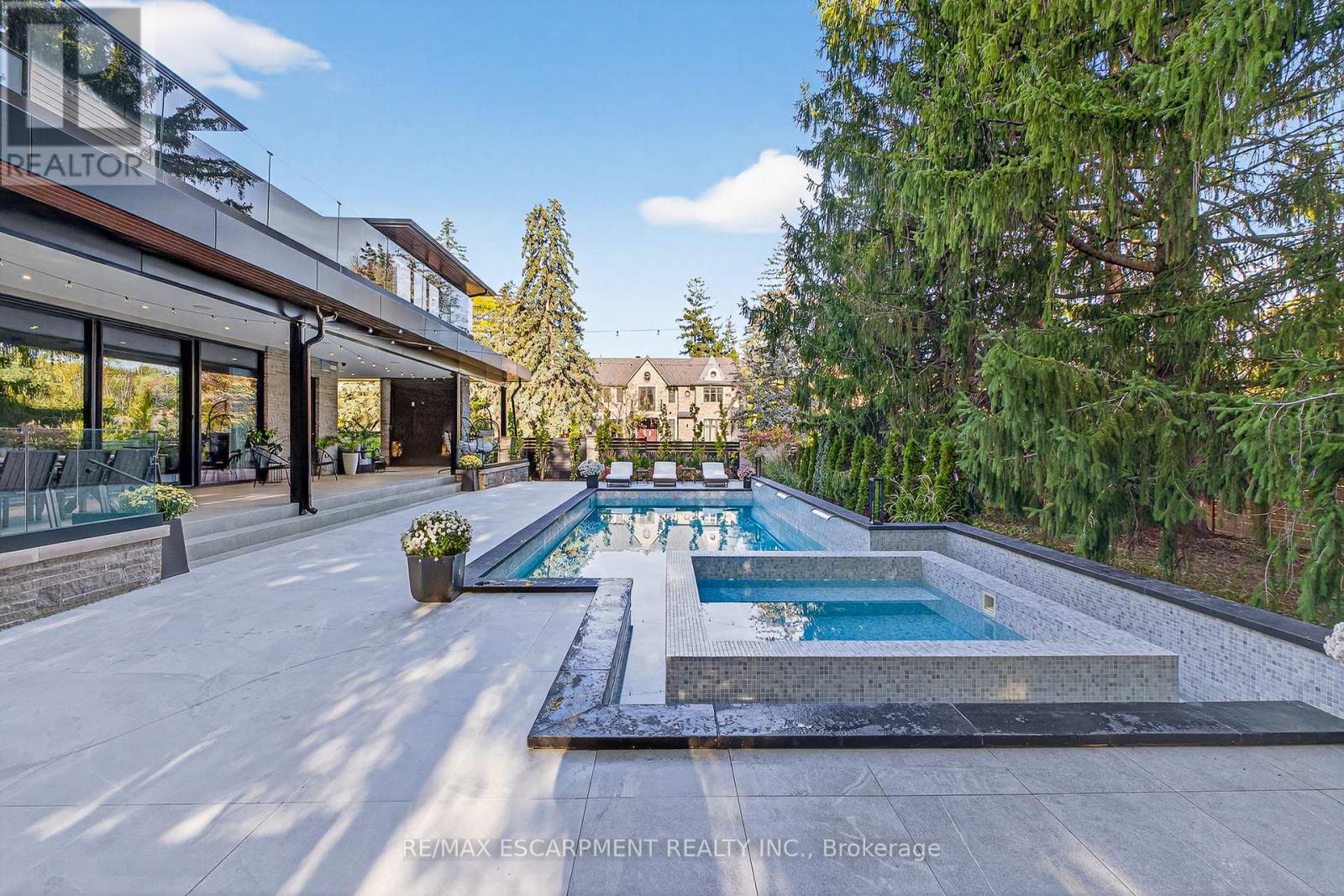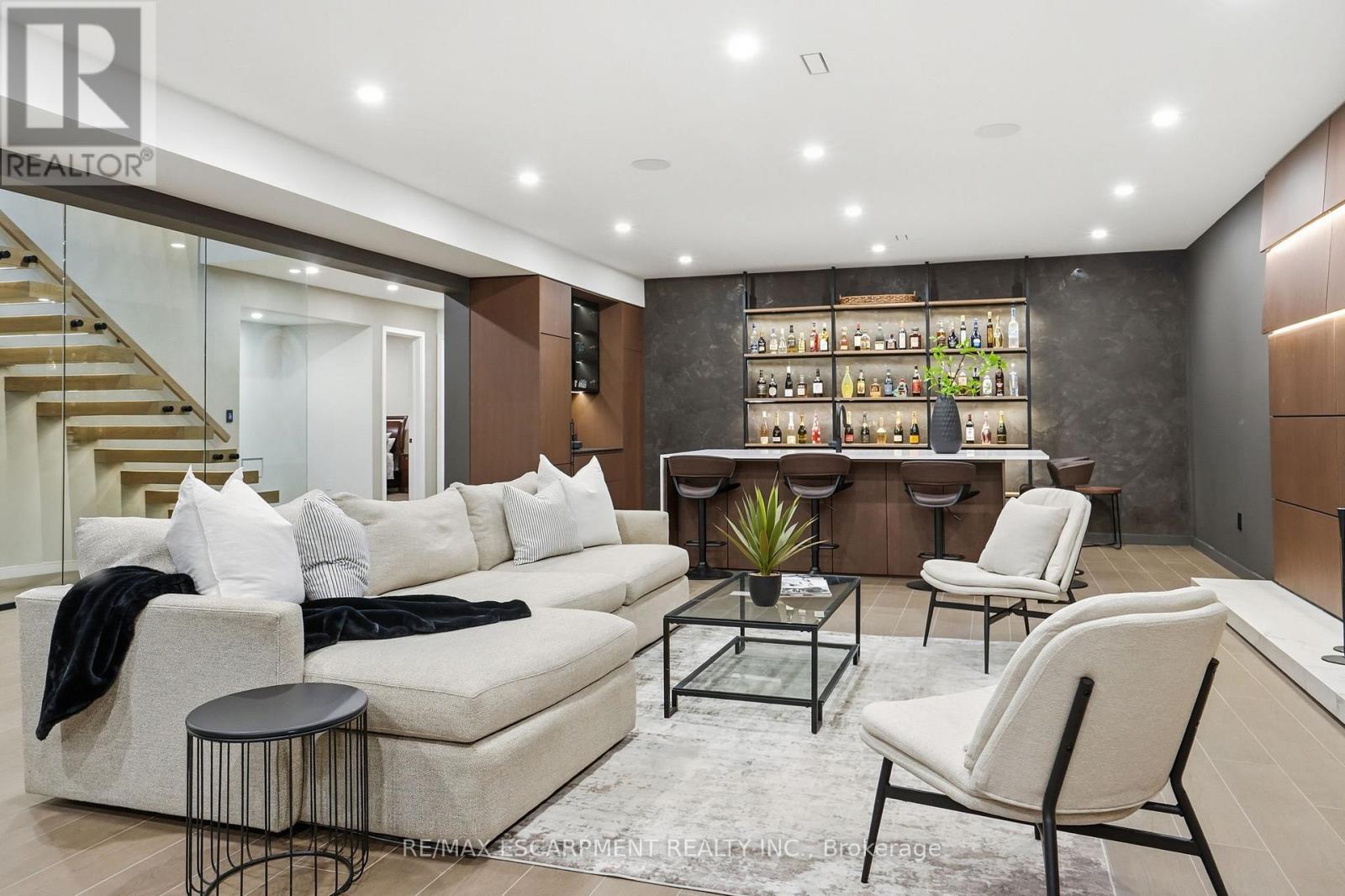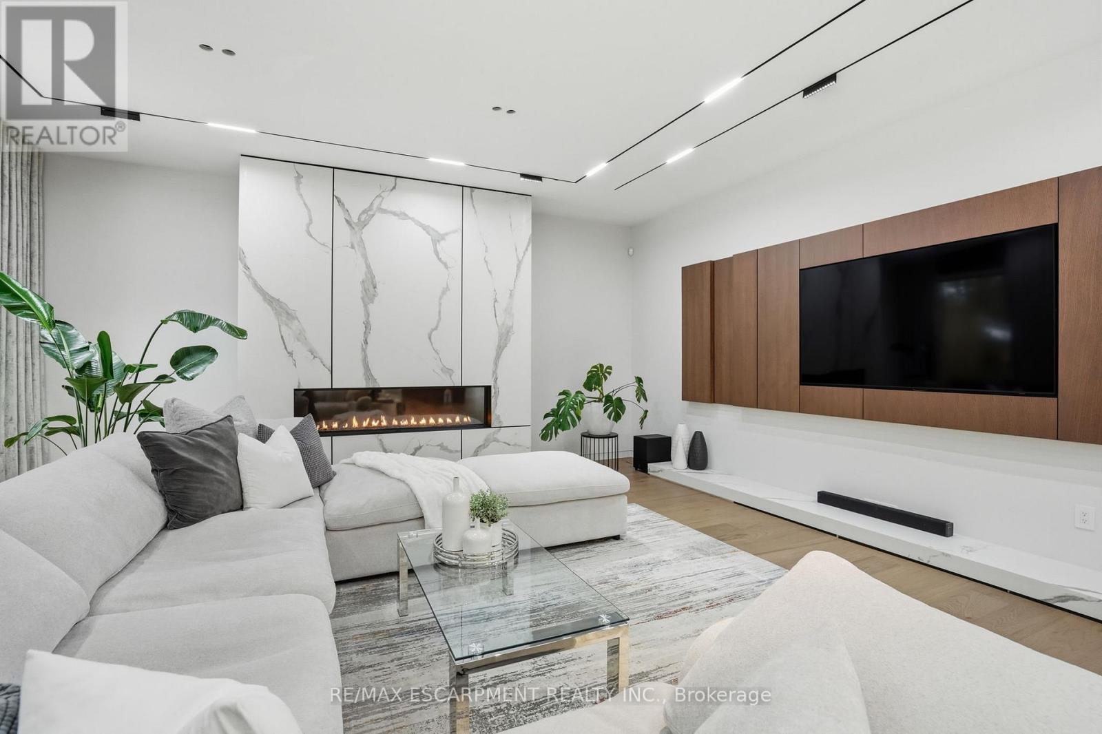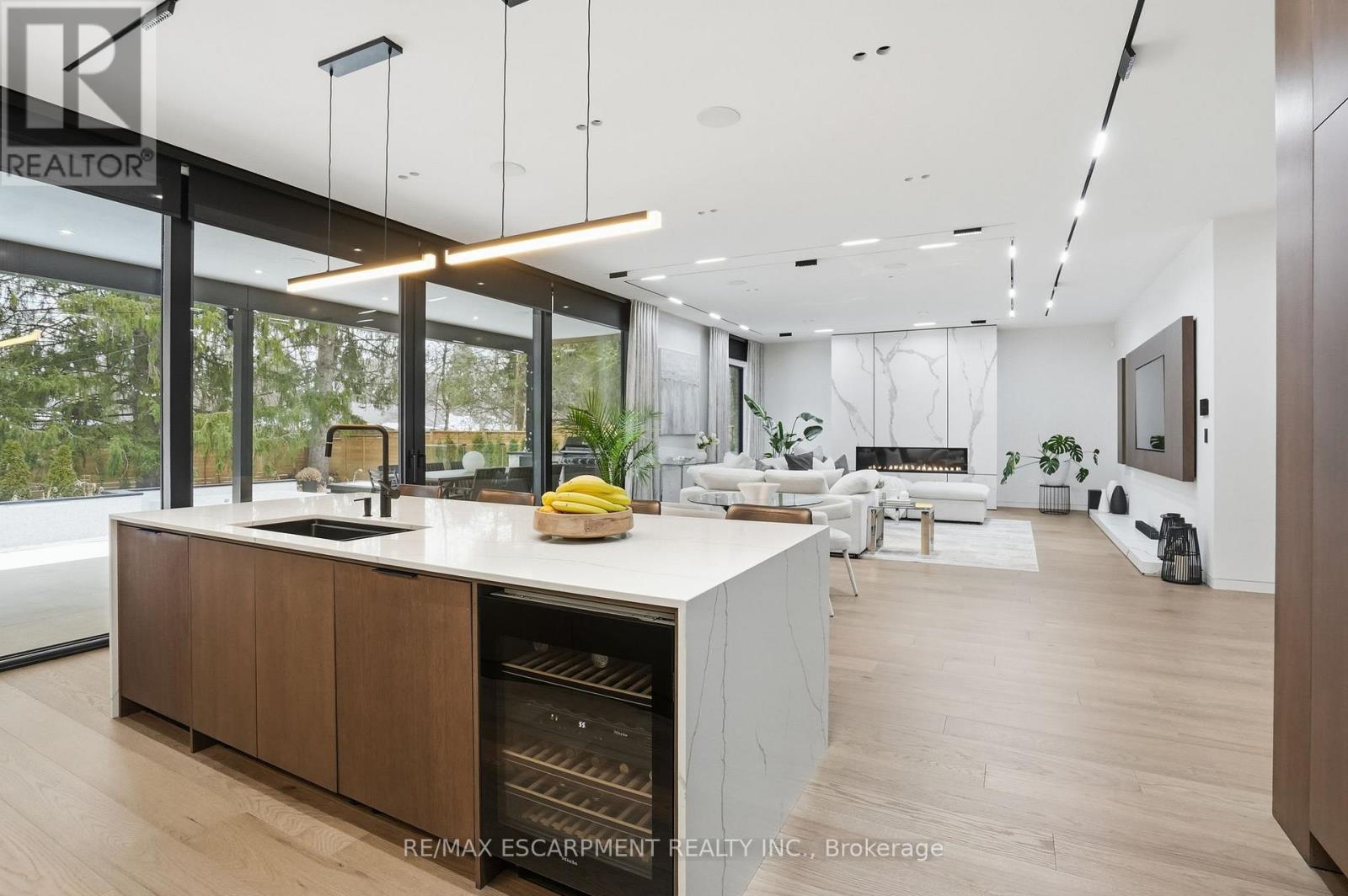 Architectural sophistication meets resort inspired living in this custom modern residence. A striking stone and horizontal façade with oversized black framed windows and glass garage door creates unforgettable curb appeal, surrounded by mature landscaping and clean concrete hardscaping.Inside, a dramatic 20 foot foyer with floor to ceiling glazing and dual statement light fixtures sets the tone. Wide plank hardwood floors, glass railings, custom millwork, and curated finishes flow throughout. The family room is anchored by a bookmatched porcelain slab fireplace wall and expansive sliding doors that seamlessly connect indoor and outdoor living.The chef's kitchen features full height flat panel cabinetry, waterfall island, porcelain slab backsplash, under cabinet lighting, and a premium Miele appliance suite including 5 burner gas cooktop, wall oven, microwave, dishwasher, and wine fridge. A separate butler's pantry adds additional prep space and storage.Upstairs, the primary retreat showcases custom wood millwork, linear fireplace, and a designer walk in closet with smoked glass cabinetry and quartz island under a skylight. The spa inspired ensuite offers slab tile, freestanding tub, double floating vanity, matte black fixtures, and a curbless glass shower. Secondary bedrooms are equally refined with modern ensuites and built ins.The fully finished lower level delivers next level entertaining with a walnut custom bar and waterfall quartz island, theatre lounge with projector and integrated speakers, glass enclosed gym, dry sauna, heated porcelain floors, additional bedroom, and walkout access to the backyard.Outdoors, enjoy a true resort experience with pool, spa, covered lounge, outdoor kitchen, fireplace, and landscaped privacy. High efficiency systems include Lifebreath ventilation, Viessmann boiler with radiant heating, and zoned furnaces with heat pump integration. A rare opportunity for elevated modern living. Luxury Certified. (id:64974)