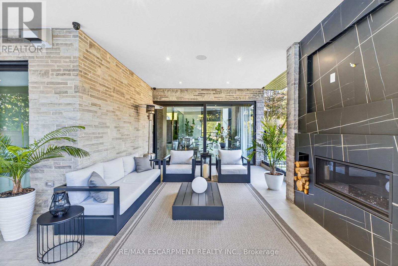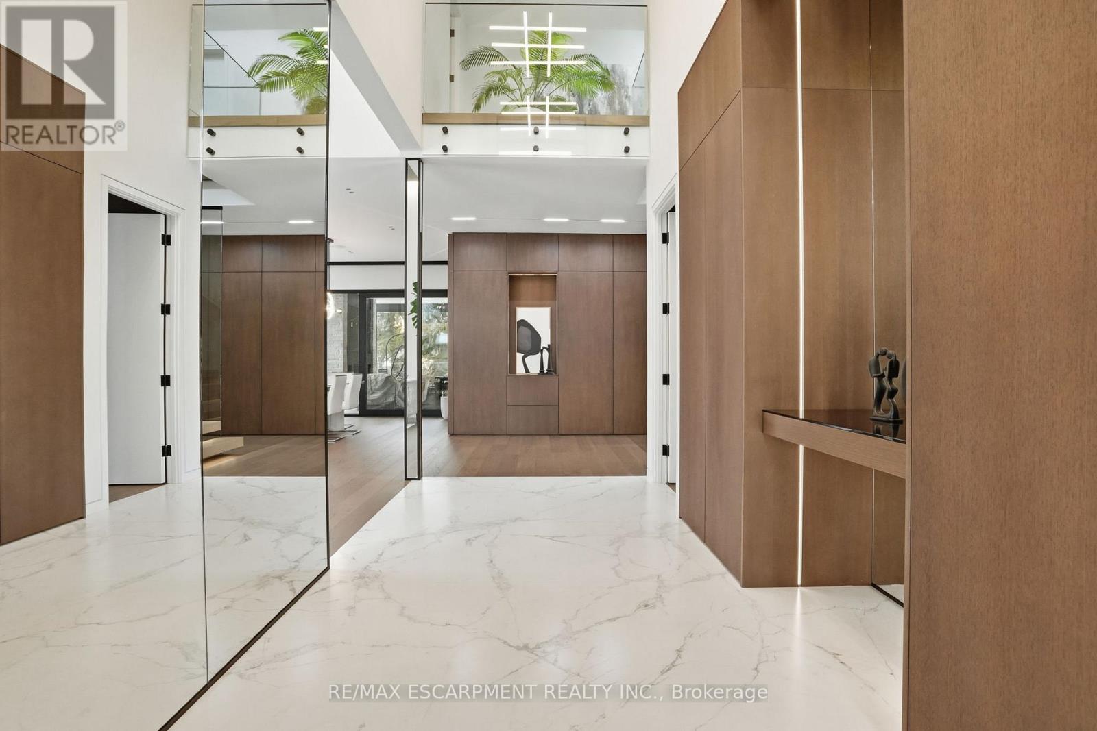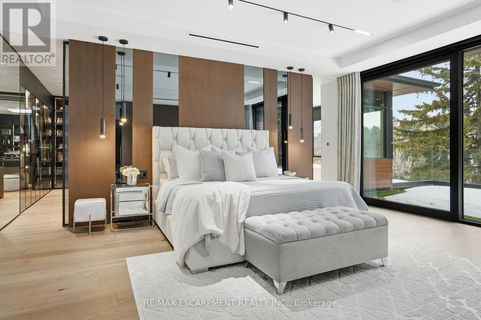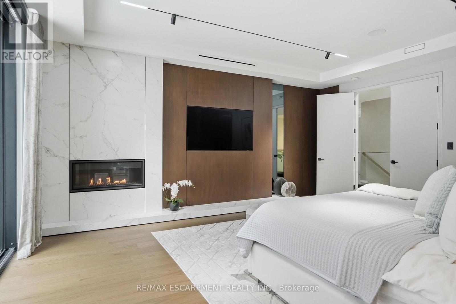 Architectural sophistication meets resort inspired living in this custom modern residence. A striking stone and horizontal façade with oversized black framed windows and glass garage door creates unforgettable curb appeal, surrounded by mature landscaping and clean concrete hardscaping.Inside, a dramatic 20 foot foyer with floor to ceiling glazing and dual statement light fixtures sets the tone. Wide plank hardwood floors, glass railings, custom millwork, and curated finishes flow throughout. The family room is anchored by a bookmatched porcelain slab fireplace wall and expansive sliding doors that seamlessly connect indoor and outdoor living.The chef's kitchen features full height flat panel cabinetry, waterfall island, porcelain slab backsplash, under cabinet lighting, and a premium Miele appliance suite including 5 burner gas cooktop, wall oven, microwave, dishwasher, and wine fridge. A separate butler's pantry adds additional prep space and storage.Upstairs, the primary retreat showcases custom wood millwork, linear fireplace, and a designer walk in closet with smoked glass cabinetry and quartz island under a skylight. The spa inspired ensuite offers slab tile, freestanding tub, double floating vanity, matte black fixtures, and a curbless glass shower. Secondary bedrooms are equally refined with modern ensuites and built ins.The fully finished lower level delivers next level entertaining with a walnut custom bar and waterfall quartz island, theatre lounge with projector and integrated speakers, glass enclosed gym, dry sauna, heated porcelain floors, additional bedroom, and walkout access to the backyard.Outdoors, enjoy a true resort experience with pool, spa, covered lounge, outdoor kitchen, fireplace, and landscaped privacy. High efficiency systems include Lifebreath ventilation, Viessmann boiler with radiant heating, and zoned furnaces with heat pump integration. A rare opportunity for elevated modern living. Luxury Certified. (id:64974)