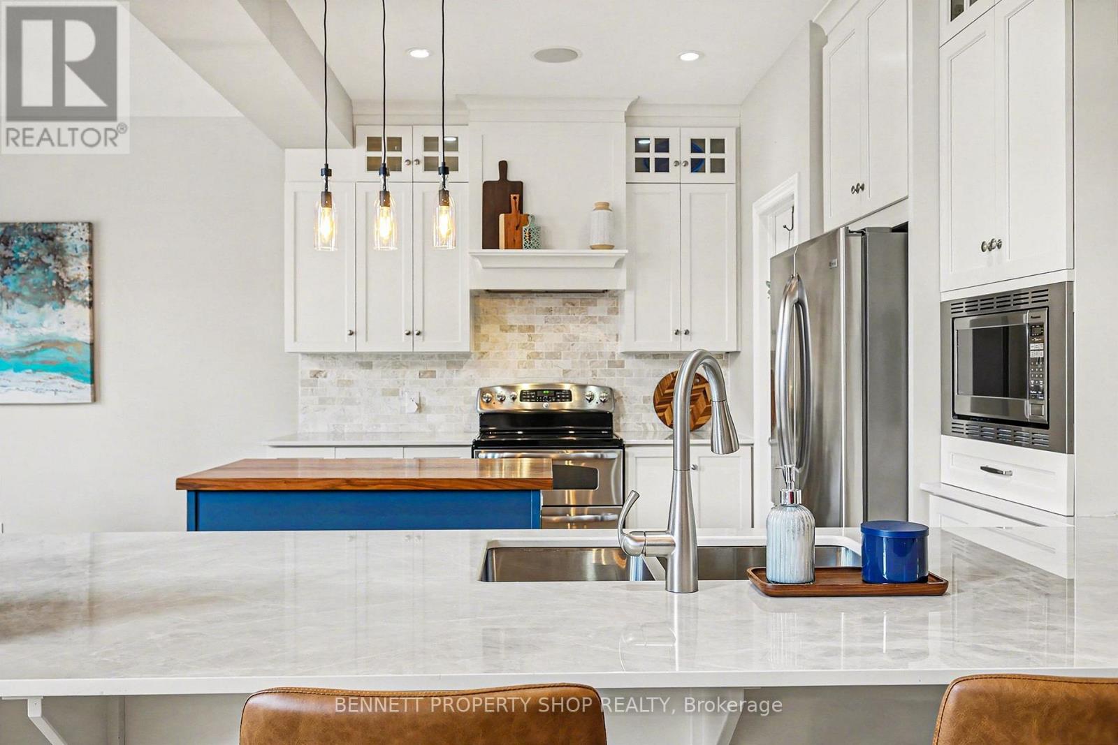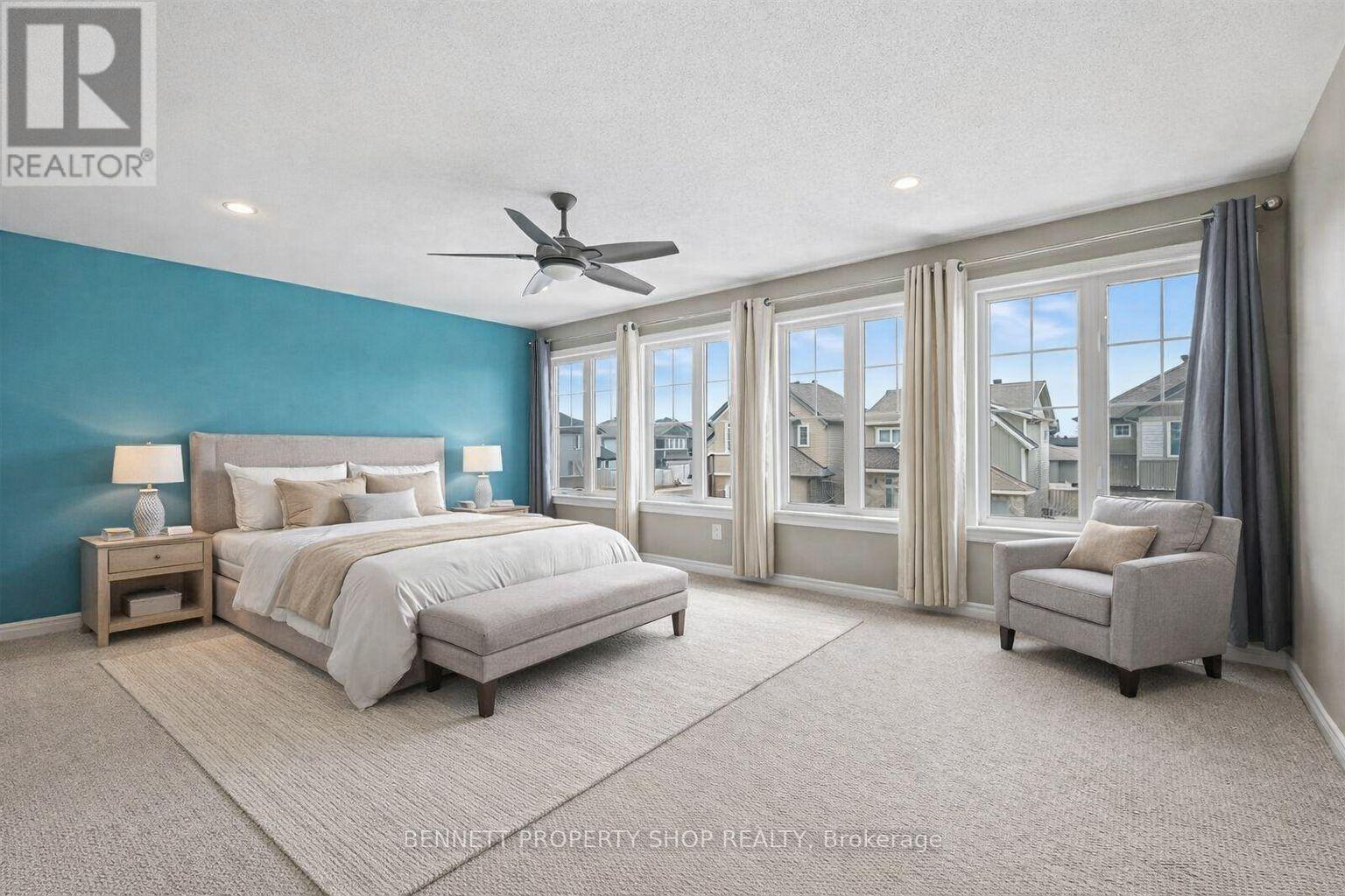 Welcome to this beautifully maintained and extensively upgraded 4-bedroom Cardel home in the highly desirable Blackstone community, ideally located on the Kanata/Stittsville border. Steps to scenic ponds, parks, playgrounds, and walking distance to three new schools, this location offers exceptional convenience and a true family-friendly lifestyle. The popular North Hampton model provides approx. 2,685 sq ft above grade, featuring 9' ceilings, hand-scraped walnut hardwood, and a bright open-concept layout with a spacious great room, gas fireplace, and floor-to-ceiling windows. The showstopping 2024 kitchen renovation includes custom cabinetry, a walk-in pantry, Naturali porcelain countertops by Lamilam, and a striking black walnut island. A main-floor office with French doors and a mudroom with garage access add everyday practicality. Upstairs, enjoy a versatile loft, a laundry room with built-ins, and a generous primary suite with walk-in closet and ensuite. The partially finished basement offers additional space for an office or den. Outside, the fully fenced yard features a deck, gazebo, and in-ground irrigation system, while the front showcases beautiful interlock landscaping for standout curb appeal. A double garage and parking for four complete this exceptional property. Flexible showing times available. Some photos digitally enhanced. (id:64974)