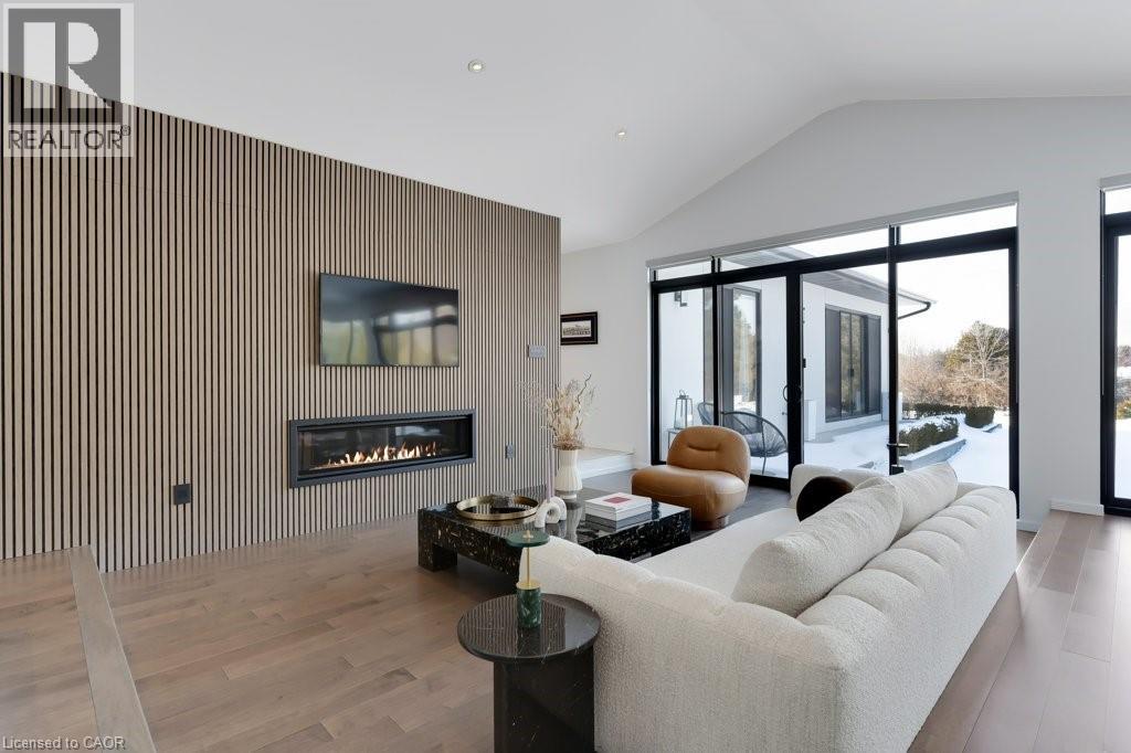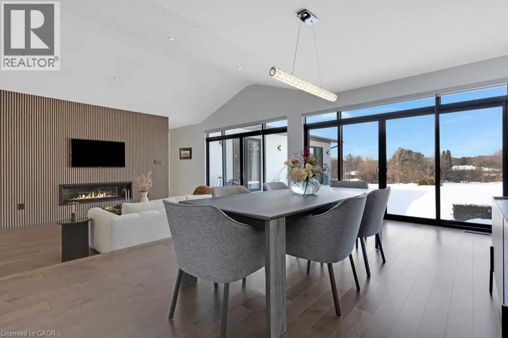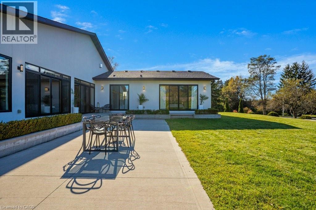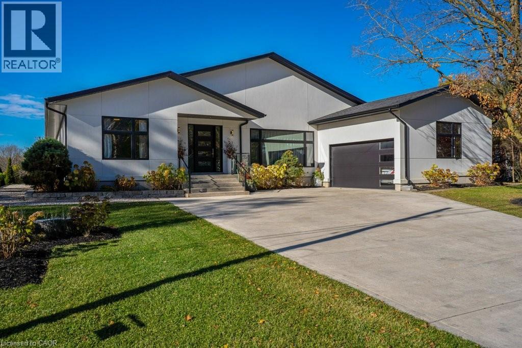 This almost-new custom built bungalow sprawls across 3,551 square feet of high quality craftsmanship. At the front door, you'll feel lured into the spacious great room and conversation pit area, focussing on a cozy gas fireplace mounted on the acoustic wood slat accent wall. Many floor to ceiling windows & large patio doors provide an abundance of sunlight throughout this space. If you love to cook you'll love this amazing kitchen, featuring natural stone counter tops and backsplash, stainless steel appliances, wall to wall pantry storage, and pot lighting overhead. A spacious breakfast area overlooks rear yard. For more formal entertaining, a sizeable dining room is open to the main great room. Adjacent to the kitchen is a spacious laundry room with a combination washer/dryer unit, plenty of storage and drying rack space, and a walk down to a fantastic crawl space below the house for all of your storage needs, approx 5' high. A mud room w/ access to the garage completes this area. The bedroom wing offers four spacious bedrooms: one with an ensuite bath and walk-through closet, and two that share a walk-through closet & 3pc bath. One of these two bedrooms would work well as a quiet den or office space. Lastly, the primary bedroom includes a walk-in closet w/ organizers, a wood-texture accent wall, a walk out to the patio, & a luxurious ensuite bath featuring a soaker tub and glass walk-in shower. A 3pc bath is located off the bedroom corridor which also leads to the patio; perfect for outdoor guests. Finishing off, are two very large walk-in storage rooms. One of these could easily become an office or craft room. Engineered maple flooring is featured in the main living spaces and bedroom areas. A gas connection is located on the patio for a BBQ, and a future pool or hot tub. Floor to ceiling windows throughout are a magnificent feature of this lovely home. Be sure to visit this stunning property, situated on 3/4 of an acre in the quiet village setting of Mannheim. (id:64974)