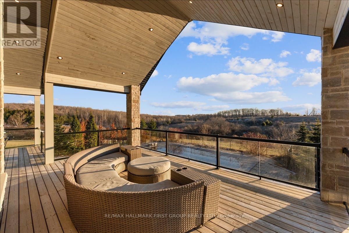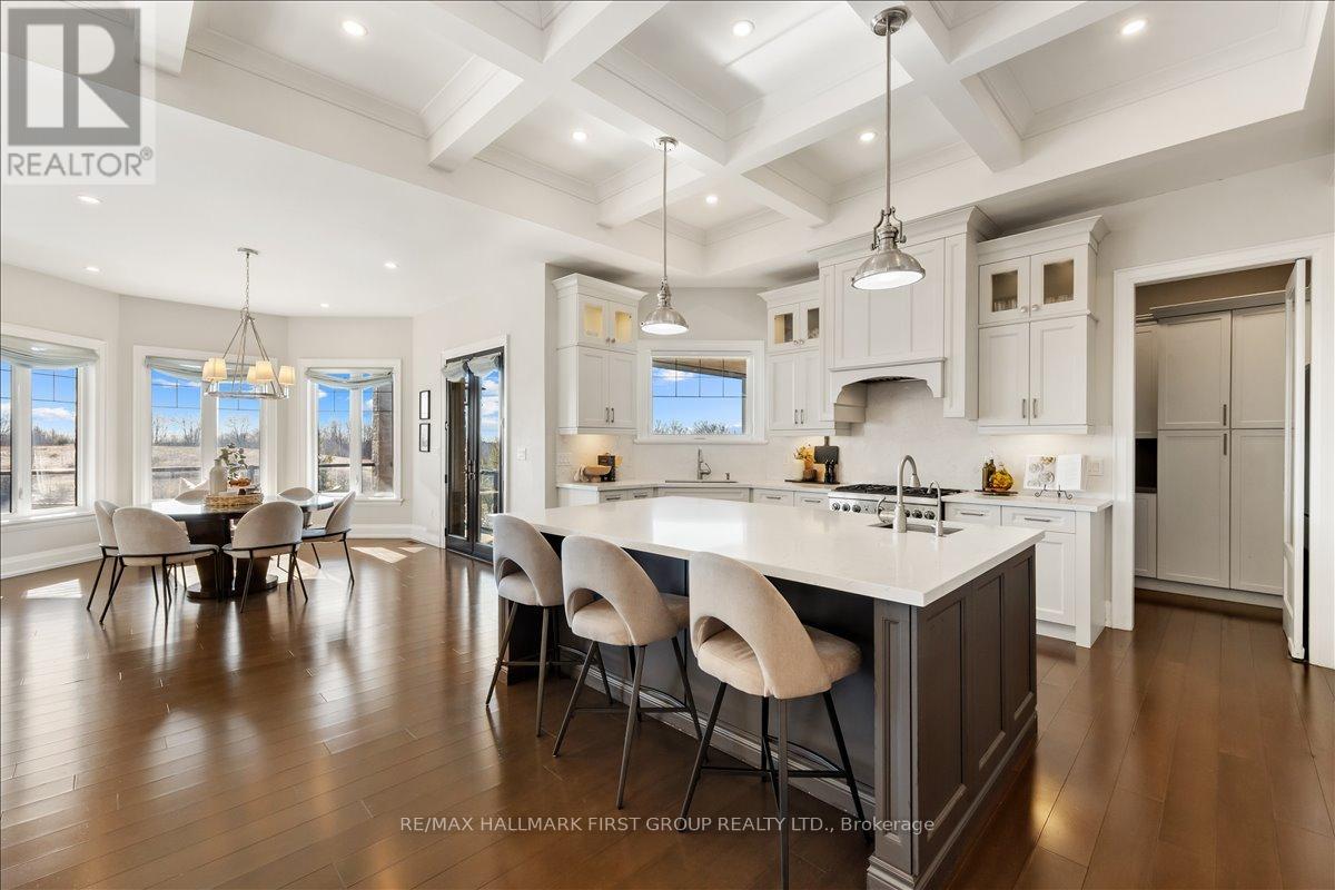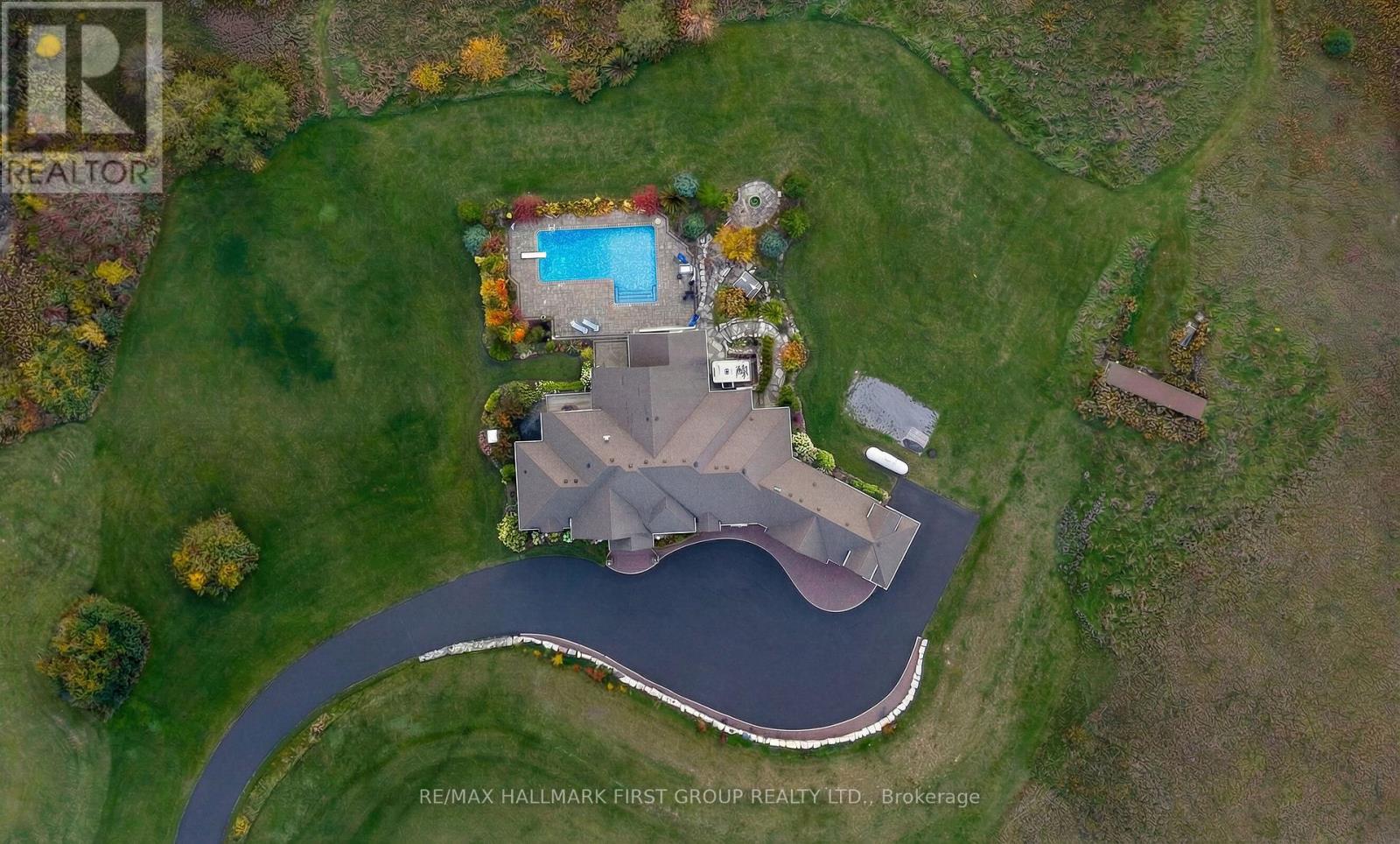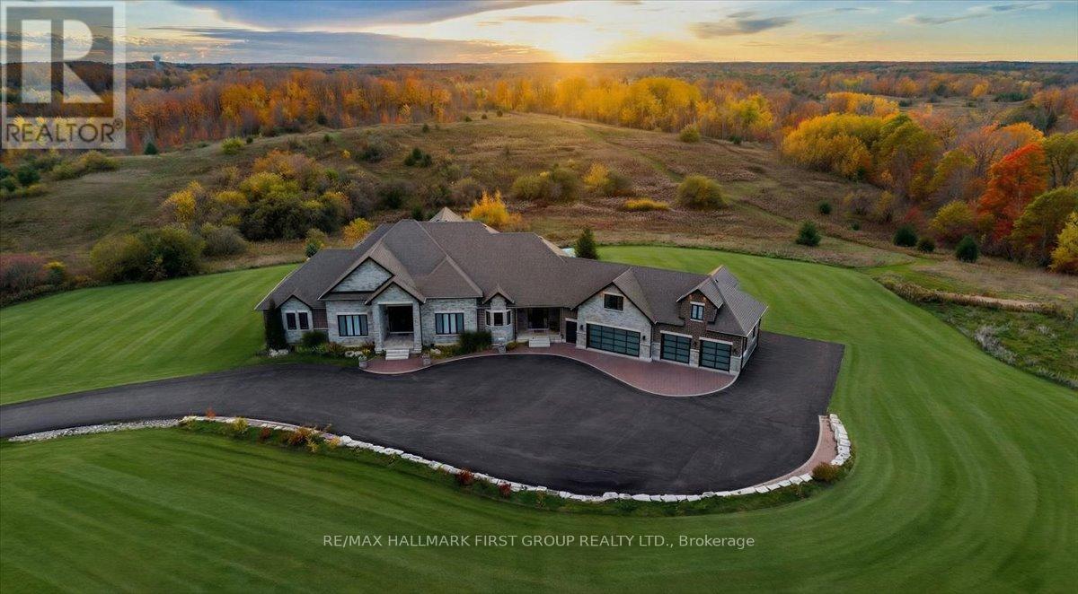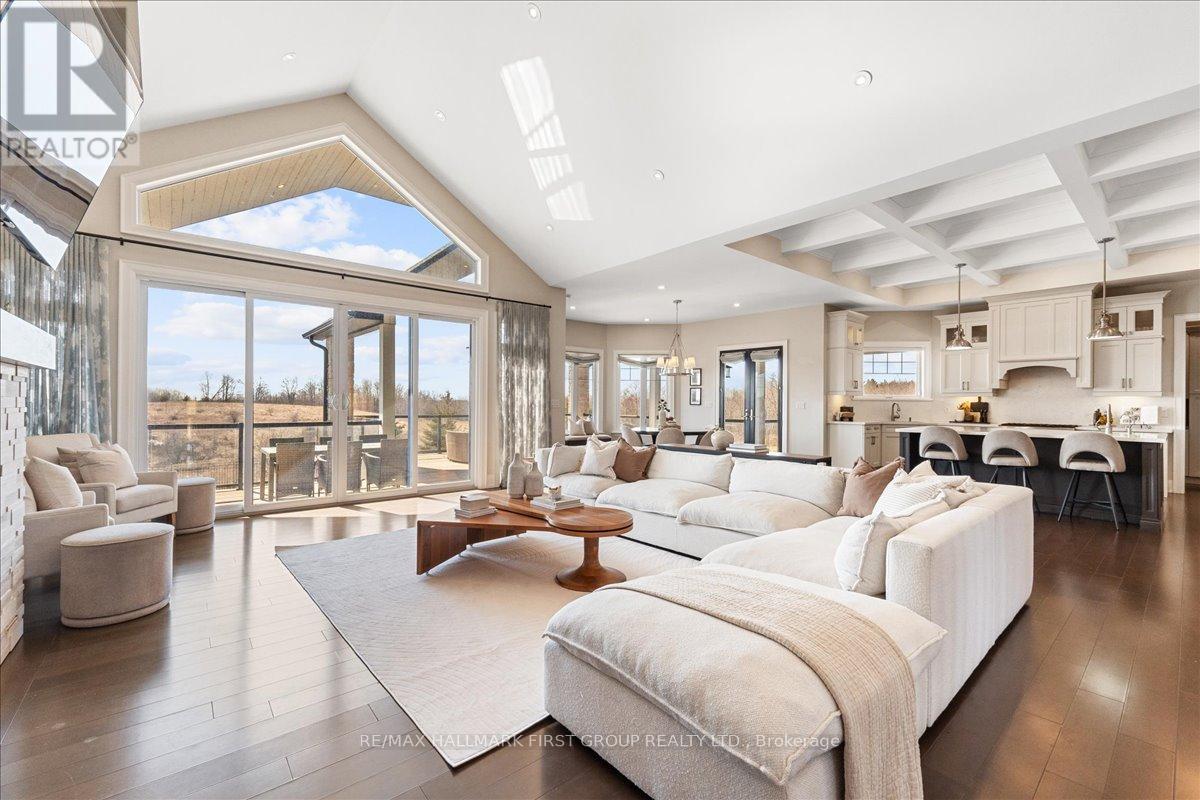 Welcome to 14806 York Durham Line-an extraordinary custom-built stone & brick estate set on a breathtaking 11.3-acre private retreat in Whitchurch-Stouffville. Offering nearly 8,000 sq ft of refined living space, this home showcases exceptional craftsmanship, upscale finishes, and a layout designed for both everyday comfort and grand entertaining. The open-concept great room impresses with soaring vaulted ceilings and a striking 4-ft linear fireplace, while the chef-inspired kitchen features maple cabinetry, stone countertops, a large centre island, premium Thermador professional appliances, and a well-appointed butler's pantry with abundant storage, an additional fridge, and prep sink-perfect for seamless entertaining. The luxurious primary suite is a true sanctuary, complete with coffered ceilings, a spa-like 5-piece ensuite, custom walk-in closet, and a private balcony overlooking the serene grounds. Each additional bedroom is generously sized with its own private ensuite and large closet, offering comfort and privacy for family and guests alike. A versatile loft provides extended living space with potential for multi-generational use, while the walk-out lower level is fully equipped with a theatre room, gym, and bar-perfect for entertaining.Step outside to your own resort-style oasis featuring a saltwater pool, sauna, hot tub, and expansive outdoor living spaces surrounded by nature and complete privacy. Located minutes to Musselman's Lake, Stouffville, Ballantrae, Aurora, Markham, Hwy 404, York Regional Forest, and approximately 40 minutes to Toronto, this property offers the perfect balance of luxury living and convenient access. A professional feasibility report has been completed and will be provided, outlining that the property supports continued use as a luxury estate with potential for additional accessory structures (such as a cabana or pool house), while preserving its natural surroundings and long-term privacy. (id:64974)