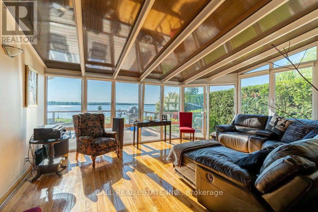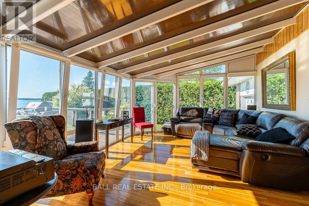 All brick bungalow on a stunning level, landscaped lot facing west for beautiful sunset views across Pigeon Lake! 122ft of armour stone shoreline with armour stone steps into the lake, lovely lakeside firepit and mature cedar privacy hedges. Level entry bungalow with paved drive and attached double garage. Offering 1891sqft of main floor living space with 3 bedrooms, 2 full bathrooms and sunroom with walkout to large lakefront deck. Finished basement offering rec room with wood-inset fireplace, full bathroom, sauna, laundry & storage. Enjoy level living from roadside to lakeside, soaking up sunset views year-round on the beautiful Trent Severn Waterway! (id:64974)