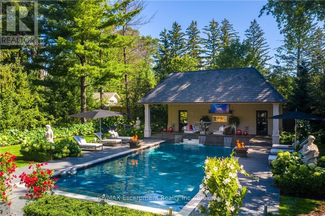 15 Chartwell Rd offers a lifestyle of unparalleled luxury. Drive through the gates & discover the grandeur of this palatial estate. South of Lakeshore,1 door from the lake on a HALF ACRE LOT. Painstakingly curated, the contemporary limestone masterpiece you've been waiting for. Solid iron doors lead to a grand foyer revealing the opulent book matched marble floors. Floor to ceiling wdws & French doors flood the house with light. Cascading waterfalls fank the hall.The Dining Room has statement lighting & servery making hosting a breeze. Soaring 18-ft ceilings & a grand gas f/p are focal points of the Great Room,w/captivating views of the resort style yard. Experience culinary excellence in the black lacquer& glass kitchen by NEFF that features top of the line appliances & a B/I coffee machine & butlers pantry. The intimate Living Room with f/p is the ideal retreat. A main floor office w/built-in cabinetry.2 powder & 2 laundry rooms. The backyard oasis has a gunite pool, waterfalls, fire bowls, covered terrace & outdoor kitchen & f/p.The pool house has a change room,3-pc bath & servery. Towering trees surround the home & are positioned to create privacy. A stone driveway,circular fountain & lush gardens create a breathtaking landscape.Floating marble stairs divide the 3 levels of this home or, you can take the elevator. Skylights make the upstairs airy & bright.The principal suite has nearly 13-ft ceilings, an exquisite 6-piece ensuite & 2 W/I closets. A private balcony overlooks the yard.3 add'l bdrms have 10-ft ceilings,private ensuites & W/I closets. The LL caters to all family members. A 5th bdrm/ensuite makes an ideal guest suite.Gym,R/I Golf Simulator,home theatre,Wine Cellar& doggie Spa. The Games & Rec Rooms have a 2nd kitchen & W/O.Heated garage,baths &LL flrs.Automation. Designed by Bill Hicks & features the artistic creativity of the KT Design Group. Located on Oakville's Street of Dreams, this is an iconic living space designed to impress!LUXURY CERTIFIED (id:64974)