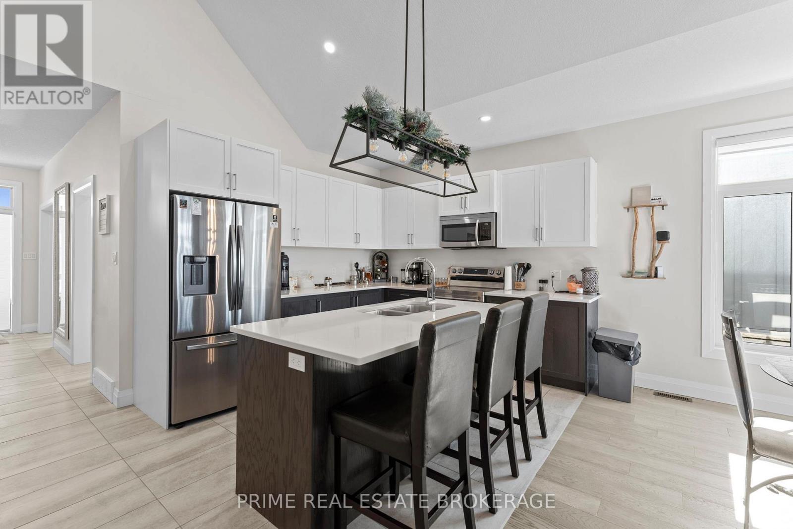 Welcome to 15 Compass Trail; an exceptional detached home in the highly sought-after Landings community of Port Stanley. Thoughtfully designed and beautifully finished, this 1-bedroom plus den, 2-bath residence offers effortless main-floor living in one of Ontario's most desirable lakeside destinations. From the moment you step inside, the vaulted ceilings and expansive windows create a bright, airy atmosphere that feels both refined and relaxed, perfectly aligned with Port Stanley's coastal character. The open-concept layout flows seamlessly, making the space ideal for entertaining or simply enjoying quiet mornings at home.The kitchen is a true focal point, featuring quartz countertops, stainless steel appliances and a generous island that anchors the space, equal parts functional and inviting. Whether hosting friends after a day at the beach or enjoying a quiet evening in, the design supports both lifestyle and comfort. The primary bedroom offers a spacious walk-in closet and well-appointed ensuite bath. A versatile den provides flexibility for a home office, guest space, or additional lounge area and a second full bathroom adds convenience for visitors. Enjoy a peaceful ravine backdrop with mature trees offering added privacy and a scenic setting for outdoor relaxation. The low-maintenance design makes this property ideal for downsizers, professionals, or those seeking a refined year-round home or weekend retreat. Located just minutes from beaches, walking trails, parks, and Port Stanley's vibrant waterfront. Easy access to London and Highway 401 makes commuting simple while still enjoying small-town charm. (id:64974)