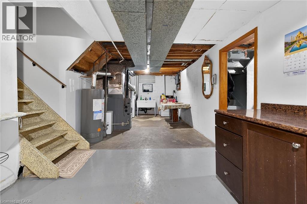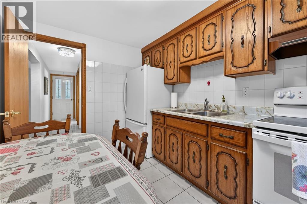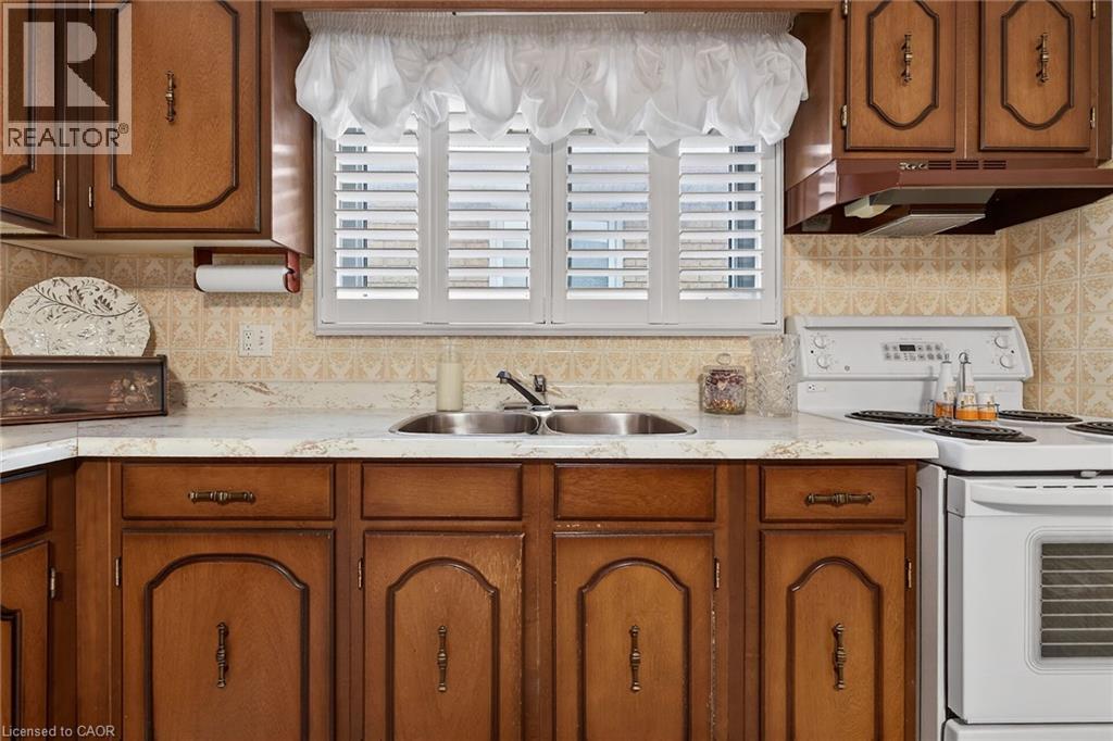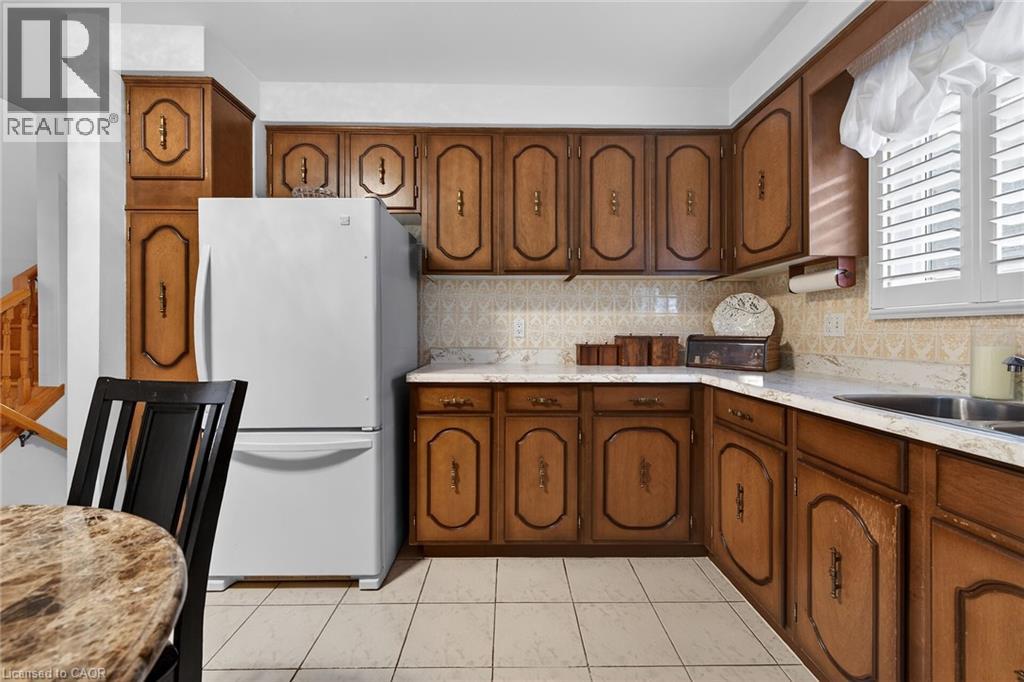 Lovingly maintained all-brick 4-level backsplit offering approximately 1,900 sq ft of above-grade living space. A bright covered front porch welcomes you into a spacious, well-kept foyer. The main level features a sun-filled living room, separate dining area, and an eat-in kitchen—ideal for family living and entertaining. Hardwood stairs lead to the second level with three bedrooms, all featuring hardwood flooring and California shutters. The main 5-piece bath includes double sinks and tiled finishes for easy maintenance. The lower level offers excellent flexibility with a second kitchen, 3-piece bath, and a generous living area—currently used as a dining and family room. An entertainers delight! A separate side entrance and sliding doors provide walk-out access to the fully fenced backyard with a vegetable garden. The basement includes ample workspace, multiple storage rooms, a large cold room (cantina), an additional 1-piece bath, and a walk-up to the garage. There is also a crawl space for added storage. No carpets and California shutters! Attached garage with inside entry to both the main floor and basement, plus a 4-car concrete driveway. Conveniently located close to shopping,restaurants, public transit, highway access, and the new GO station. (id:64974)