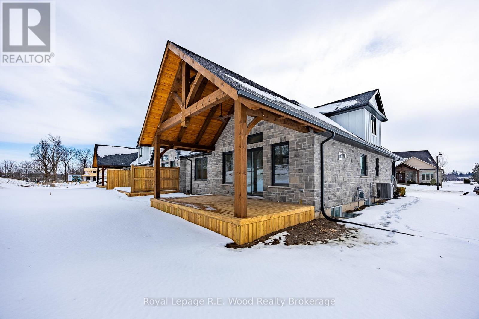Welcome to The Bridges Estates at the Bridges Golf Course, Tillsonburg's premier new development by TDI New Homes, where modern craftsmanship meets timeless elegance in this stunning new construction freehold end unit townhome. Entering this over 2000 sq. ft. home, a grand two-storey foyer welcomes you into a flexible den/bedroom/office, perfectly suited for today's evolving lifestyles. The open-concept kitchen, dining, and living area is ideal for entertaining, highlighted by vaulted ceilings, a striking stacked-stone fireplace with warm wood accents, and solid-surface countertops throughout. The main-floor primary suite is a private retreat, featuring a walk-in closet, freestanding tub, and tiled glass-door shower. Everyday convenience is enhanced by a mudroom/laundry with direct garage access, while the bright, spacious unfinished basement offers endless potential for future living space. Outside, the modern Craftsman exterior showcases neutral stone and rich wood finishes. A large covered deck with post-and-beam construction creates the perfect outdoor escape. Complete with a true two-car garage, this home seamlessly blends luxury, comfort, and practicality in an unbeatable location. (id:64974)