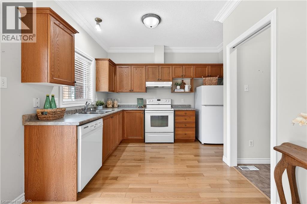 FREEHOLD, NO CONDO FEES NO BOARD FEES! Why buy a condo when you can own this ONE OF A KIND townhome bungalow. This bright and stylish open-concept home features 9 ft ceilings, hardwood and ceramic flooring, and a functional layout designed for empty nesters for first time home buyers. The main floor offers a spacious primary bedroom with walk in closet, 4 pc bathroom, and convenient main floor laundry just off the kitchen. An inviting, spacious and bright living and dining area that allows plenty of room for family get togethers. The eat in kitchen overlooks the private fenced backyard with sliding doors leading to a covered porch/deck, the perfect spot to enjoy your morning coffee or relax outdoors. The large unfinished basement will surprise you with the amount of space it has. With two cold rooms under the front a back porches that is not often found. It offers incredible potential to create your own design that can easily accommodate a 3pc bath( roughed in), 1- 2 more bedrooms and a recroom if needed. . Appealing front curb appeal with stone and brick, attached single-car garage with insulated garage door and inside access from the garage. Located in a prime Cambridge location within walking distance to Cambridge Centre grocery stores and public transit. Quick access to Highway 401, making commuting and everyday amenities incredibly convenient. (id:64974)