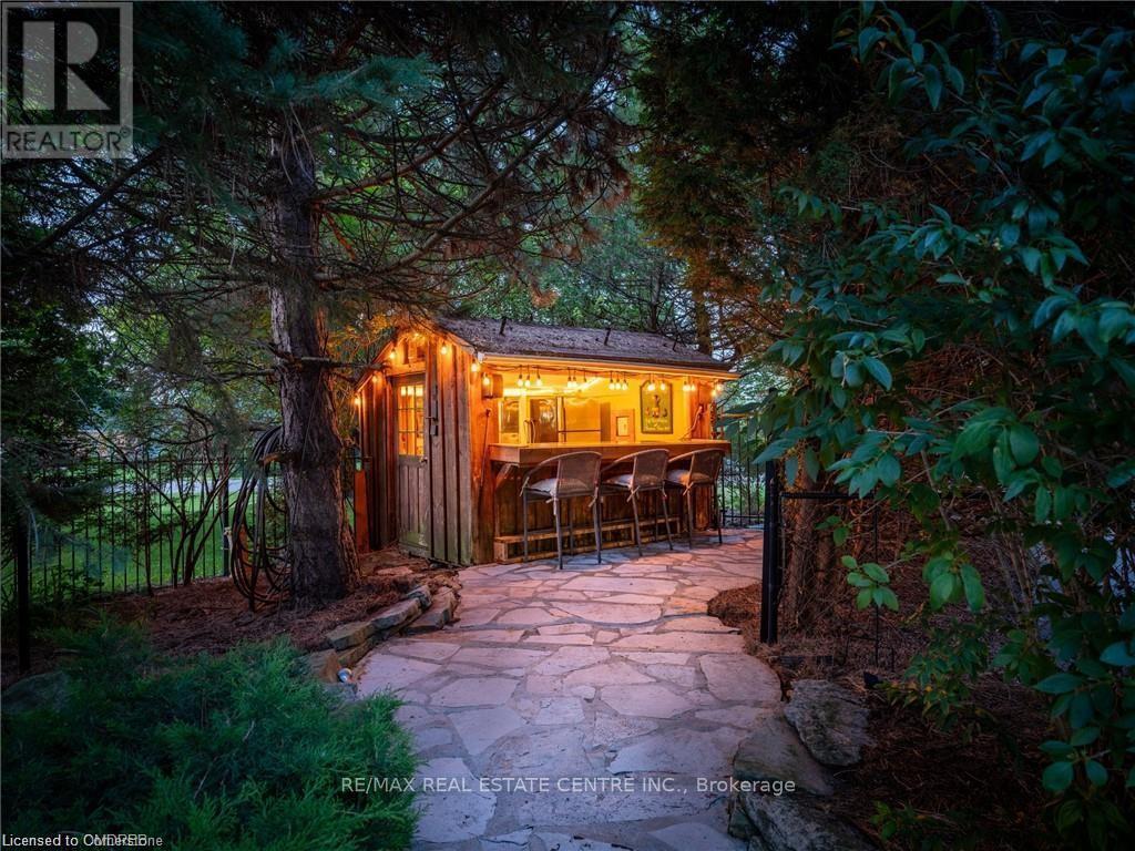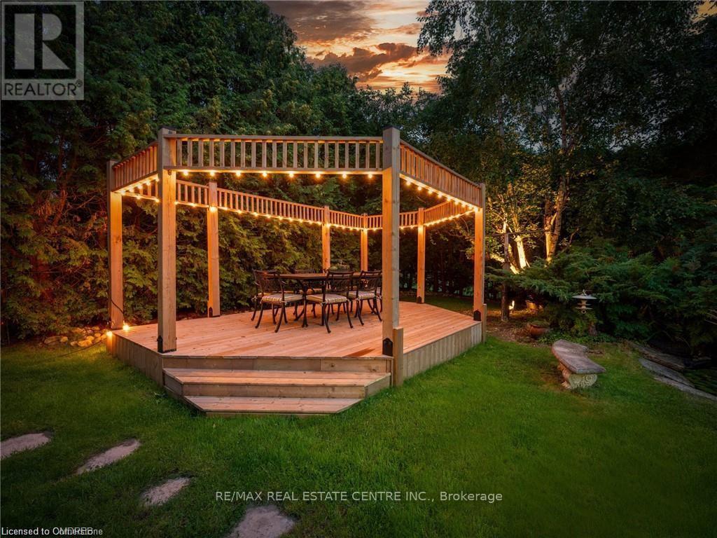 Welcome to this ULTRA-PRIVATE SECRET GARDEN - A Rare Executive Country Estate Property backing onto Blue Springs Golf Club (Home of PGA Canada) w/ the most stunning yard that will rival any luxury resort. This prestigious all-brick home features open concept living + fully finished basement. It is nestled on a stunning 1.38-ACRE LOT (including a beautiful side lot for added privacy) in a quiet enclave of distinguished executive homes. There is a sense of space as you enter the grand foyer w/ its 9' ceilings and curved staircase. The heart of this home is the gourmet EI kitchen which overlooks the WO to the stunning yard and living room w/ vaulted ceiling, fireplace and additional WO to the yard. There is a main level office located off the front entrance and convenient main level laundry w/ tub. The upper floor has 3 generous bedrooms (there were 4 - can easily convert back), one being the primary bedroom w/ his/her closets and 5-pc ensuite. The basement features an over-sized 4th bedroom, RI for bathroom, a 2nd office, gym, family room and workshop. The dream yard will take your breath away and includes a pavilion for dining al fresco, heated pool, koi pond w/ waterfall, golf-themed bar, screened-in pergola, extensive hardscaping (2000+ SF of flagstone installed on 3 of concrete for stability) and professional low-maintenance landscaping - the ultimate space for entertaining. Additional features: 3-car garage, parking for 10+ in the driveway, garage entry to home, replaced exterior doors, no rentals, energy efficient gas pool heater (2018), new pool liner and cover (2025), furnace (2017), well pump (2024); water softener, UV system, HWT all owned; all windows replaced and home re-insulated, extensive UG sprinklers (including side lot), 12 x 16 double-sided pine Mennonite-built shed. Peaceful location close to golf, trails, lake, 15 minutes to 401. This is your opportunity to finally make a luxury move to the country. Thank You for showing our listing! (id:64974)