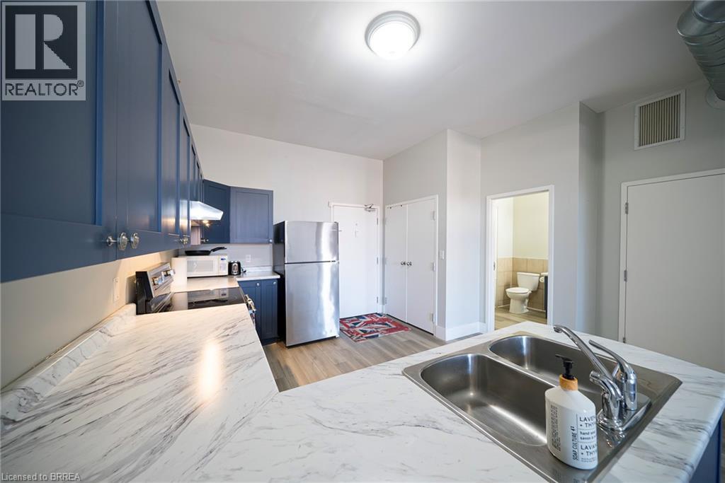 Welcome to 150 Colborne Street, Unit 407 — Downtown Brantford Living at Its Best! Step into style, comfort, and convenience with this fully renovated, loft-style 1-bedroom, 1-bathroom condo, ideally situated in the heart of downtown Brantford, directly overlooking vibrant Harmony Square. Whether you're a first-time buyer, investor, or student, this stunning unit offers an unbeatable combination of modern living and prime location. Boasting high ceilings, a spacious private balcony, and sophisticated finishes throughout, this unit is designed to impress. The kitchen is a true showstopper, featuring rich navy cabinetry, ample storage and counter space, and stainless steel appliances — perfect for home chefs and entertainers alike. The open-concept layout seamlessly connects the kitchen, dining, and living areas, making entertaining both effortless and elegant. Step through French doors to your oversized balcony, large enough to accommodate outdoor dining or a cozy lounge setup — the perfect space to unwind while enjoying views of Harmony Square and all its seasonal events. The bright and airy bedroom is bathed in natural light thanks to a charming arched window and includes a generous closet. The updated 4-piece bathroom continues the modern aesthetic with stylish finishes and thoughtful design. Additional features include coin-operated laundry facilities conveniently located within the building, eliminating the need for off-site trips. The air conditioner was replaced in 2024. Location is everything — and this property delivers. Just steps from Wilfrid Laurier University’s Brantford campus, the Conestoga College campus, and the new YMCA/Laurier Recreation Complex, this condo is ideal for students or as a smart investment opportunity. With countless restaurants, cafes, shops, and year-round festivals right outside your door, you'll be at the centre of it all. Amazing opportunity to own a piece of one of Brantford’s most dynamic and walkable neighbourhoods. (id:64974)