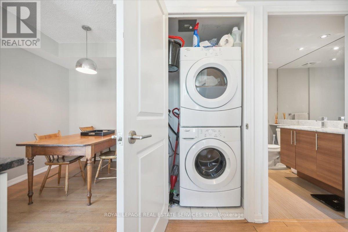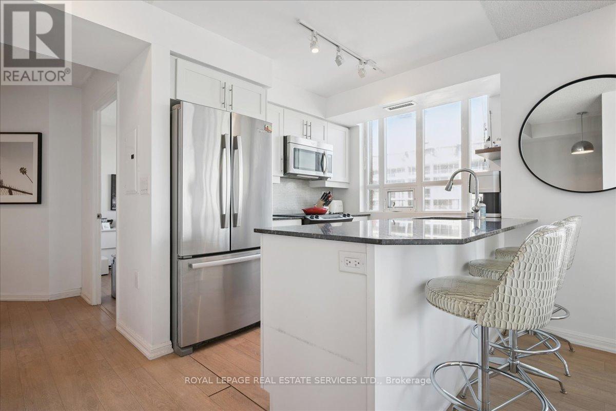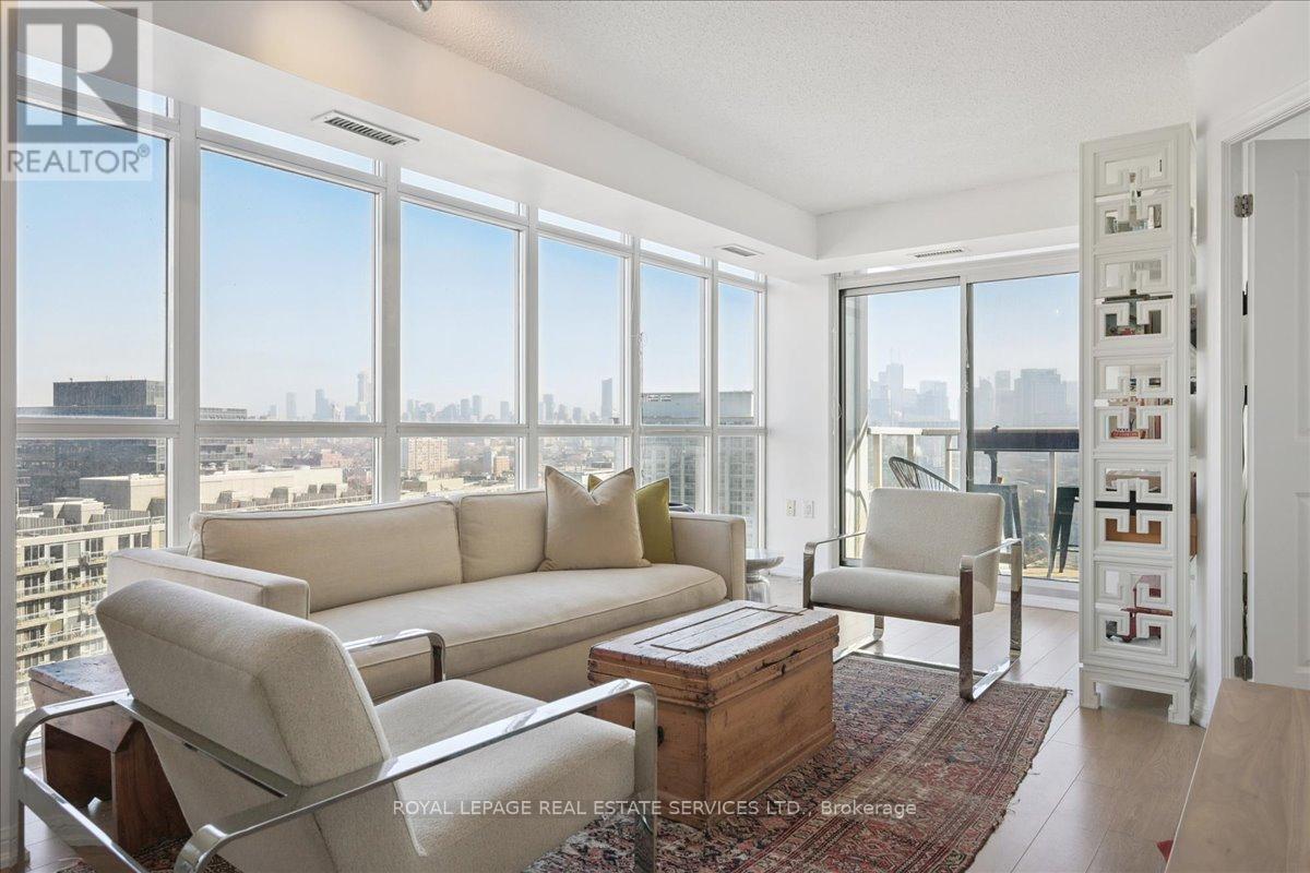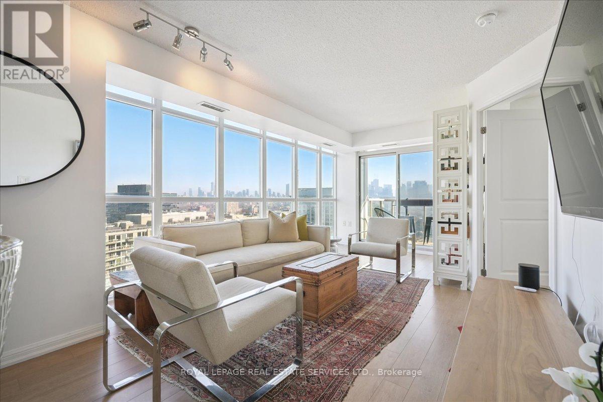 The coveted "02" unit at 125 WB, just in time for spring! Luxury meets functionality in a highly sought-after building, this stunning unit boasts panoramic million $ views of the city's iconic skyline + CN Tower (unique only to these units), offering a front-row seat to the vibrant energy of Liberty Village. Bright, open-concept living space with floor-to-ceiling windows. Sleek, modern kitchen features stainless steel appliances, a FULL-SIZED fridge, granite countertops, and a spacious island perfect for entertaining. The expansive living and dining area seamlessly flow together, offering ample space for relaxation and hosting guests, all while taking in the stunning views of the city. Private balcony provides the perfect outdoor retreat to unwind after a busy day. The primary bedroom is complete with custom closet organizers and a luxurious ensuite bathroom. The second bedroom is generously sized, with ample closet space and a second full bathroom conveniently located. The den is ideal for a home office, library, nursery or even a cozy reading nook. With direct access to premium amenities such as a fitness center, party & media room and 24-hour concierge service to provide the utmost convenience. King St right outside your door. Custom closet organizers in each closet. This condo is just steps away from trendy shops, restaurants, cafes, and public transit, offering the perfect balance of city living and comfort. (id:64974)