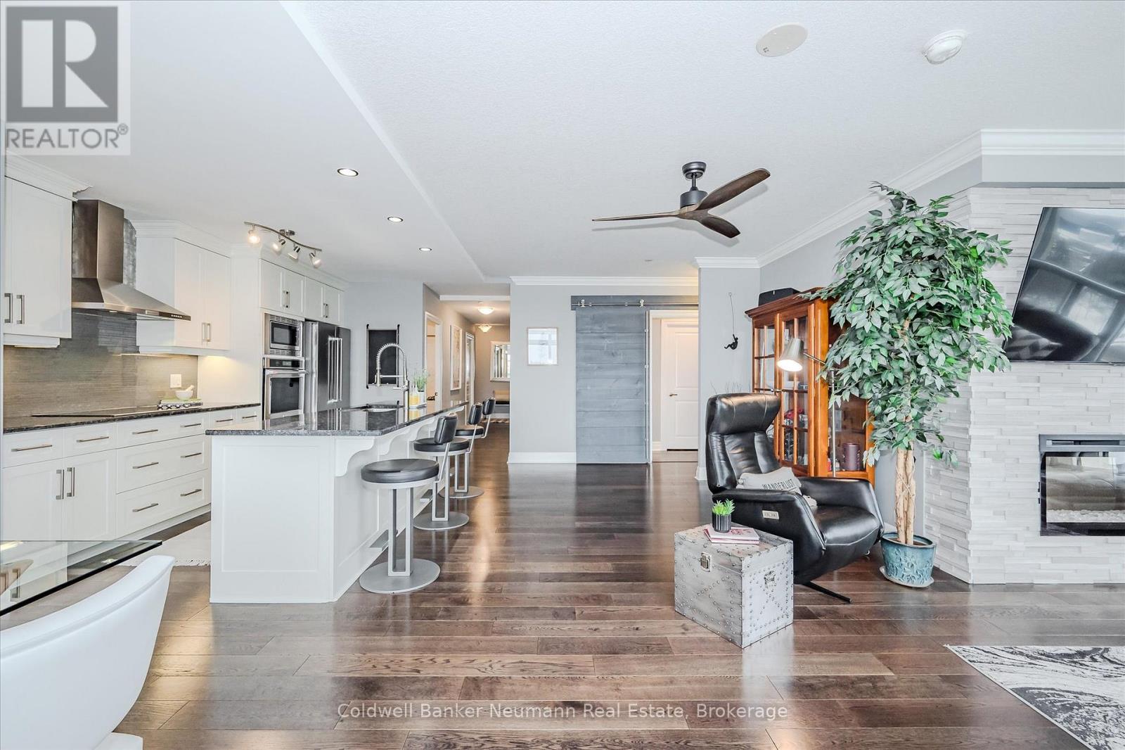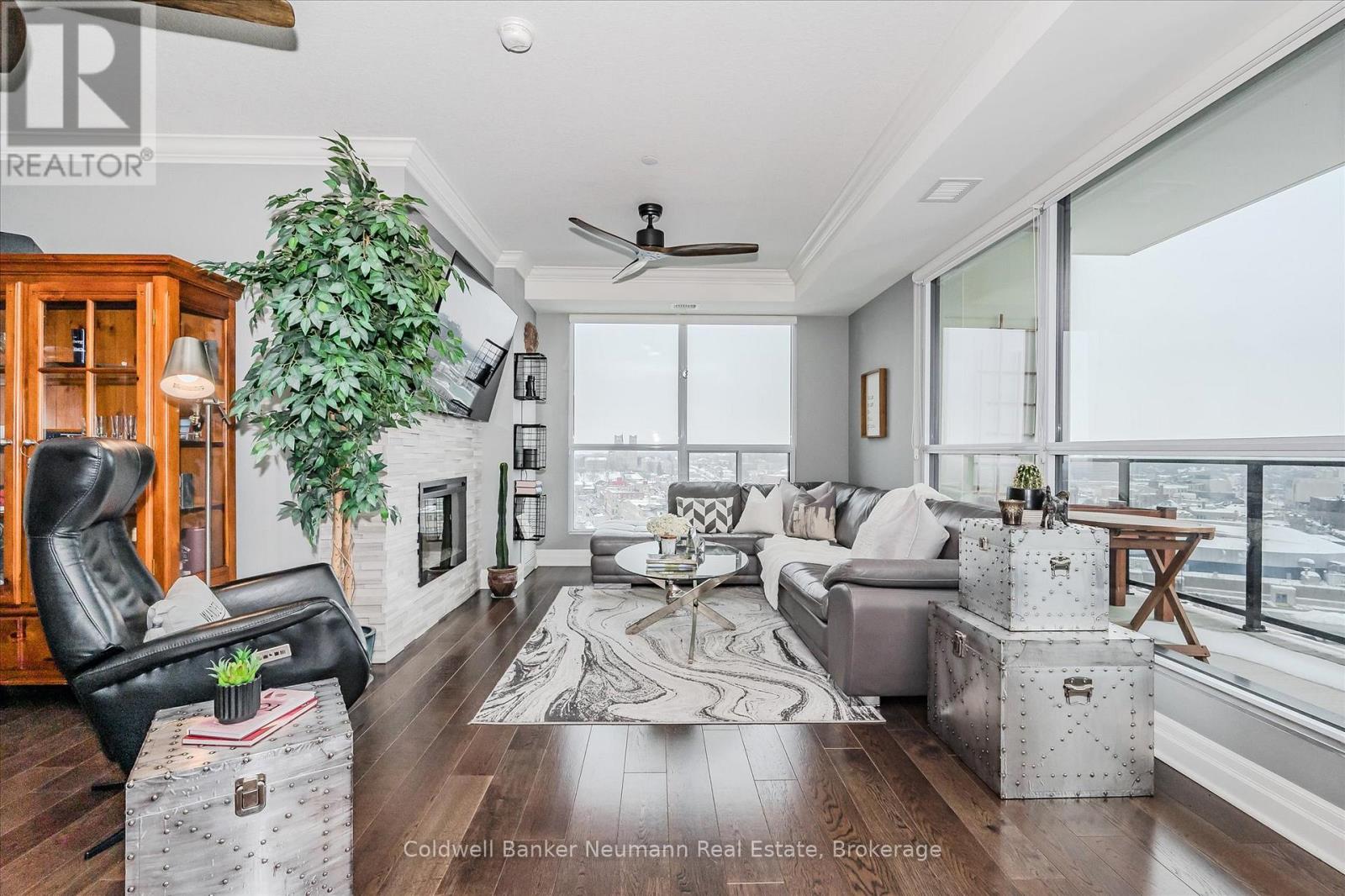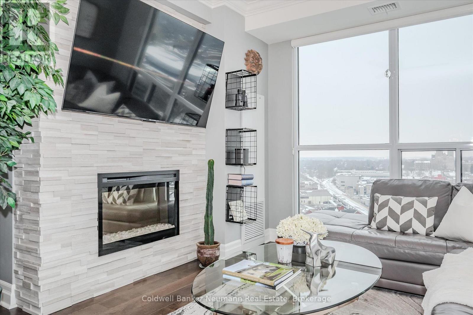 Spectacular Corner Suite with Panoramic Views & Unforgettable Sunsets Perched high above the city, this west-facing corner unit is flooded with natural light, with expansive windows showcasing sweeping views of downtown Guelph and breathtaking golden sunsets each evening. Its premium corner position and refined finishes create a bright, elevated living experience rarely offered. Proudly owned by the original purchasers, this home features thoughtful upgrades throughout. The chef-inspired kitchen is appointed with penthouse-level cabinetry, granite countertops, and flows seamlessly into the open-concept living and dining area-complete with a cozy fireplace perfectly positioned to enjoy the skyline. The spacious primary retreat includes a walk-in closet and a well-appointed ensuite with double sinks and a glass walk-in shower. A versatile second bedroom with a built-in Murphy bed easily adapts for guests or a home office, while the second full bathroom features an upgraded deep soaker tub. Located just steps from the GO Station, restaurants, boutiques, the Sleeman Centre, and everything downtown Guelph has to offer, this home is ideal for downsizers, professionals, or commuters seeking convenience without compromise. Residents also enjoy access to premium building amenities including a fitness centre, party room, guest suite, and rooftop terrace. Complete with two tandem underground parking spaces, this is a rare opportunity to own a bright, spacious corner suite in one of downtown Guelph's most sought-after buildings-and currently one of the best values in its size and calibre. (id:64974)