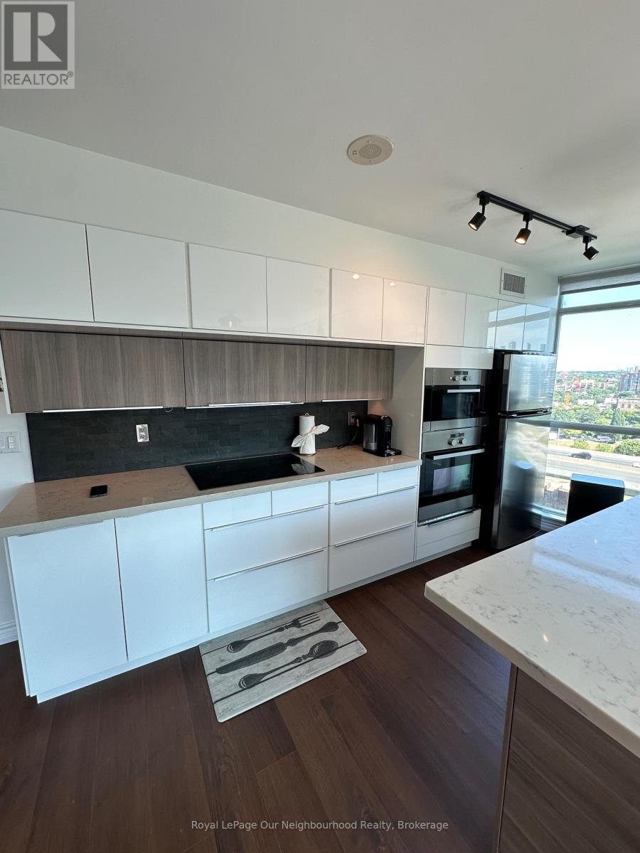 Exceptionally bright & very spacious 2Bdrm/2Bth corner unit. Imagine entertaining in the renovated chef's kitchen With open concept layout, views of the CN Tower, skyline, and out over Fort York, as well as a partial view of the lake/Billy Bishop airport! Plenty of storage. Engineered hardwood floors in the bedrooms, luxury vinyl plank (newer) in the living/dining/kitchen spaces,, no carpeting. Updated bathrooms, 2nd bathroom with stand up shower. Popcorn ceilings have been removed for a more modern look. Walk out to the private balcony with North East views of the city skyline, CN Tower and Fort York. Custom 2 Layer Solar Shades And Blackout Shades For Privacy. 2nd Bdrm is spacious, perfect for use as an office or bedroom with a closet and floor to ceiling windows. Thousands Spent On Renovations, living space floors and Kitchen backsplash also recently redone, as well as newer, large size washer and dryer. Be part of this central but peaceful Fort York Neighborhood! Close To Parks, Trails, Grocery shopping And Entertainment spaces like the Bentway and Stackt. Pictures from previous listing. Includes 1 Parking Spot. (id:64974)