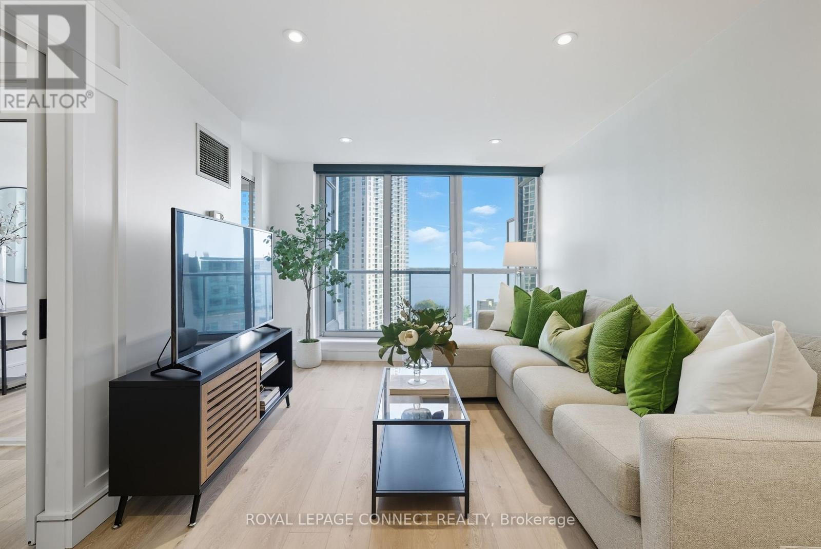 Experience true luxury waterfront living with unobstructed south facing views of Lake Ontario and the marina, a breathtaking backdrop that floods this condo with natural light and tranquility. Inside, the fully renovated residence showcases a custom designed kitchen with quartz waterfall countertops, an oversized island ideal for entertaining, designer fixtures, and premium finishes throughout. Custom built in cabinetry maximizes storage, while smooth ceilings, accent walls, and pot lights add modern sophistication. Spa inspired bathrooms are finished with elegant details. Perfectly located just steps from the PATH, GO Train, and TTC, and within walking distance of the Financial and Entertainment Districts, this home combines urban convenience with the beauty of lakefront living. A rare opportunity to own a refined, upgraded condo in one of downtown Toronto's most desirable locations, where every day begins and ends with iconic waterfront views. (id:64974)