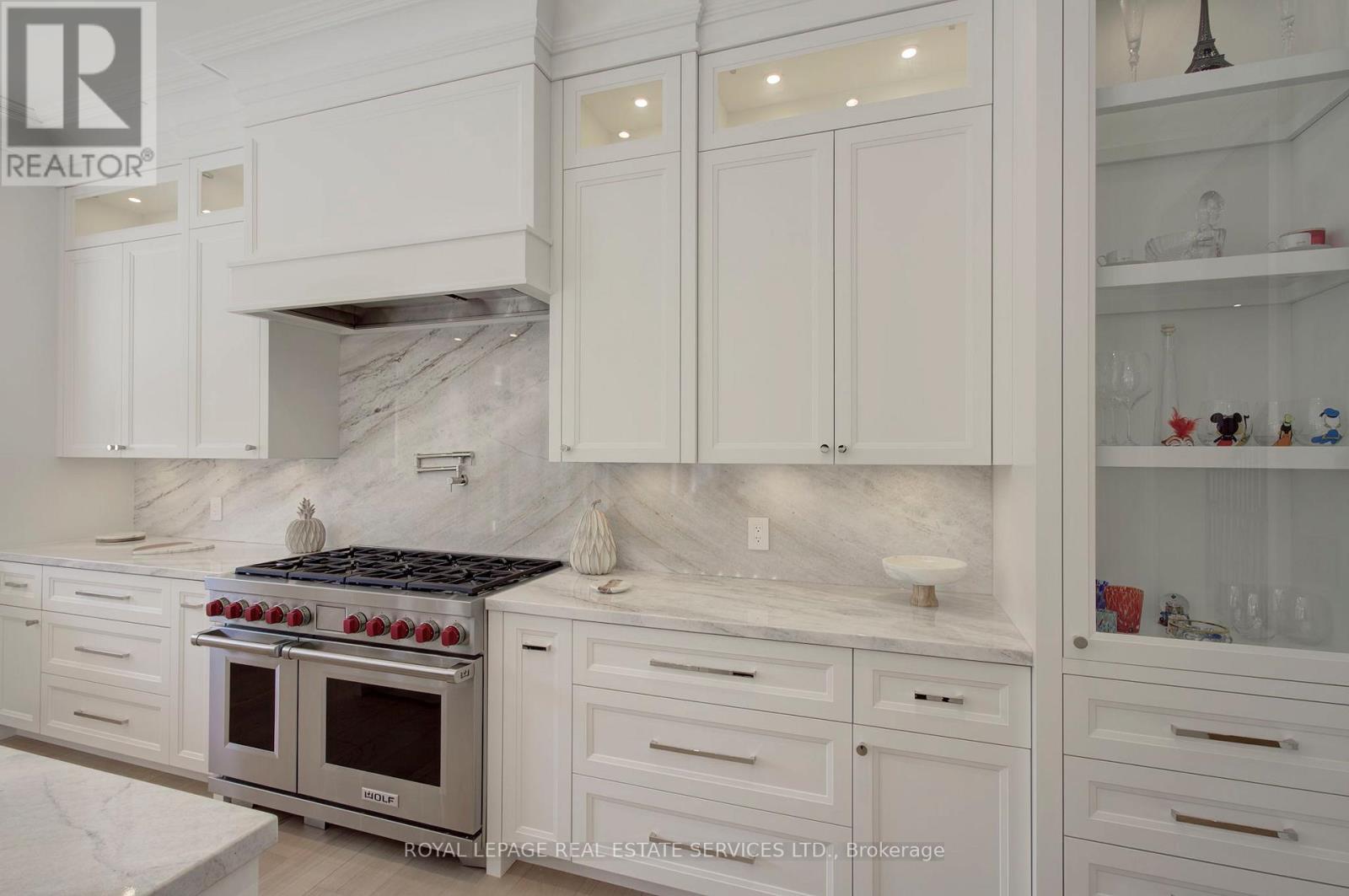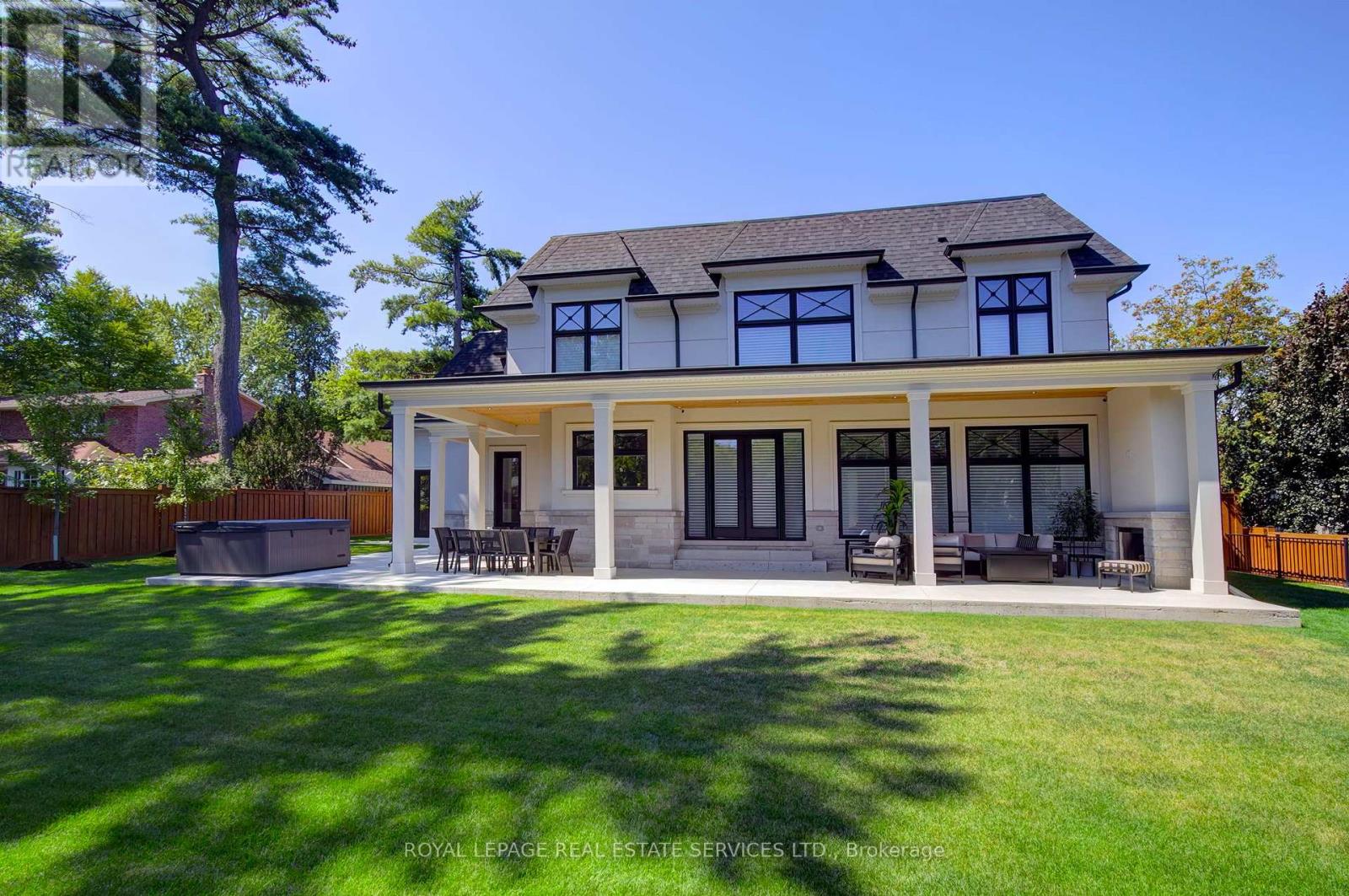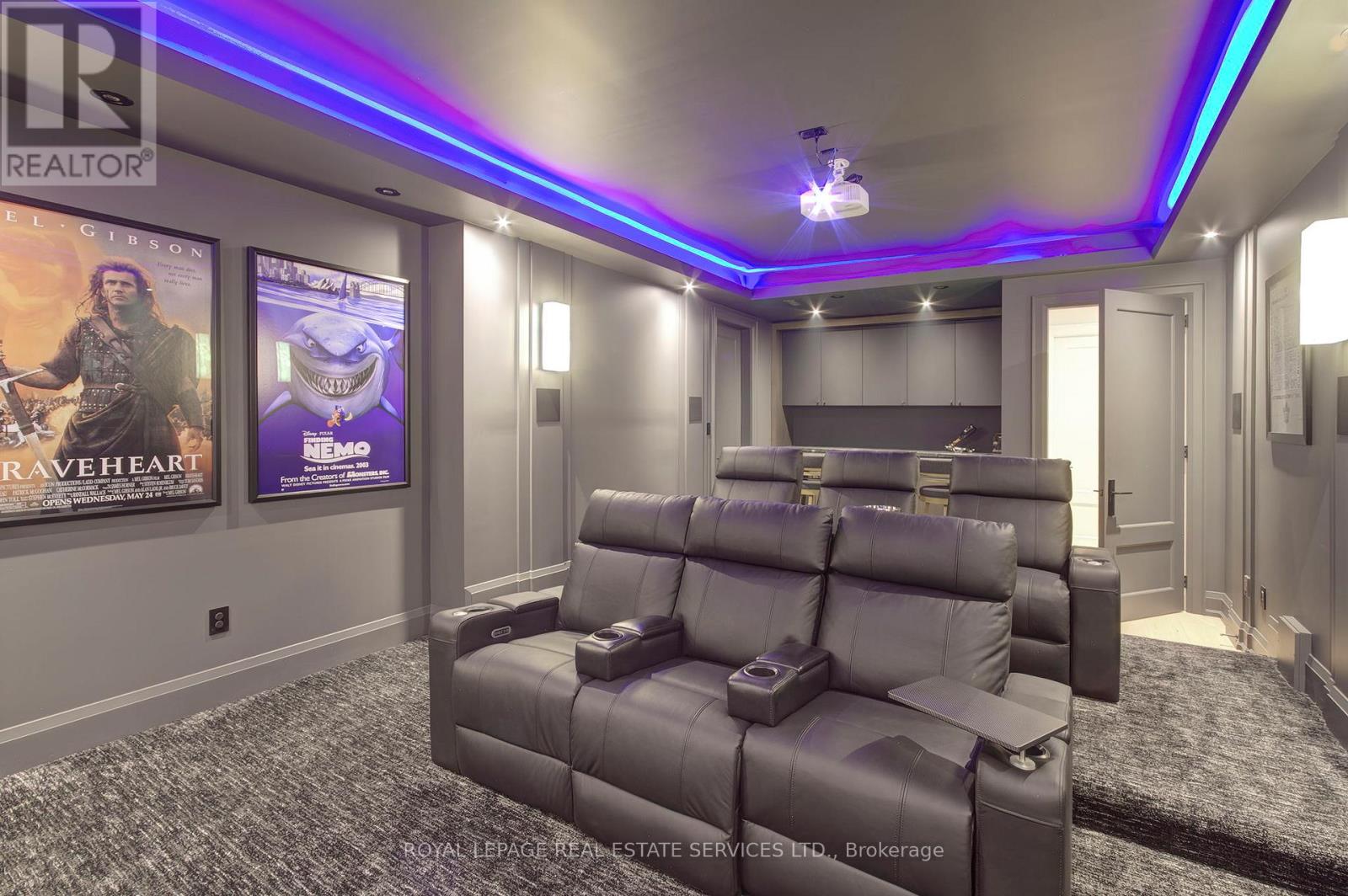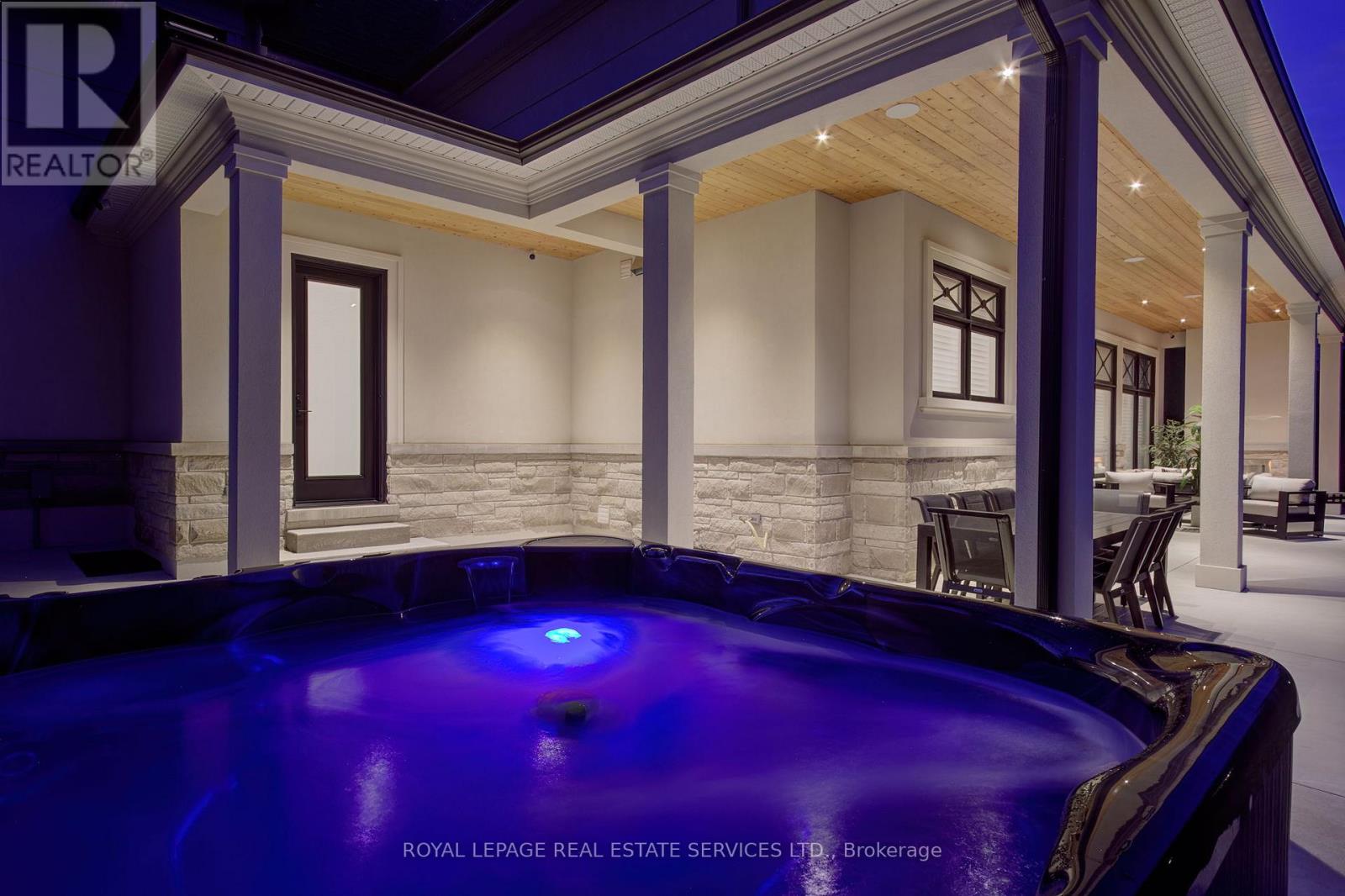 Welcome to 1504 Warren Dr., a spectacular custom-built residence in the heart of Oakville offering approximately 6,300 sq.ft. of luxurious living across three beautifully finished levels. Perfectly positioned on a premium 100 x 150 ft lot, this exceptional home blends timeless elegance, master craftsmanship, and sophisticated smart-home technology. The professionally landscaped grounds create a private outdoor oasis featuring LED nightscape lighting, Wi-Fi controlled irrigation, and a fully fenced backyard retreat. Enjoy effortless entertaining beneath the expansive covered porch with a gas fireplace, natural gas BBQ line, and a Beachcomber hot tub complete with waterfalls, jets, speakers and ambient lighting. The triple car garage features epoxy flooring, LiftMaster openers, Gladiator storage systems, and EV-ready electrical. Inside, a 9-ft mahogany entry door opens to soaring 10-ft ceilings, elegant wall paneling, crown mouldings, and wide plank engineered oak floors. The chef's kitchen is a true showpiece with a 48" Wolf 8-burner dual fuel range, Sub-Zero fridge and freezer columns, Sub-Zero wine column, built-in Sharp microwave/convection oven, Miele dishwasher, and a separate servery with beverage centre. Upstairs, four spacious bedrooms showcase custom vaulted ceilings and built-in closets, complemented by a sky-lit hallway and a convenient laundry room with LG front-load washer and dryer. The fully finished lower level is designed for ultimate entertainment, offering radiant heated floors, a custom home theatre, wet bar ice maker, home gym, additional bedroom, and a spa-inspired bathroom with steam shower, rain head, body jets, LCD integrated panel and speakers. Complete with Control4 8 zone smart sound automation, security film on all windows, multiple gas fireplaces, marble surfaces with protective scratch-proof film and Lennox climate systems, this remarkable residence delivers refined luxury living in one of Oakville's most prestigious neighbourhoods. (id:64974)