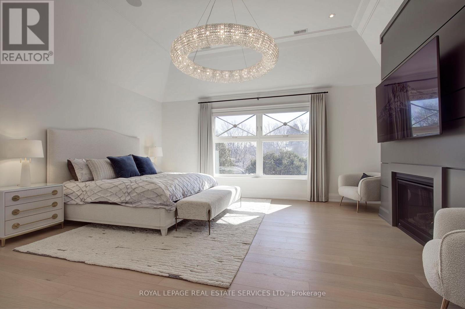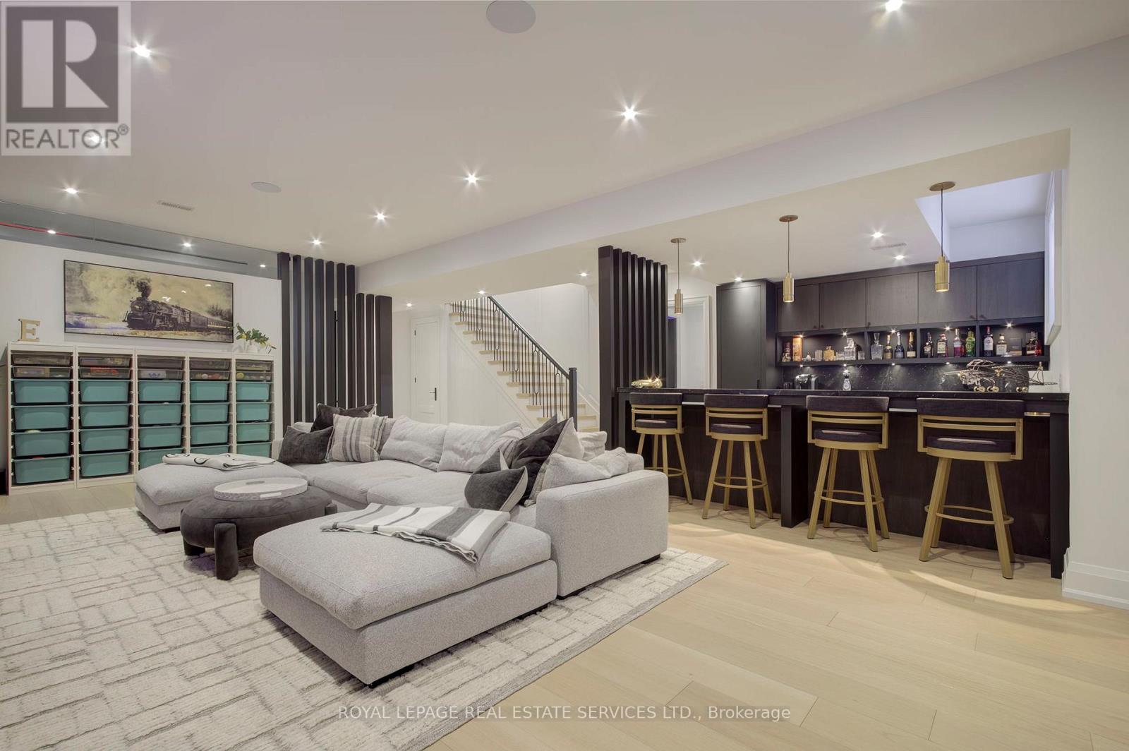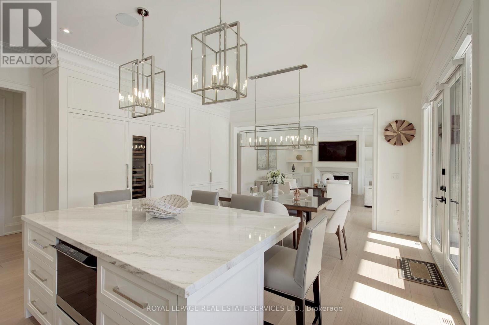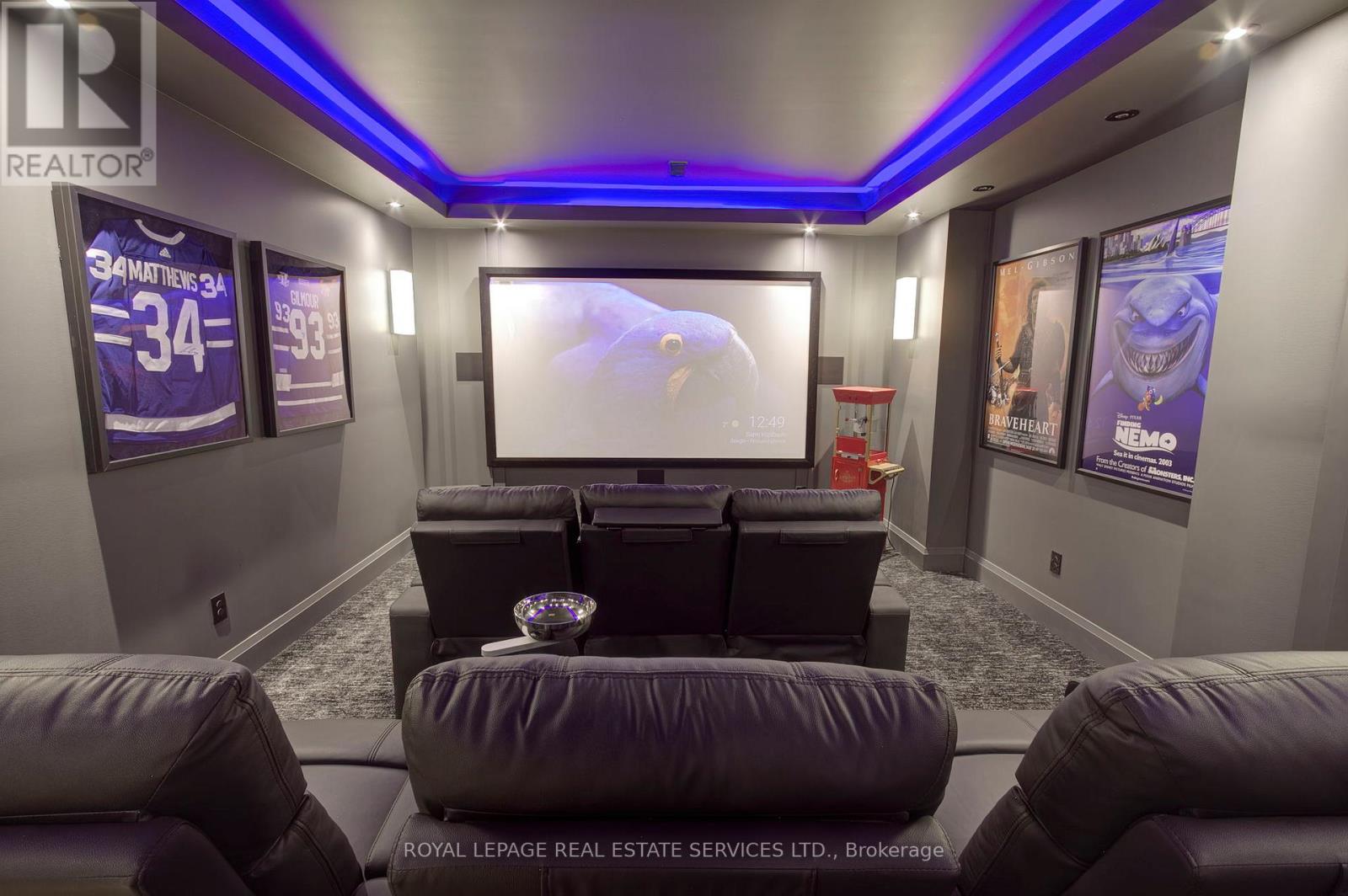 Welcome to 1504 Warren Dr., a spectacular custom-built residence in the heart of Oakville offering approximately 6,300 sq.ft. of luxurious living across three beautifully finished levels. Perfectly positioned on a premium 100 x 150 ft lot, this exceptional home blends timeless elegance, master craftsmanship, and sophisticated smart-home technology. The professionally landscaped grounds create a private outdoor oasis featuring LED nightscape lighting, Wi-Fi controlled irrigation, and a fully fenced backyard retreat. Enjoy effortless entertaining beneath the expansive covered porch with a gas fireplace, natural gas BBQ line, and a Beachcomber hot tub complete with waterfalls, jets, speakers and ambient lighting. The triple car garage features epoxy flooring, LiftMaster openers, Gladiator storage systems, and EV-ready electrical. Inside, a 9-ft mahogany entry door opens to soaring 10-ft ceilings, elegant wall paneling, crown mouldings, and wide plank engineered oak floors. The chef's kitchen is a true showpiece with a 48" Wolf 8-burner dual fuel range, Sub-Zero fridge and freezer columns, Sub-Zero wine column, built-in Sharp microwave/convection oven, Miele dishwasher, and a separate servery with beverage centre. Upstairs, four spacious bedrooms showcase custom vaulted ceilings and built-in closets, complemented by a sky-lit hallway and a convenient laundry room with LG front-load washer and dryer. The fully finished lower level is designed for ultimate entertainment, offering radiant heated floors, a custom home theatre, wet bar ice maker, home gym, additional bedroom, and a spa-inspired bathroom with steam shower, rain head, body jets, LCD integrated panel and speakers. Complete with Control4 8 zone smart sound automation, security film on all windows, multiple gas fireplaces, marble surfaces with protective scratch-proof film and Lennox climate systems, this remarkable residence delivers refined luxury living in one of Oakville's most prestigious neighbourhoods. (id:64974)