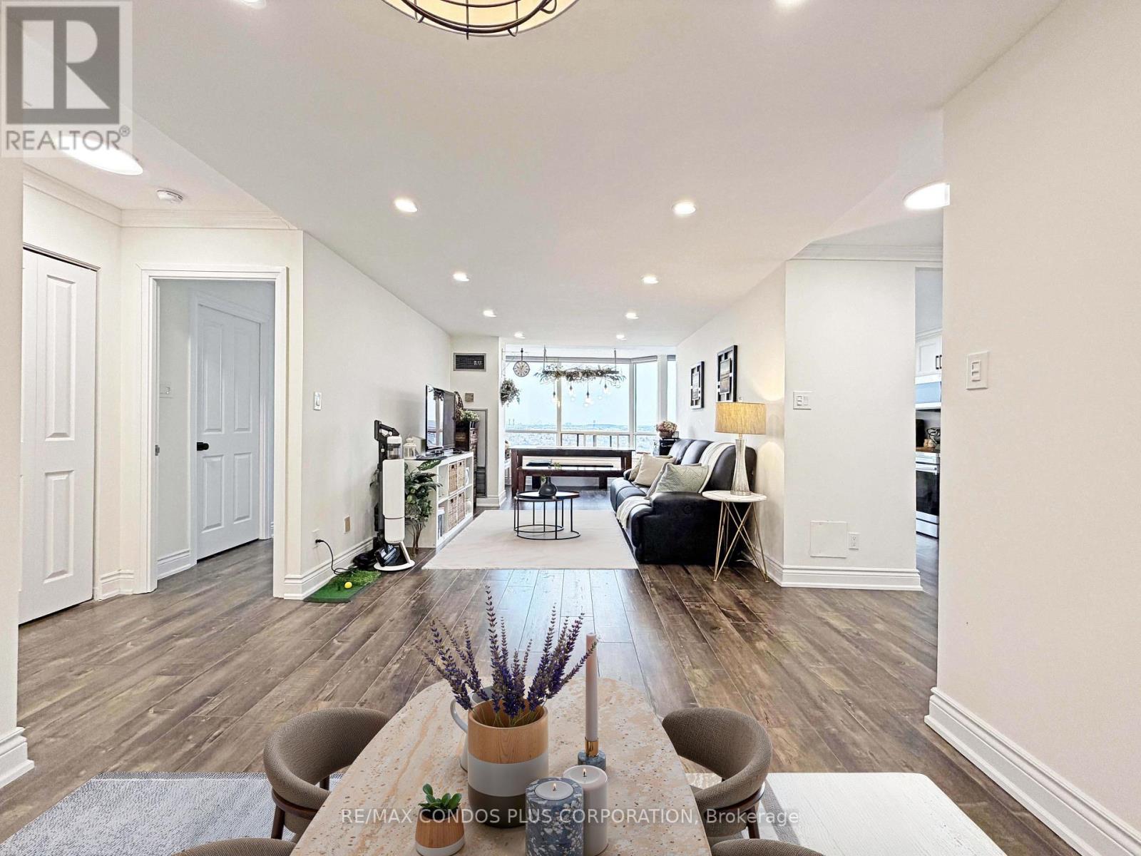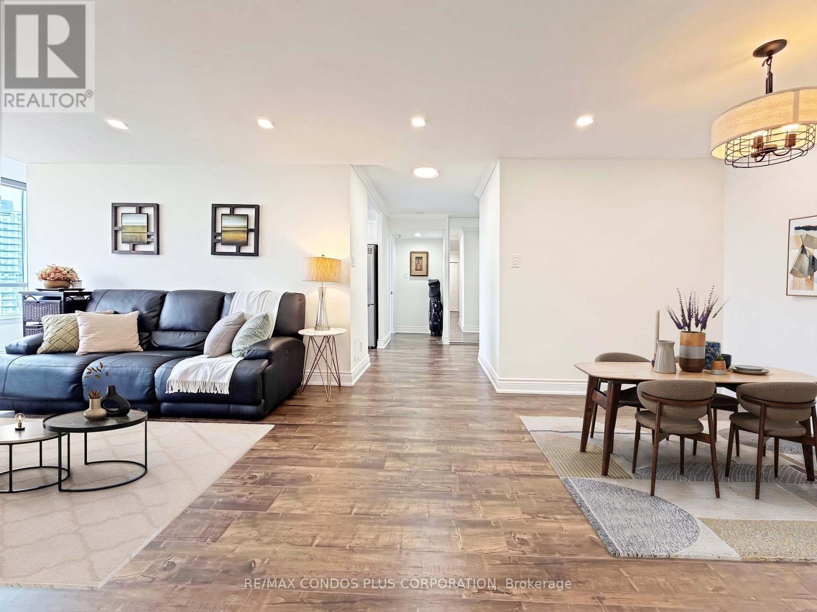 Panoramic-view 2-bedroom, 2-bathroom suite at 120 Promenade Circle offering approximately 1,260 sq. ft. with a bright split-bedroom layout, tandem parking, and 1 locker. Spacious renovated unit features hardwood flooring throughout, large windows with abundant natural light, and a functional solarium that adds flexible living space. Generous foyer with oversized double closet offers excellent storage. Well-designed layout includes a spacious primary bedroom with his-and-hers closets and a 5-piece ensuite, while the second bedroom features its own walk-in closet. Tandem parking for 2 cars is conveniently located close to the elevator for added everyday ease. Windows replaced in 2022. Maintenance fees include cable TV. Excellent Promenade location just steps to Promenade Shopping Centre, restaurants, Walmart, and public transit. (id:64974)
