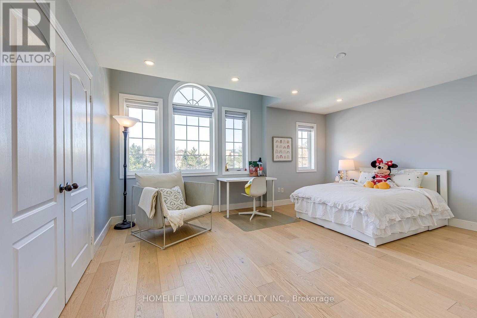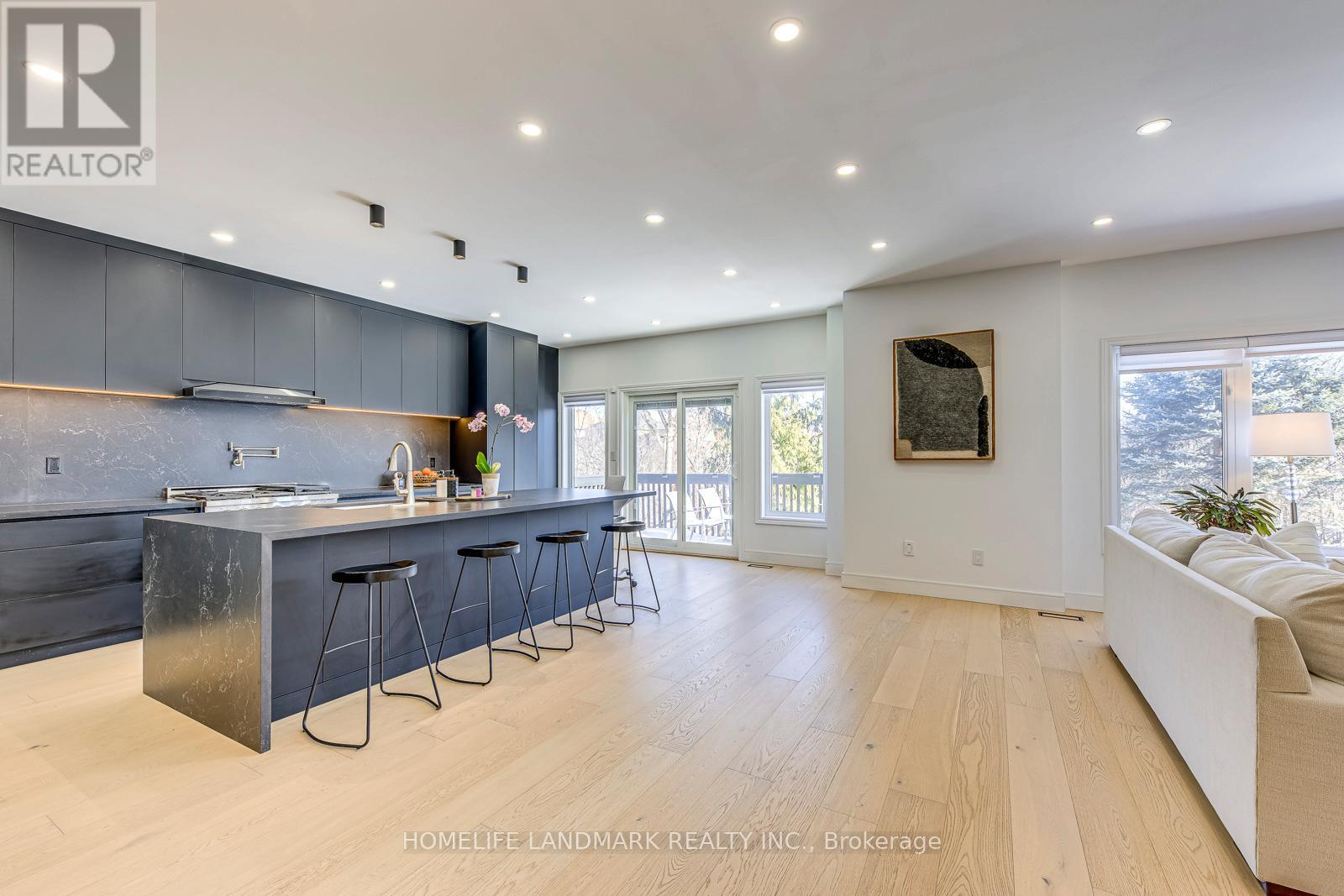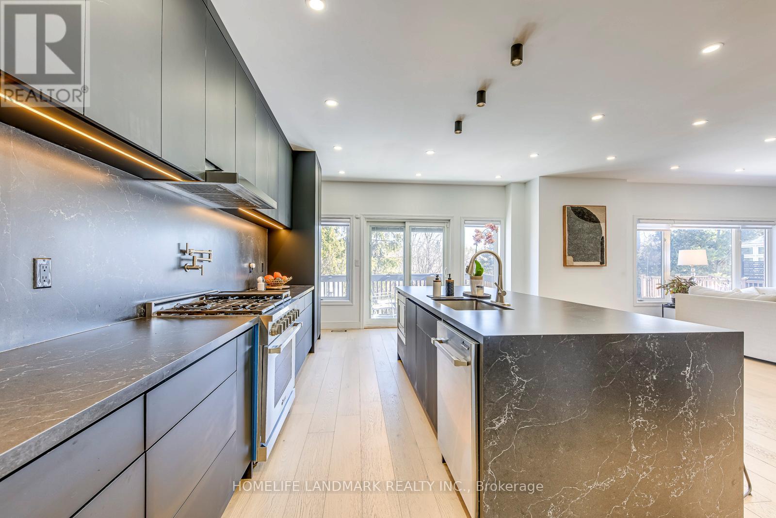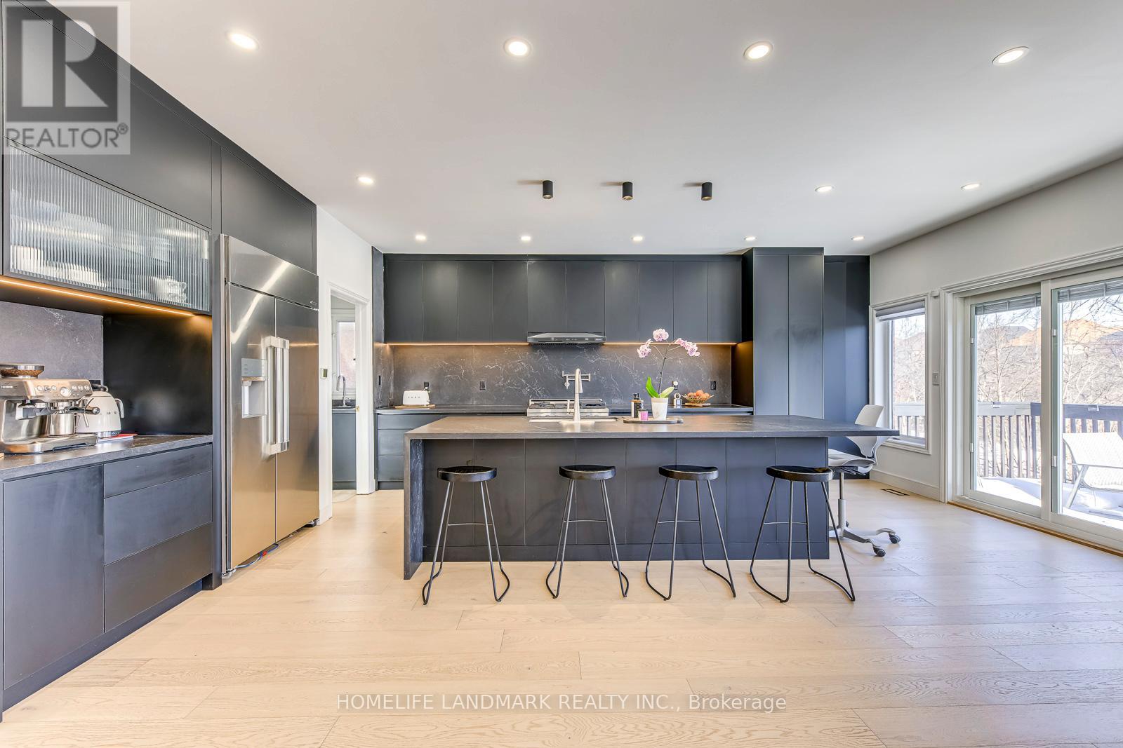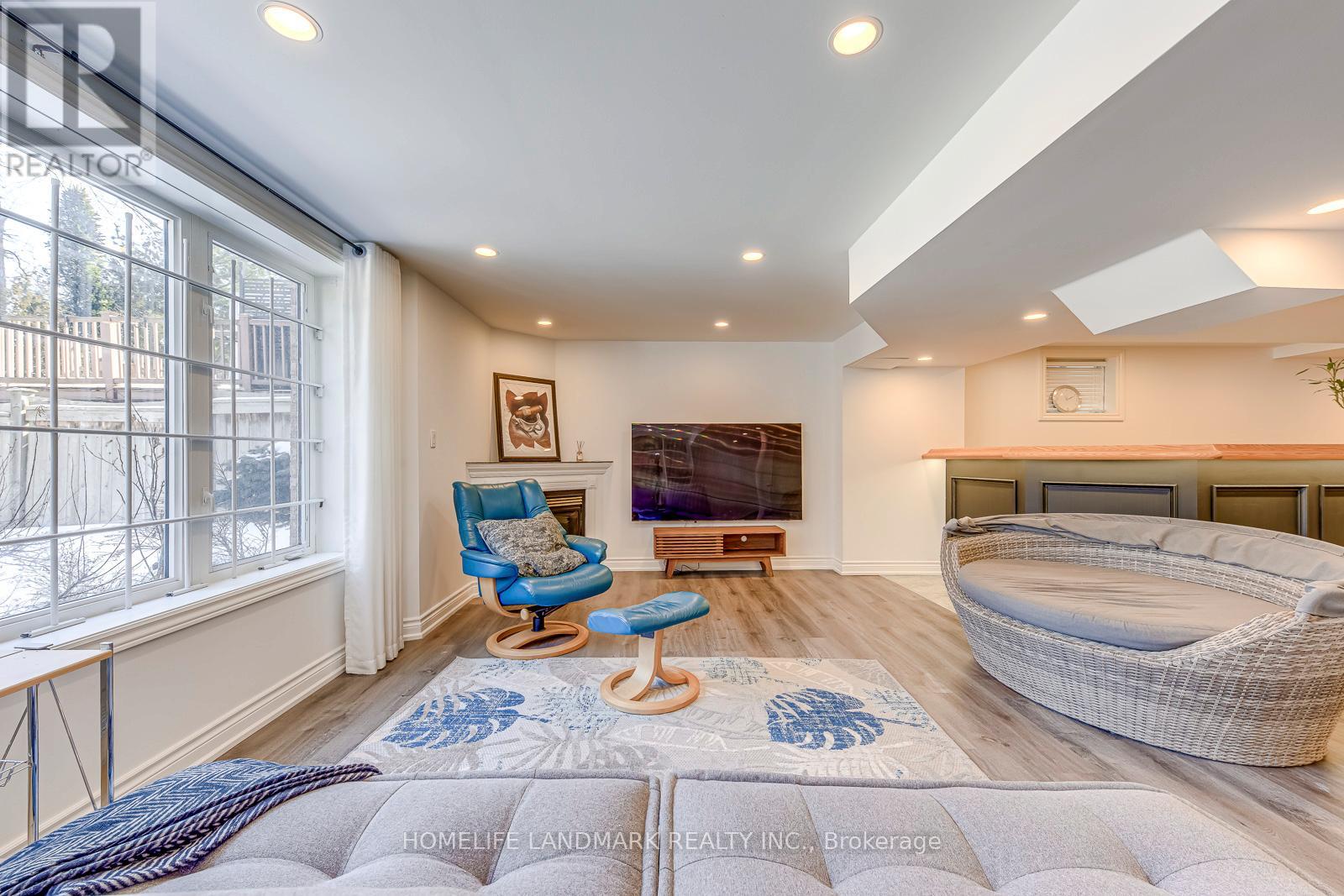 Prestigious Joshua Creek! Exceptional 5 Bed, 5 Bath executive home with over 5,000 sqft of finished living space. Park directly in front and private ravine lot with access to scenic trails. Safe walking distance to top-rated schools (K-G8) - enjoy the rare comfort of watching your children walk to and from school. Main floor features 15-ft ceilings in the living room, private office, formal dining, and open-concept kitchen with unique LG Viatera Quartz counters, Blum push-open cabinetry, upper pull-down storage, and all-new Dacor appliances (2023): 36" hood fan, 36" professional range, 42" built-in fridge, built-in microwave & dishwasher. Walk-out to upper deck overlooking ravine. Hardwood floors throughout main level. Upper level offers 5 bedrooms with ensuite access. Primary retreat with 5-pc ensuite, Jacuzzi tub & 2 walk-in closets. Two Jack & Jill baths serve remaining bedrooms. Fully finished walk-out basement with gas fireplace, bar, pool table area, dance/exercise space, sauna room, 3-pc bath & direct yard access. Landscaped yard with sprinkler system, gas BBQ hookup. Outdoor furniture, pool table & guest room bed included. Extensive updates include: All-new Dacor kitchen appliances (2023) New Whirlpool washer & dryer (2023) Front entry door & patio door replaced (2023) Windows resealed and recaulked (2023) Backyard drainage improvements (2023) Outdoor lighting installed (2023) Roof maintenance (2024) (id:64974)