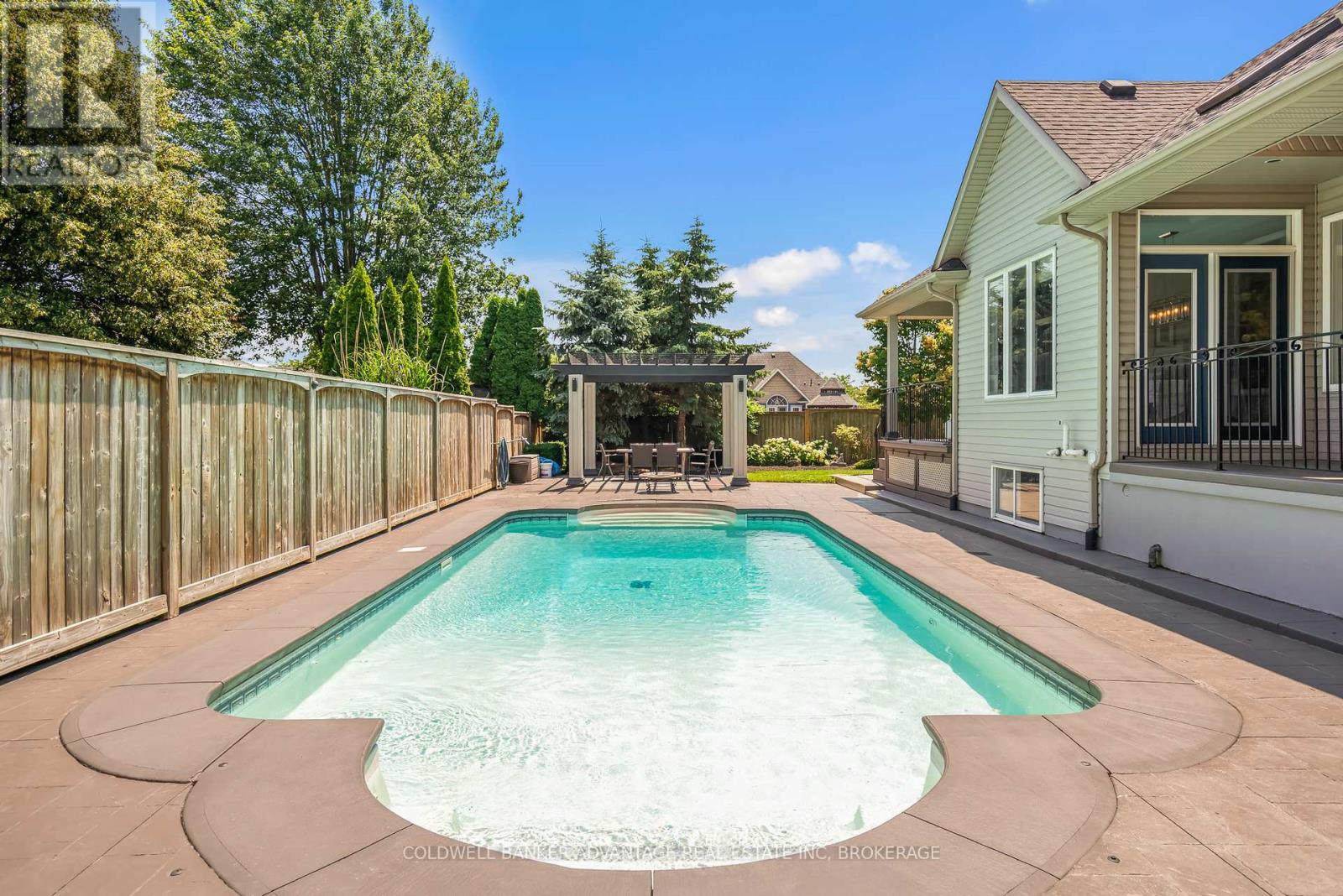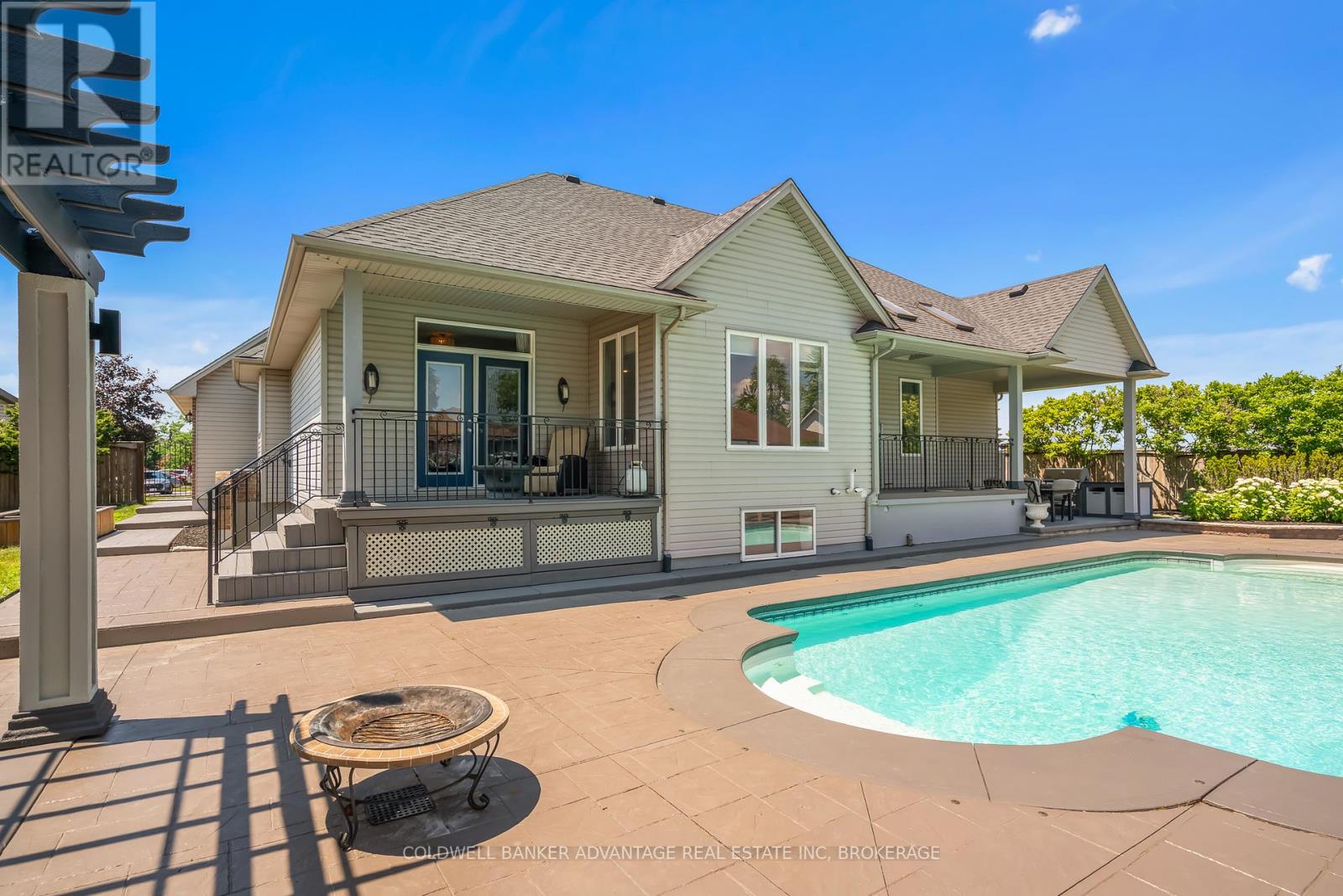 Large Executive Bungalow situated at the end of a quiet Cul de Sac on extensively landscaped, private pie shaped lot on the Fonthill/Welland border. This fabulous family home provides close to 4000 sq ft of top quality finished space loaded with luxurious materials and upgrades including 9' and cathedral ceilings, hardwood floors, upgraded trim, 2 gas FP's, hard surface counters and in-line back up generator. 3+ 2 Bedrooms, including spacious Master w/ ensuite bath, his & her walk in closets & garden doors to private covered deck , 3 baths, formal Dining room & fully finished lower level with walk out / separate entrance, custom office suite, 2 additional bedrooms and amazing 600 sq ft Rec room/ entertainment room w/ gas FP, custom built in's & wet bar. The incredible backyard oasis features 3 covered decks, outdoor kitchen w/ b/i BBQ, I/G heated pool, synthetic turf putting green & custom built pergola ( pre-wired for hot tub ). Fabulous location in highly sought after North welland neighbourhood, close to schools, shops, Niagara College & Welland's recreation waterway & trails. (id:64974)