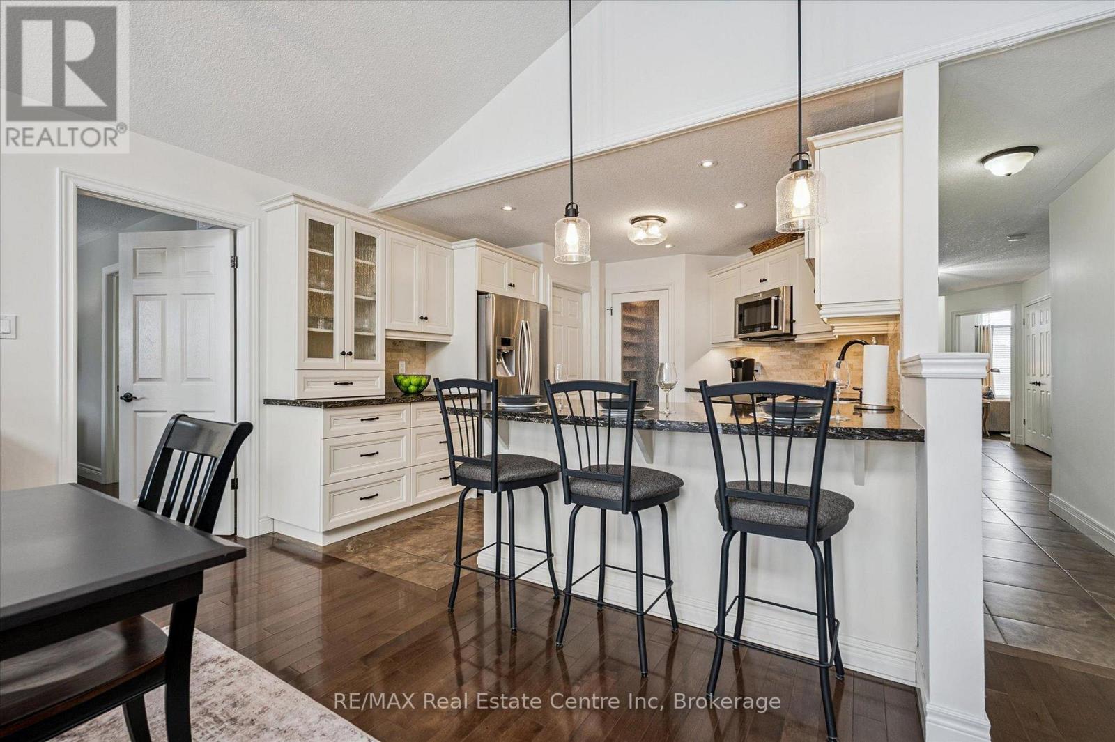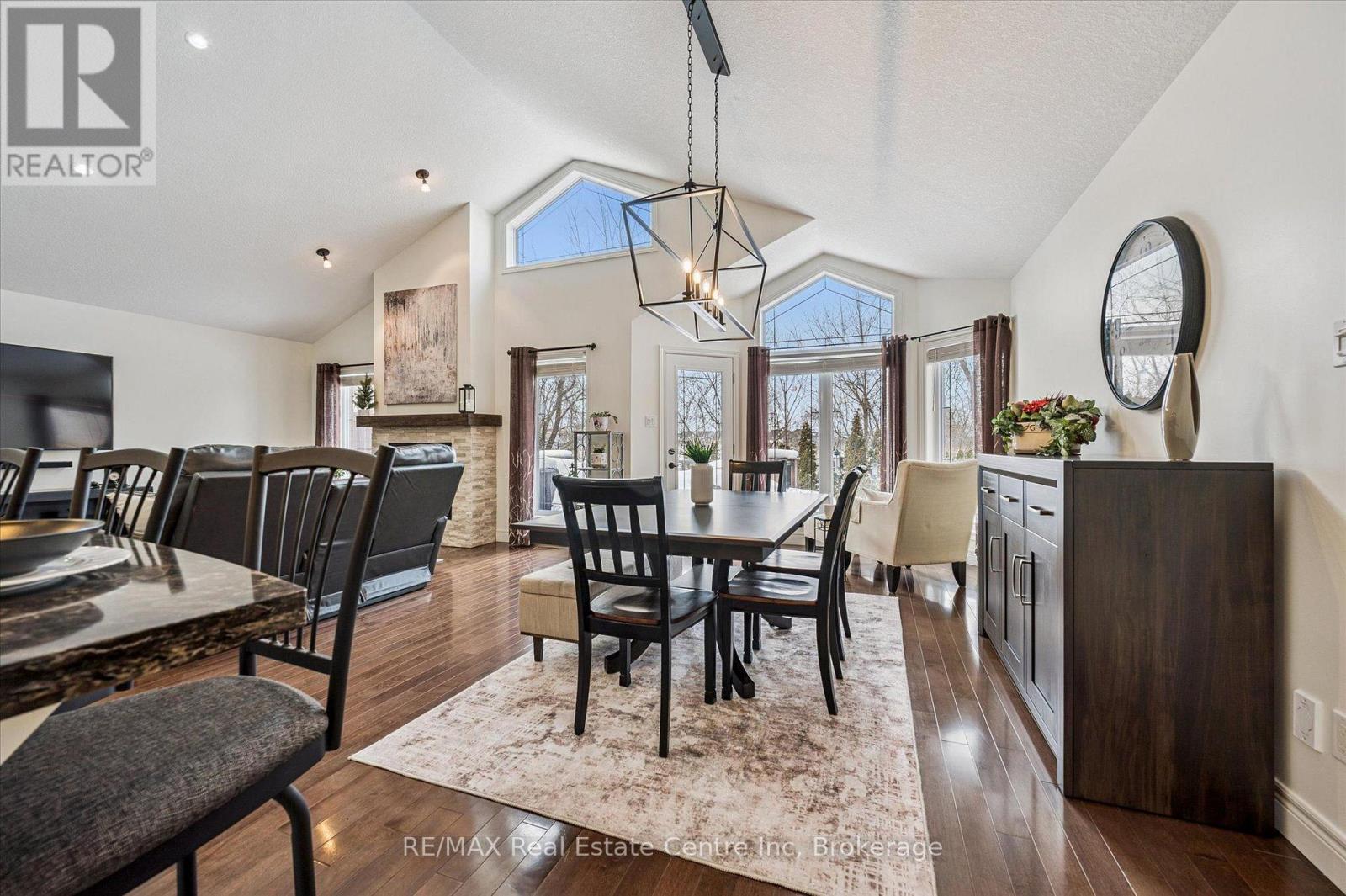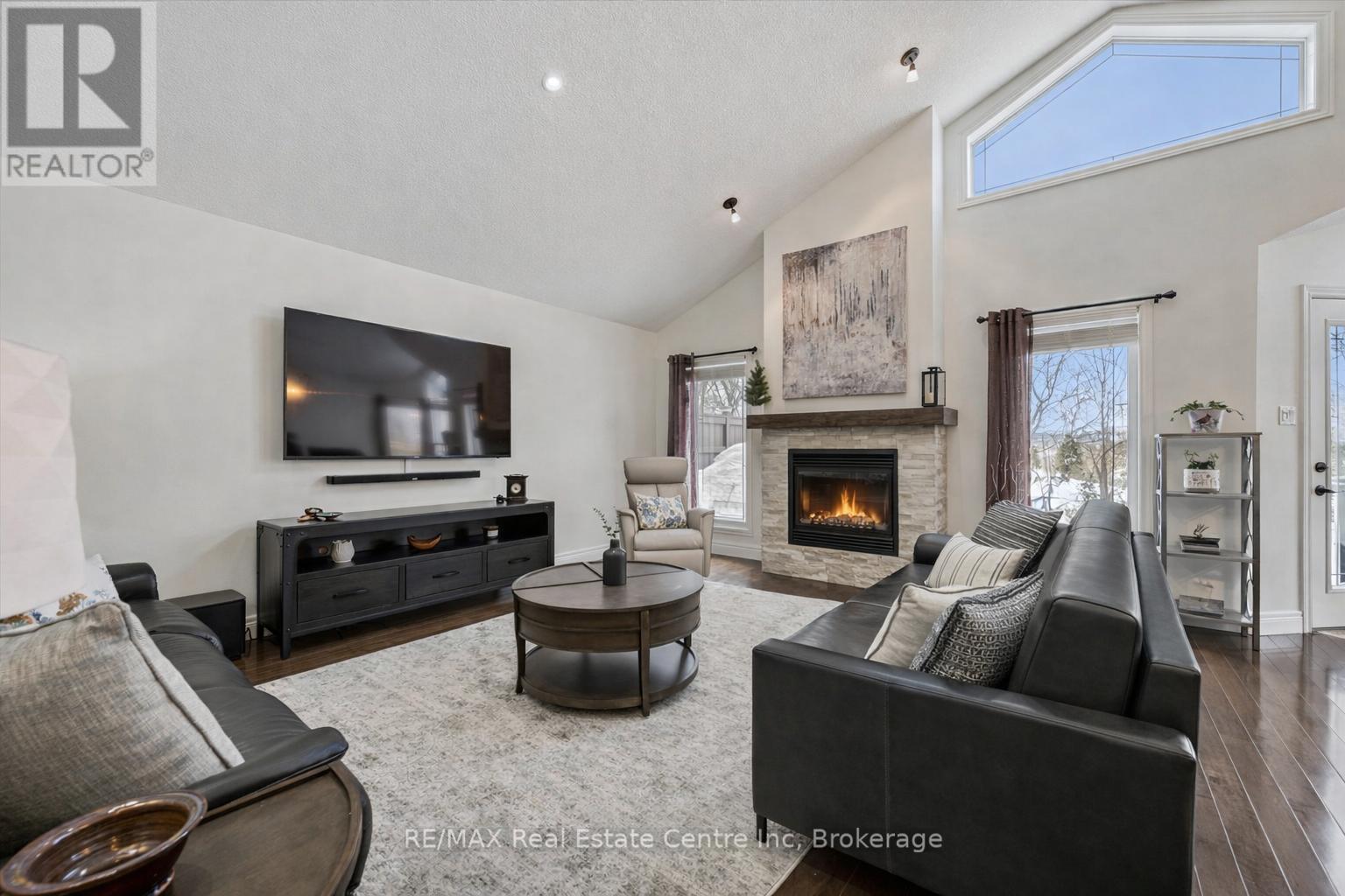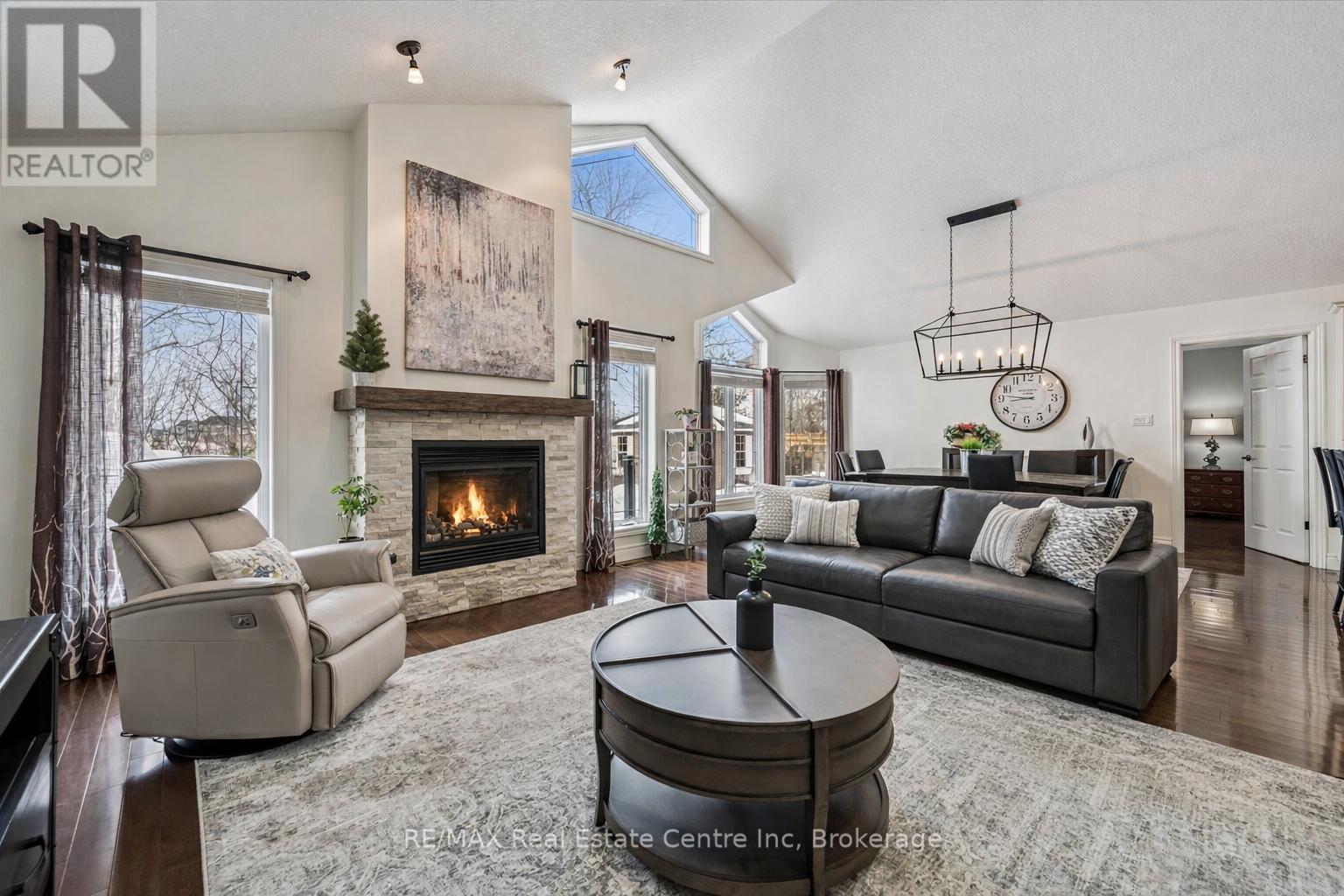 Stunning 4-bdrm bungalow W/newly finished bsmt & sep ent backing onto greenspace! Located in family-friendly neighbourhood this home was built by WrightHaven Homes, local builder known for superior craftsmanship, thoughtful design & energy-efficient construction. Stone & brick exterior, resurfaced driveway, front entry, interlock walkway & landscaped grounds create striking presence. Open-concept living & dining areas create space for everyday living & entertaining. Hardwood floors & vaulted ceilings enhance openness while windows fill home W/light & offer greenspace views. Stone fireplace creates warm atmosphere & dining room offers perfect setting for hosting. Kitchen W/white cabinetry, crown moulding & glass-front accents complement striking granite counter & stone backsplash. S/S appliances W/new 2025 KitchenAid stove & microwave. Ample cabinet & counter space provide lots of storage & prep space. Peninsula W/seating is ideal for casual meals & W/I pantry for storage. Primary bdrm W/tray ceilings, hardwood & large window. Ensuite with W/I shower, vanity W/storage & W/I closet. 2 add'l bdrms are bright & well-sized. 4pc main bath offers shower/tub. Laundry & mudroom offer storage & folding space W/access to garage & Level 2 EV charger. Prof. finished bsmt W/permits & over $100,000 invested to create high-quality space. Rec room W/electric fireplace, pot lighting & 4windows. Custom stone bar with B/I beverage fridge & wine storage. Lots of room for gym, games area or playroom. Add'l bdrm W/dbl closet &3pc bath W/quartz counters & glass shower. Sep ent offers potential for in-law or income suite. Backyard oasis W/interlock pathways, pristine gardens, landscaping & composite deck for entertaining, dining & lounging. Cedar hedges & trees provide privacy & fenced yard is ideal for families & pets. Backing onto Trestle Bridge Trail offering access to 47km scenic route connecting you to Grand River & Cataract Trail. Mins from downtown shops, dining & Elora Mill Spa! (id:64974)