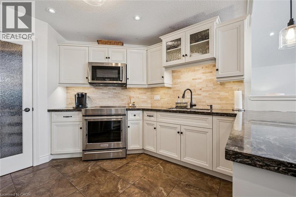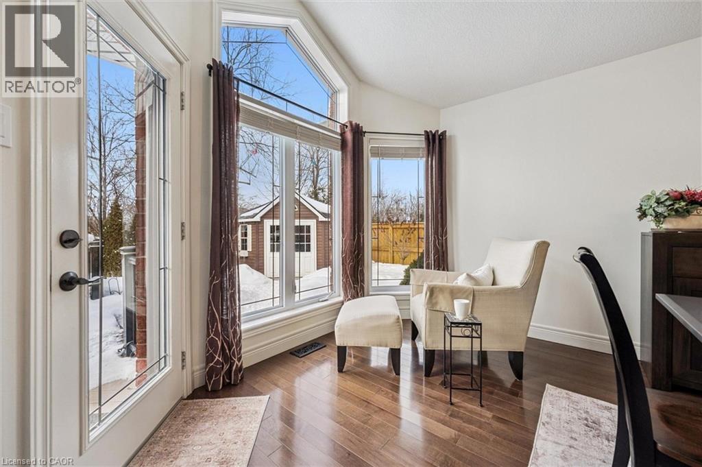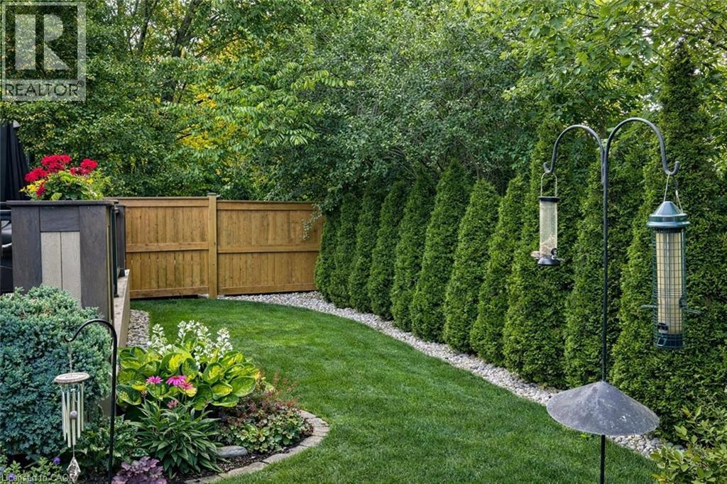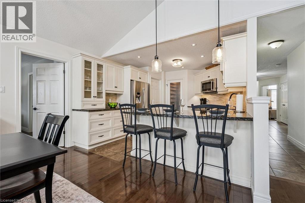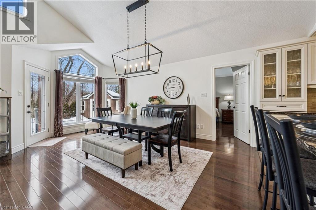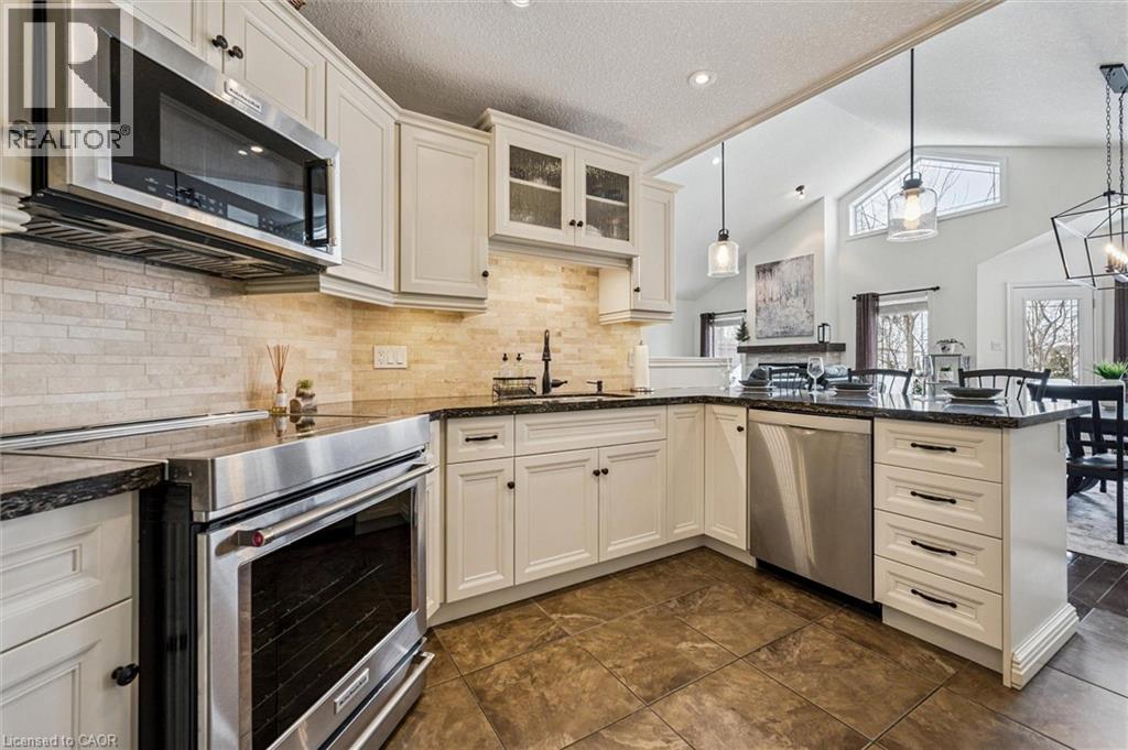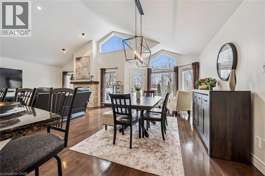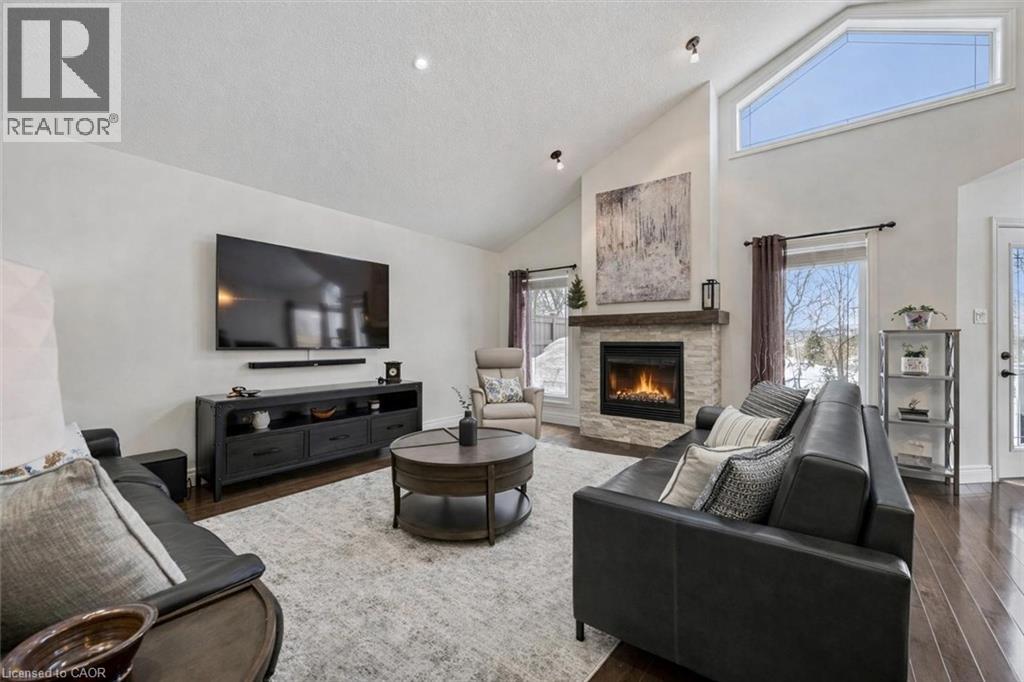 Stunning 4-bdrm bungalow W/newly finished bsmt & separate entrance backing onto greenspace! Located in family-friendly neighbourhood this home was built by a local builder known for superior craftsmanship, thoughtful design & energy-efficient construction. Stone & brick exterior, resurfaced driveway, front entry, interlock walkway & landscaped grounds create striking presence. Open-concept living & dining areas create space for everyday living & entertaining. Hardwood floors & vaulted ceilings enhance openness while windows fill home W/light & offer greenspace views. Stone fireplace creates warm atmosphere & dining room offers perfect setting for hosting. Kitchen W/white cabinetry, crown moulding & glass-front accents complement striking granite counter & stone backsplash. S/S appliances W/new 2025 KitchenAid stove & microwave. Ample cabinet & counter space provide lots of storage & prep space. Peninsula W/seating is ideal for casual meals & W/I pantry for storage. Primary bdrm W/tray ceilings, hardwood & large window. Ensuite with W/I shower, vanity W/storage & W/I closet. 2 add'l bdrms are bright & well-sized. 4pc main bath offers shower/tub. Laundry & mudroom offer storage & folding space W/access to garage & Level 2 EV charger. Prof. finished bsmt W/permits & over $100,000 invested to create high-quality space. Rec room W/electric fireplace, pot lighting & 4 windows. Custom stone bar with B/I beverage fridge & wine storage. Lots of room for gym, games area or playroom. Add'l bdrm W/dbl closet & 3pc bath W/quartz counters & glass shower. Sep ent offers potential for in-law or income suite. Backyard oasis W/interlock pathways, pristine gardens, landscaping & composite deck for entertaining, dining & lounging. Cedar hedges & trees provide privacy & fenced yard is ideal for families & pets. Backing onto Trestle Bridge Trail offering access to 47km scenic route connecting you to Grand River & Cataract Trail. Mins from downtown shops, dining & Elora Mill Spa! (id:64974)
