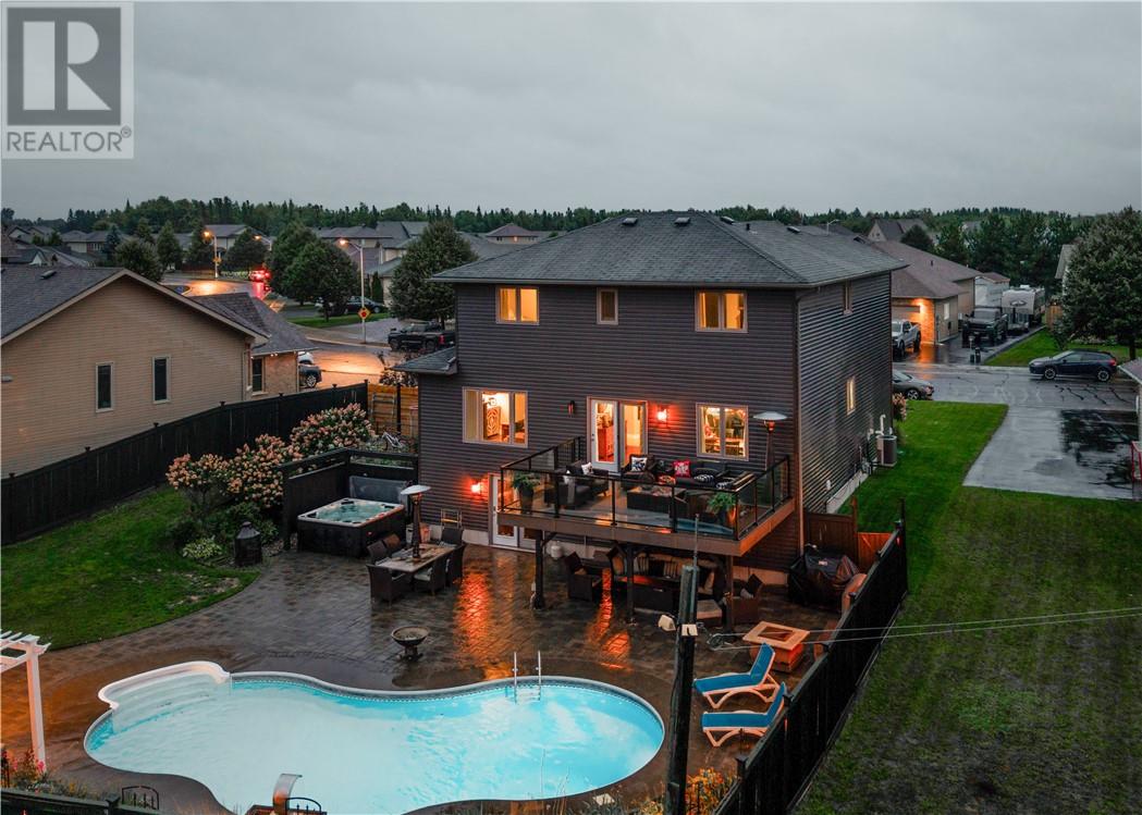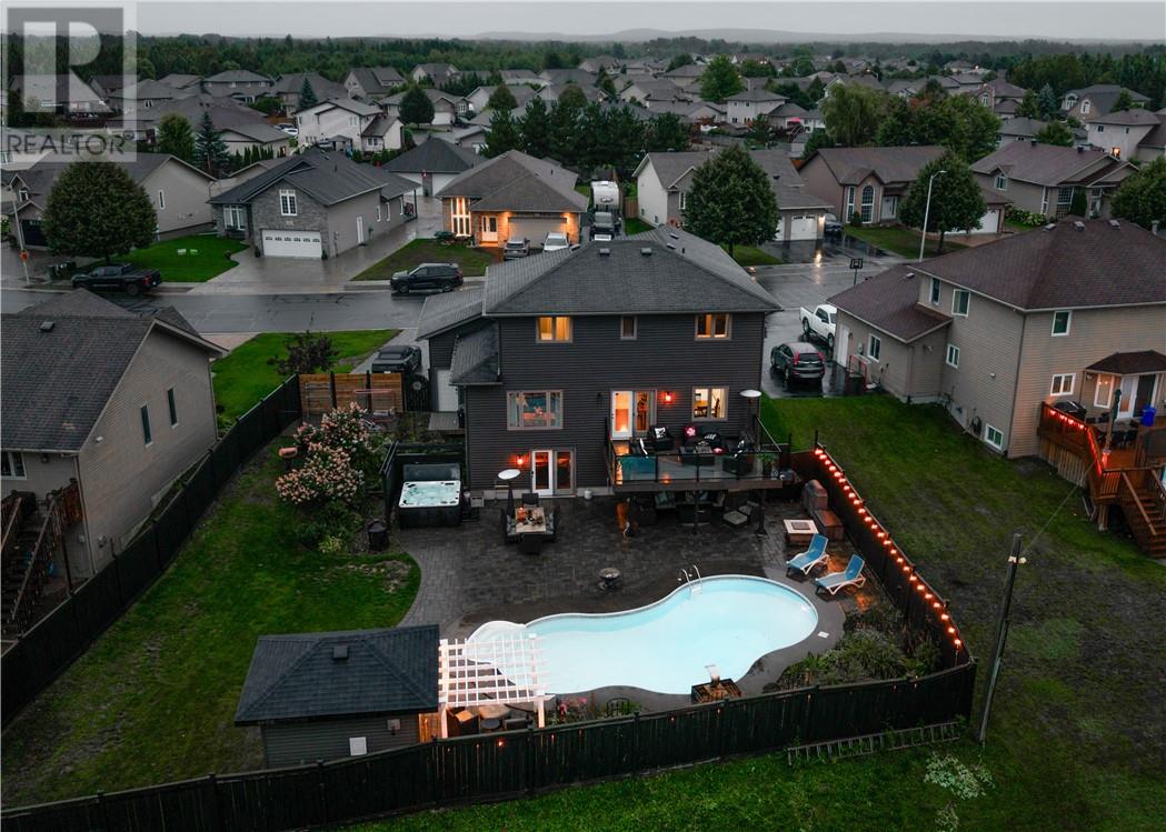Welcome to 1528 Jeanne D’Arc in Hanmer, a stunning family home that backs onto greenspace. This home blends comfort, style, and functionality in one of the valley’s most sought-after and family-friendly neighborhoods. This spacious residence offers an inviting open-concept main floor with tall 9 ft ceilings, creating a bright and airy atmosphere that’s perfect for everyday living and entertaining alike. The thoughtful design provides three separate living/rec rooms, giving your family endless options for relaxing, gathering, or creating dedicated spaces for hobbies and entertainment. The modern layout flows seamlessly from the living room into the dining area and gourmet-style kitchen, showcasing impeccable finishes throughout. Upstairs, you’ll find 4 generously sized bedrooms, including a luxurious primary suite with a large ensuite bath and walk-in closet. The finished walkout basement expands your living space with a fifth bedroom, a versatile den/gym, and one of the home’s multiple rec areas—perfect for guests, a home office, or fitness space. With 3 full bathrooms and 1 half bath, there’s ample comfort and convenience for the whole family. Step outside to your very own private retreat: a heated inground pool, relaxing hot tub, and fully fenced backyard backing onto undeveloped land. The interlocked driveway offers ample parking, ensuring both beauty and practicality. Whether you’re entertaining, relaxing, or raising a family, this home truly checks all the boxes. Don’t miss your chance to own this rare gem in Hanmer! (id:64974)