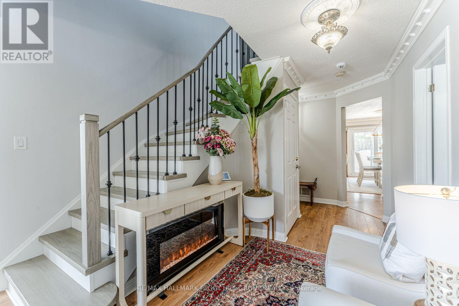 BACKING ONTO EP LAND & RAVINE VIEWS WITH OVER 3,200 FINISHED SQ FT & A BACKYARD SETUP WITH AN OVERSIZED DECK, HARD-TOP GAZEBO, & HOT TUB! Tucked onto a 60 x 120 ft lot backing onto EP land and a quiet ravine, this detached home offers treed views behind you and a setting that feels calm and tucked away. An attached 2-car garage keeps things easy, while the backyard is ready for real use with an oversized deck, hot tub, landscaped space to garden or play, and a hard-top gazebo that turns ordinary weeknights into nights you can stay outside a little longer. Over 3,200 finished sq ft gives everyone room to spread out without losing that comfortable, liveable feel, offering 6 bedrooms and 4 bathrooms that suit growing or multi-generational families. Upgrades add warmth throughout, from the solid oak staircase and hardwood flooring to crown moulding, modern paint tones, and finishes that feel curated and current. The kitchen delivers updated stone counters, creamy white cabinetry, a pantry, and stainless steel appliances, including a gas stove, flowing into a bright breakfast area with a walkout that keeps backyard time effortless. Multiple living spaces let you set your own pace, including a family room with a wood-burning fireplace and brick surround, plus a combined living and dining area with a bow-style bay window framing the front yard. Upstairs, 4 generously sized bedrooms include a primary suite with two double closets and a private 4-piece ensuite, while the remaining bedrooms are served by a main 3-piece bath. Downstairs, the finished basement adds in-law potential with a large rec room featuring a sink that works beautifully as a wet bar, 2 additional bedrooms, and a full bathroom. Close to schools, shopping, dining, and Highway 400, plus an easy walk to Lampman Lane Park with tennis courts, a skateboard park, splash pads, playgrounds, a multi-purpose basketball court, shaded seating, open lawn space, and an outdoor rink. (id:64974)