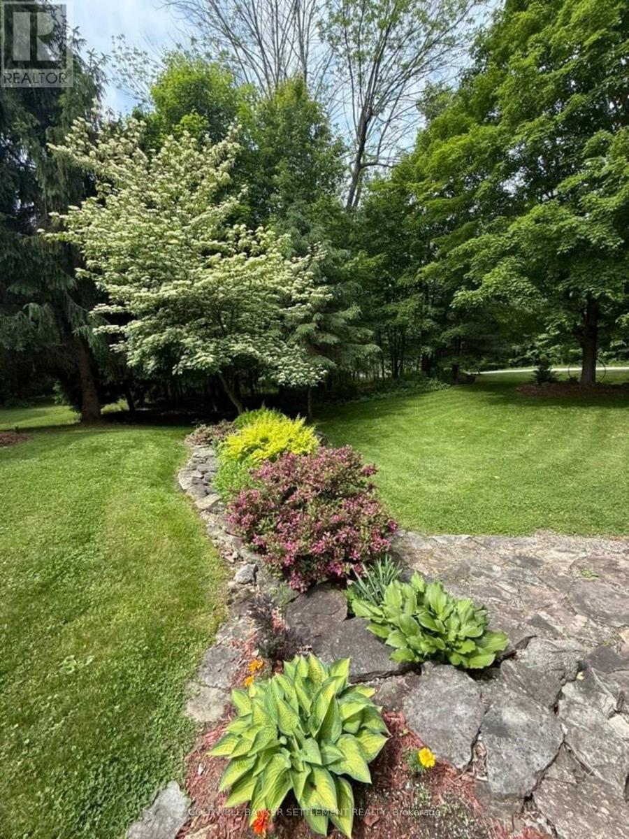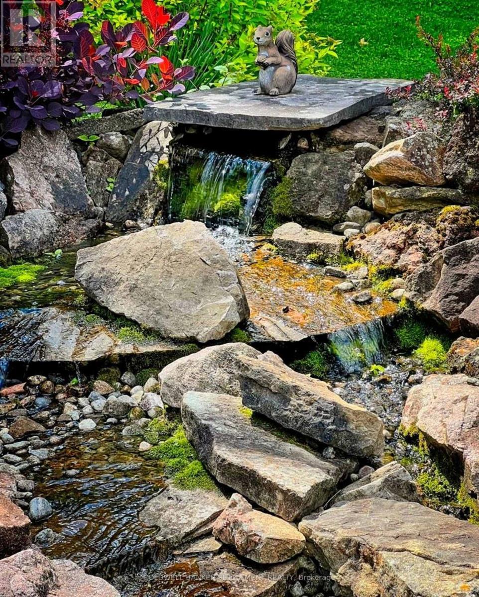 Welcome to peaceful country living, mere minutes from historic Perth and all its amenities! Set nicely back from the road on a picturesque & treed 3 acre property, this meticulously appointed, energy efficient and well cared for 4 bedroom, 3 1/2 bath bungalow with bright walk-out lower level, will not disappoint. Enter from the covered front porch into the inner foyer, then to a centre hall area that leads you to the custom designed and bright eat-in kitchen with quality stainless steel appliances and quartz counters with breakfast seating. The back foyer provides access in from the oversized double attached garage & hosts laundry, closet, 2 piece bath & rear door access to the spacious covered deck and gorgeous private backyard oasis. Gleaming hardwood floors & corner fireplace highlight the dining & living room area. Large primary bedroom with plenty of closet space & full 4 pce. ensuite bath, the second bedroom and full bath round out the main floor living space. The fully finished, bright walk-out basement provides loads of room for many activities featuring a large den area at the bottom of the stairs, two bedrooms, a full 4 pce. bath, family room with triple terrace door access to a lovely stone patio, workshop, large multi-purpose room (plumbed for a sink), 3 storage/utility areas, one has a laundry tub and access to the cold room. Other features: plenty of storage throughout, perennial beds, field stone walk-ways, a soothing waterfall & pond, paved driveway with turnaround, Generlink & generator, heat pump & propane furnace, hot water tank & hrv 2015. Tremendous in-law, multi-generational in lower level. (id:64974)