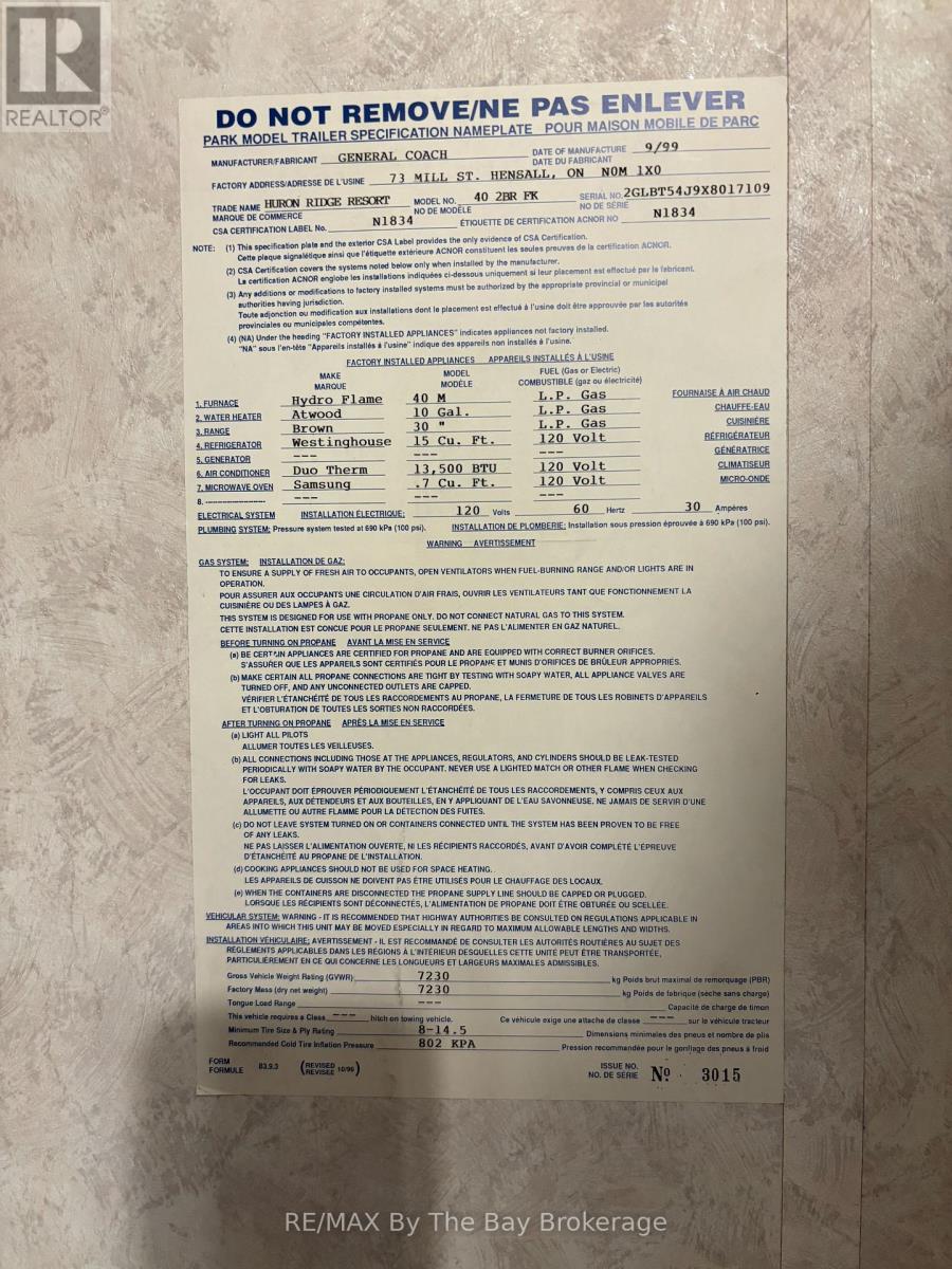 Beautifully maintained and priced to sell. Sellers are extremely motivated due to relocation. Experience the perfect seasonal retreat at the popular Countrylife Resort, available for seven months from April 26th to November 17th. This 40x12ft Huron Ridge Resort unit features a 40 ft hard roof and over 400 sq/ft of private deck space, situated on a centrally located lot that offers plenty of privacy and parking. Just a short walk from the beach, this cottage boasts two spacious bedrooms, providing ample room for family and friends. The exterior is low maintenance, and the unit comes fully furnished with central A/C, ready for immediate enjoyment. The resort offers a variety of amenities, including pools, a splash pad, a clubhouse, a tennis court, playgrounds, and mini golf, all within a gated community with security. This unit has been meticulously maintained and is a pleasure to show. 2026 Seasonal site fees are $6,090 plus HST Don't miss this opportunity to make lasting summer memories at your new home away from home. (id:64974)