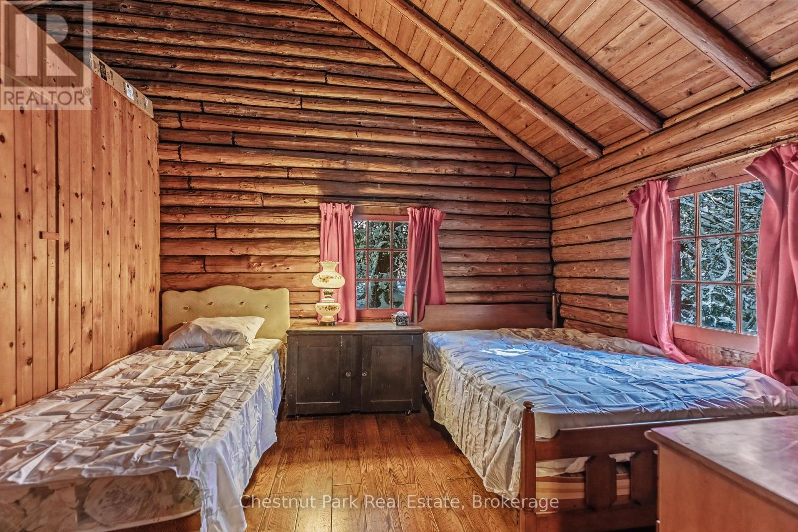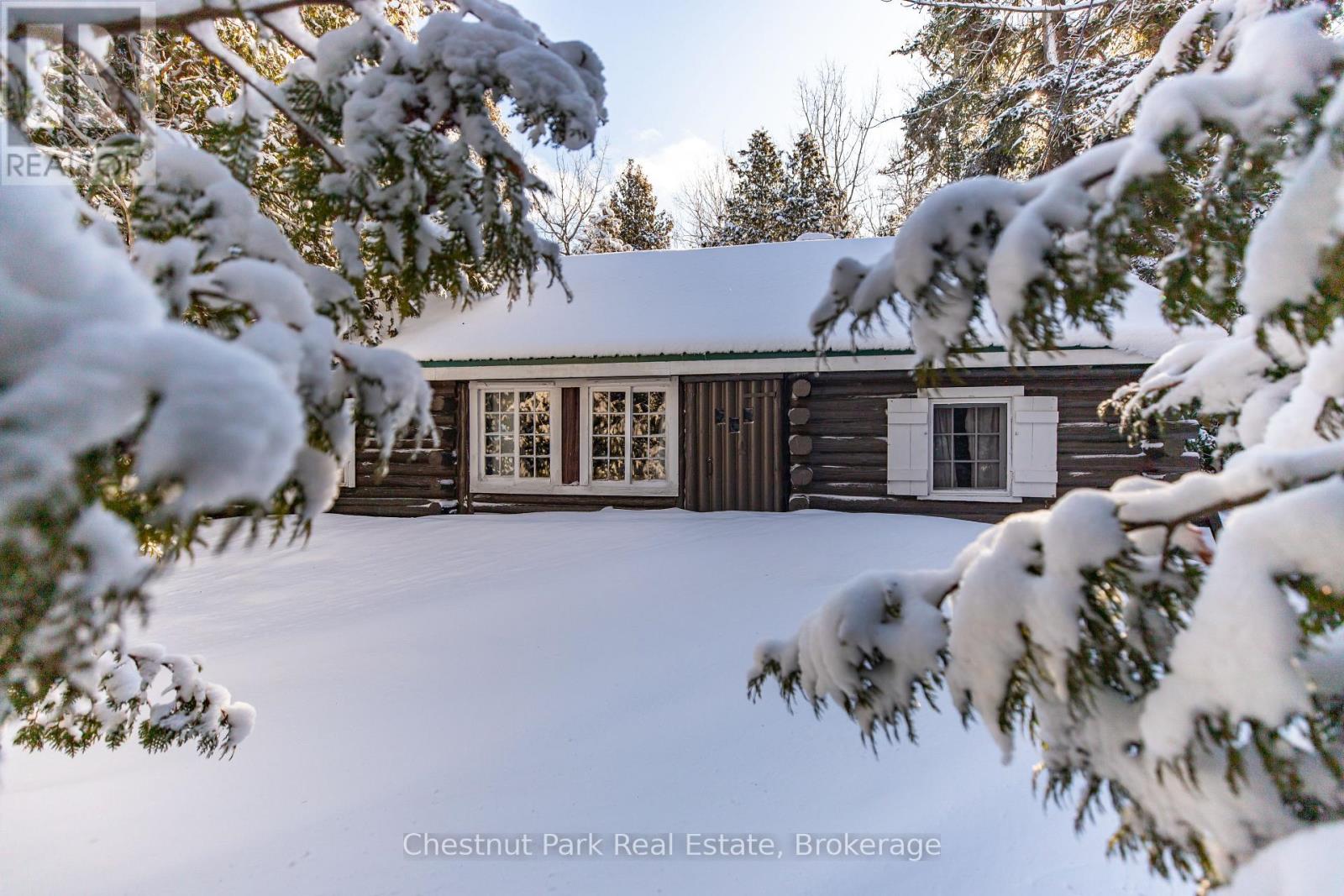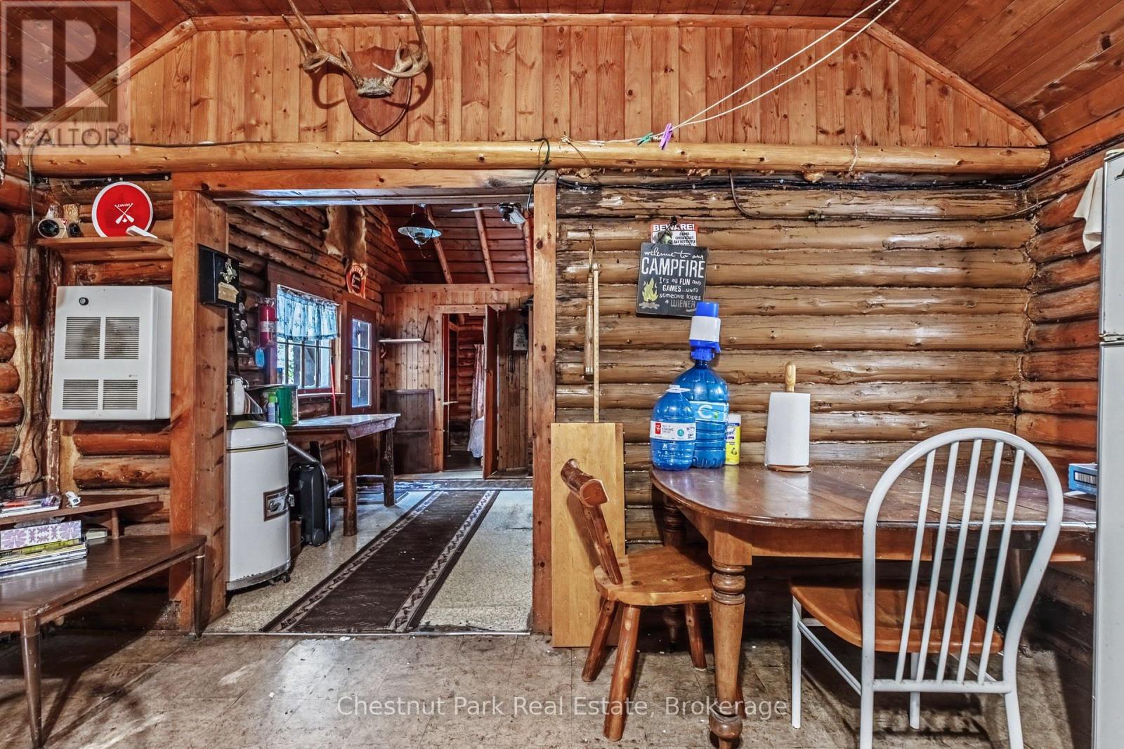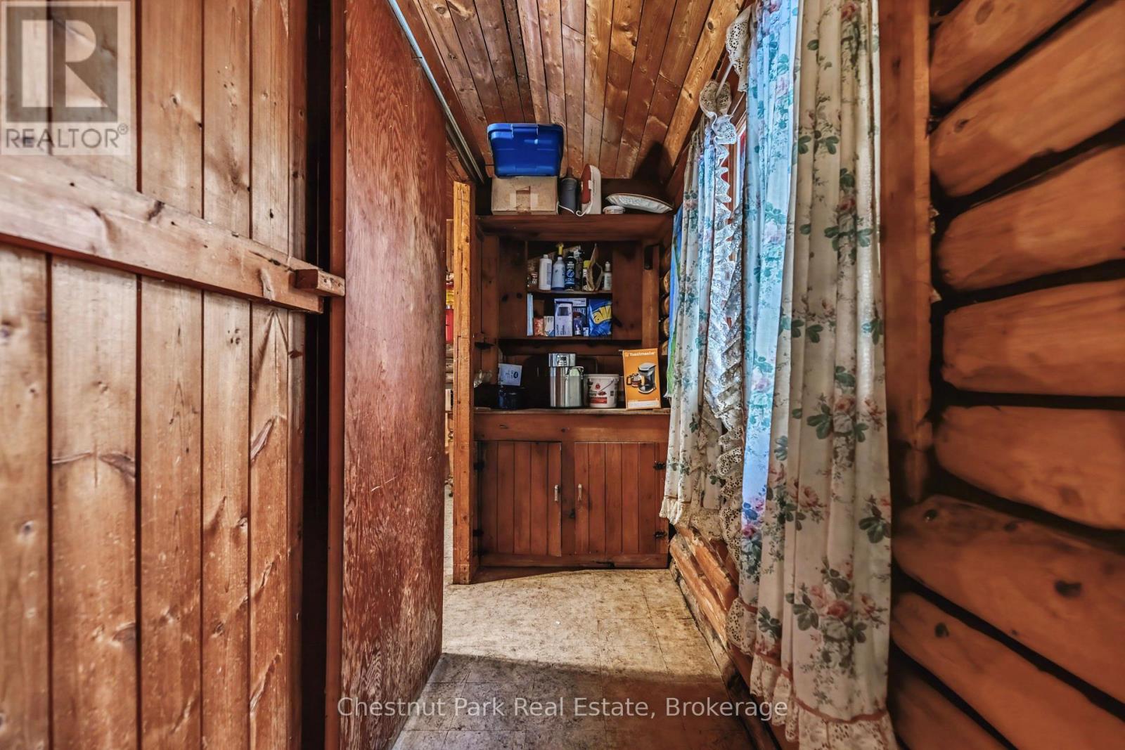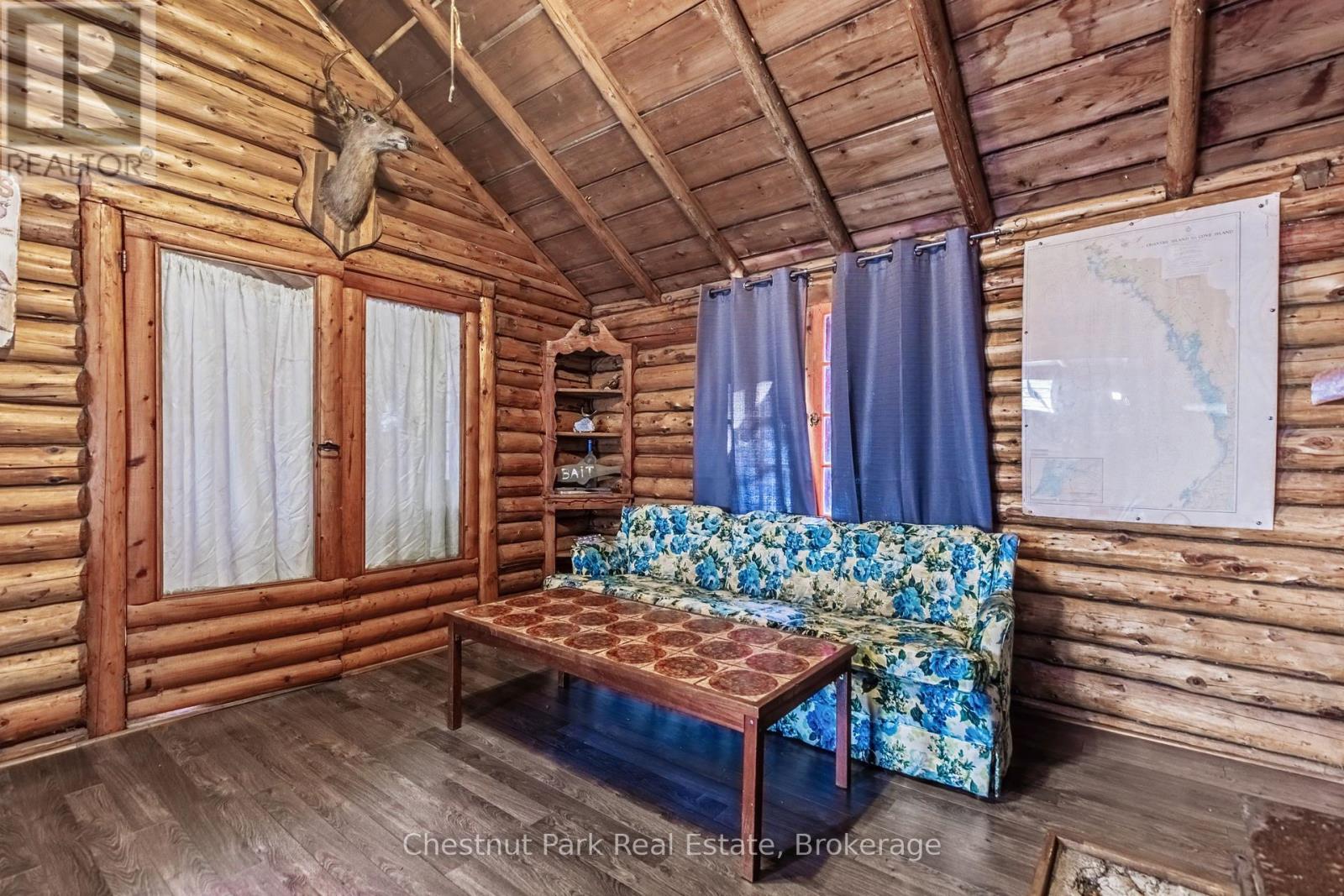 Rustic Log Cottage in a Prime Bruce Peninsula Location! This 3-bedroom seasonal log cottage offers approximately 990 square feet of living space and sits on a beautiful, well-treed 1.3-acre property in a highly desirable area, all at an attractive price point. Full of character with a classic "hunt camp" atmosphere, the cottage provides a warm and nostalgic setting for relaxed summer living. Inside, the spacious kitchen and dining area features an abundance of cupboards and plenty of room for family gatherings after a day outdoors. The cottage is protected by a durable metal roof and offers comfortable living space for family and guests. A separate guest cabin nearby provides additional accommodation, making it an ideal setup for extended family or visiting friends. Located directly across the road from excellent sand-bottom swimming and flat rock shoreline perfect for sunbathing, the waterfront setting offers great opportunities for boating, fishing, and enjoying spectacular sunsets. Just around the bend you'll find Sandy Beach, a popular public sand beach known for its shallow waters and family-friendly swimming. The charming village of Lions Head, with its marina, shops, restaurants, and amenities, is less than a 10-minute drive away. With privacy, natural surroundings, and possible severance potential, this property offers excellent opportunity as a family retreat, investment, or seasonal rental property. Being sold "as is, where is" with no representations or warranties. Priced to sell and ready for its next chapter on the Bruce Peninsula. (id:64974)