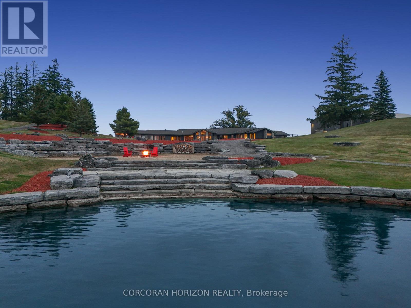 Experience an extraordinary retreat set on over 120 acres of natural beauty. This custom stone bungalow, spanning 10,454.23 sq. ft., showcases high-quality finishes and thoughtful design. Step into the gourmet kitchen, equipped with Viking Professional appliances, Silestone Quartz surfaces, and striking Douglas fir beams. The dual islands invite gatherings, while the dining area offers seating for 14, overlooking a scenic ponds. High ceilings throughout the home create an open, inviting space, while the use of stone and wood details adds a warm, cozy atmosphere. Hand-chipped stone accents and skylights flood the interior with natural light, enhancing the home's connection to its surroundings. The primary suite opens directly to the swim ponds, offering indoor-outdoor living and a spa-like ensuite with a jacuzzi tub beside a gas fireplace. An indoor grilling area with heated floors offers year-round enjoyment, making it an ideal space for entertaining. The lower level is designed for fun and relaxation, featuring a full bar, billiards area, wine cellar, and a private cinema for movie nights. Outdoors, you'll find two ponds: one with a sandy beach and waterfall, and the other stocked for fishing. A heated, 4,000 sq. ft. exterior building with in-floor heating adds both function and flexibility to this expansive property. Explore the trails, unwind in the sitting areas, and enjoy this ultimate private getaway! (id:64974)