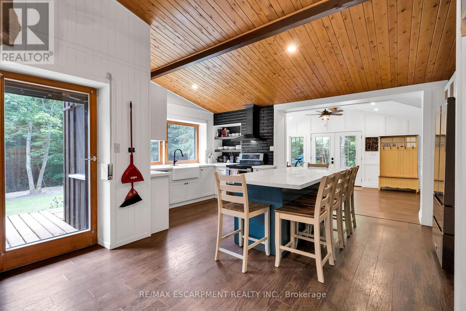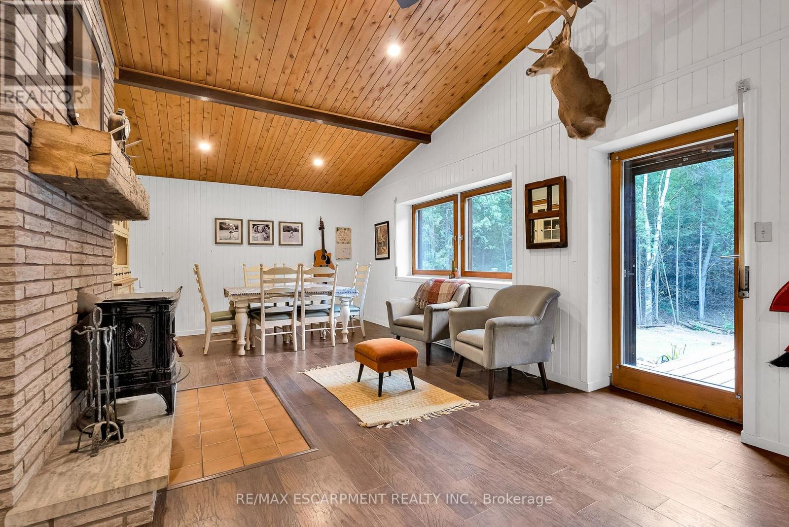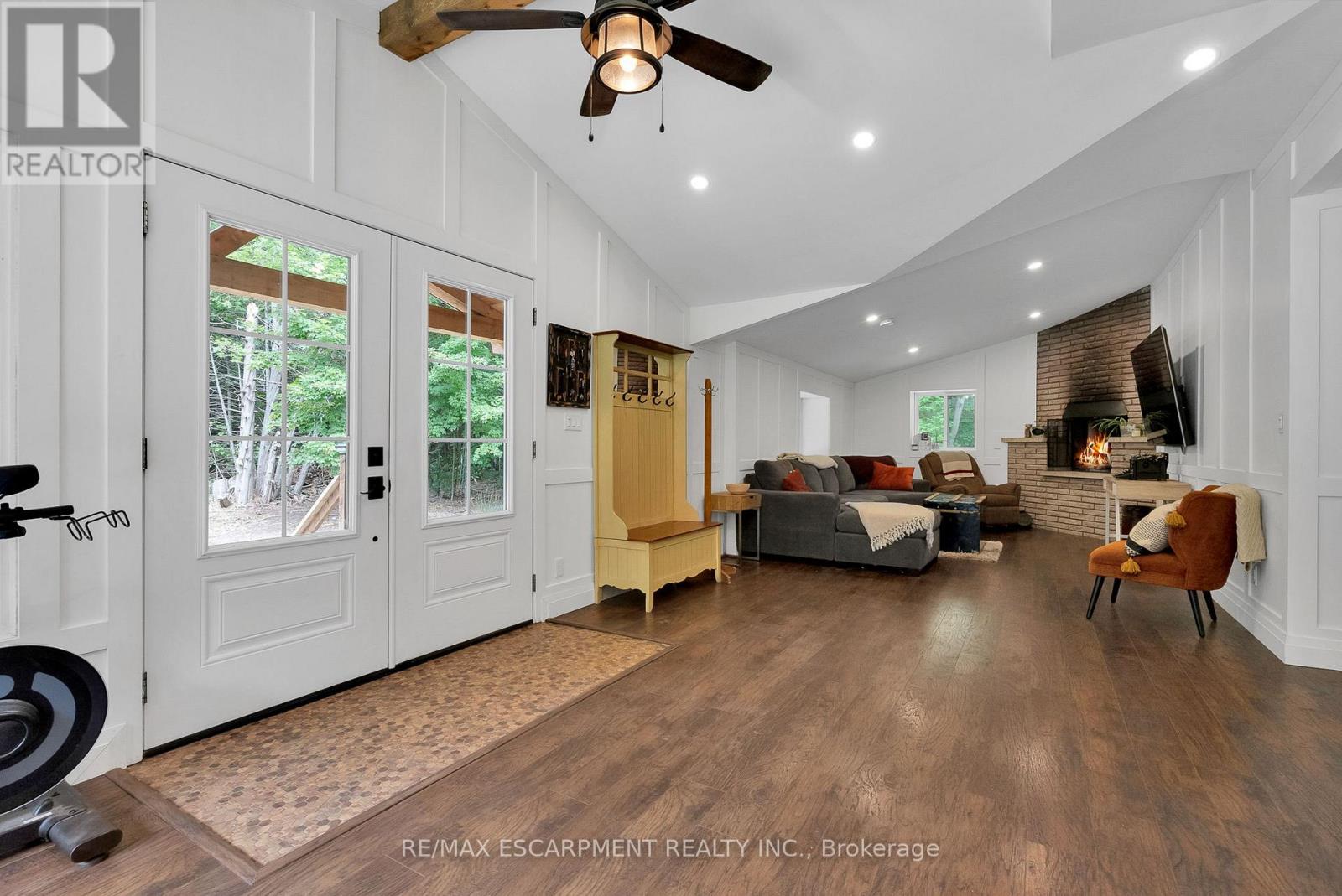 Welcome to 155 Hofer Road your private retreat on 18+ acres of rolling countryside. Renovated and thoughtfully designed, this family home offers the perfect balance of rustic charm and modern comfort. Step inside to a bright and inviting family room where soaring vaulted ceilings, exposed beams, and a wood-burning fireplace create a warm and welcoming atmosphere. Huge windows and a walkout to the deck fill this space with natural light, while pot lighting adds a touch of modern style. The open-concept kitchen and dining area is the true heart of the home, featuring quartz countertops, a farmers sink, a central island, and plenty of storage and prep space ideal for both everyday living and entertaining. On the main level, you'll find two generous bedrooms, including a stunning primary bedroom with a luxurious 5-piece ensuite. A second bedroom and a beautifully updated 4-piece bath ensure comfort and convenience for family or guests. The fully finished lower level provides even more living space with three additional bedrooms, a 3-piece bath, a laundry room, and a large rec room with its own walkout. Perfect for a growing family or hosting overnight guests. Outdoors, every season brings new adventures. In summer, relax in the pool or hot tub, explore the river running through the property, or entertain family and friends on over 1,200 sq. ft. of deck space. Evenings are made for gathering around the firepit under the stars. In winter, lace up your skates and enjoy your own private pond just steps away. Stay connected with Starlink, enjoy the convenience of school bus route access, and appreciate being just 10 minutes to town with easy 401 access. This isn't just a home its a place where every season brings new memories, new adventures, and a way of life you've been waiting for. The only thing missing is you. Its Time to Make YOUR Move! (id:64974)