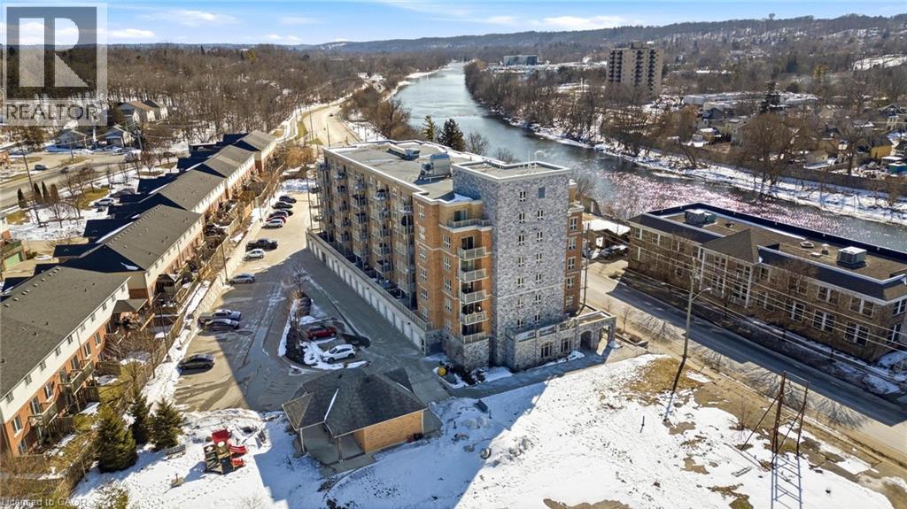 Welcome to RiverFront Condominiums, ideally located along the Grand River and steps from scenic walking trails while remaining close to historic downtown Galt, amenities, shopping, dining, and transit. This bright and functional one-bedroom suite offers an open-concept kitchen and living area with modern flooring throughout. The kitchen features ample cabinetry, full-sized appliances, and a movable central island for additional prep space and seating. The living area provides access to a private balcony, perfect for morning coffee or evening relaxation. The spacious bedroom includes double closets and large windows for natural light. The four-piece bathroom is well maintained with a full tub and shower combination. Additional features include in-suite laundry with a newer washer and dryer (2024). Building amenities include bike storage, a rooftop patio with south-facing river views and a BBQ area, and a playground for children. This suite is an excellent opportunity for first-time buyers, professionals, downsizers, or investors seeking a low-maintenance property alongside the Grand River. (id:64974)