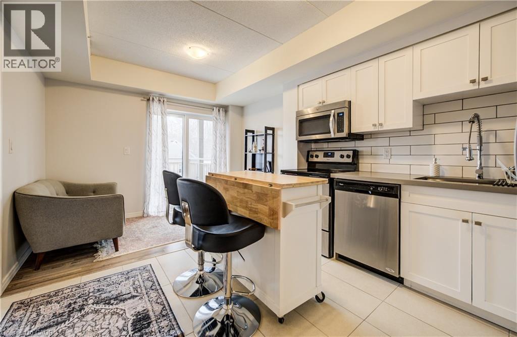 Looking for a modern condo for rent in the East Galt area of Cambridge? Built in 2015, 155 Water Street South offers great building amenities including an elevator, playground, rooftop patio with BBQ, and visitor parking. This fourth floor one bedroom, one bathroom unit is carpet free and offers over 500 square feet of living space, complete with in suite laundry and one surface parking space, spot 52. The bright open concept kitchen features tiled flooring, plenty of cabinetry, quartz countertops, a tiled backsplash, and four stainless steel appliances. The kitchen flows seamlessly into the living and dining area, with sliding door access to the private balcony. The spacious bedroom includes a large window and double closets, with modern grey laminate flooring throughout the unit. A full four piece bathroom is located near the front of the suite. This well maintained condo is ideally suited for professionals, couples, or downsizers and is located within walking distance to Downtown Galt amenities including the Gaslight District, the Grand River, Evo Kitchen, and more. A great opportunity to enjoy modern living in a highly walkable location. (id:64974)