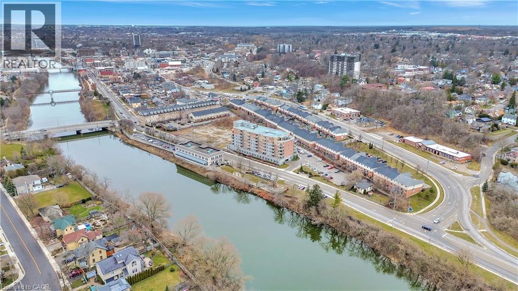 Exceptional Condo in Stunning, Historic Downtown Galt Seize the opportunity to own a pristine, move-in ready condo overlooking the picturesque historic downtown Galt. Built in 2016, the prestigious Riverfront Condos are renowned for their superior design and quality craftsmanship. This solid concrete mid-rise, featuring a striking brick and stone exterior, stands seven stories tall and offers something for everyone. Unit 503 boasts a spacious, open-concept floor plan with 2 bedrooms and 2 full bathrooms—highlighted by a luxurious walk-in closet and ensuite in the primary bedroom. The upgraded kitchen shines with elegant countertops and black appliances, perfect for both everyday living and entertaining. With just under 900 square feet of thoughtfully designed interior space, step out onto your private balcony to savour breathtaking sunrises and western views of the Grand River from the shared rooftop patio and charming downtown Galt. Convenience is key — this unit includes one owned parking spot along with ample visitor parking. Enjoy being just minutes from all your favourite amenities: the vibrant new Gaslight District, upscale coffee shops, fine dining, scenic hiking trails, water activities, boutique shopping, theatres, and bustling local markets. Galt is a community that beautifully blends its historic charm with a modern, forward-thinking spirit. Exciting developments are underway, including the upcoming second phase of the Light Rail Transit connecting Galt to KW, as well as new condos and the entertaining gaslight district just steps away, expanding residential and commercial spaces along the Grand River. With quick access to Highway 401 (just 15 minutes away) and Highway 8 towards Hamilton, this location offers incredible connectivity without sacrificing tranquility. Discover why Galt Cambridge is quickly becoming one of the most sought-after places to live — embrace this exceptional lifestyle today! (id:64974)