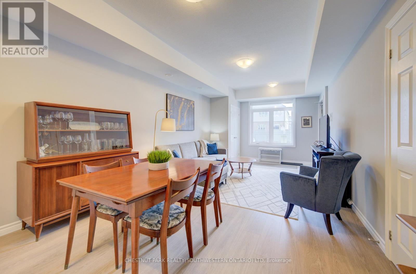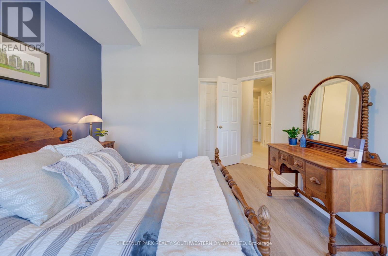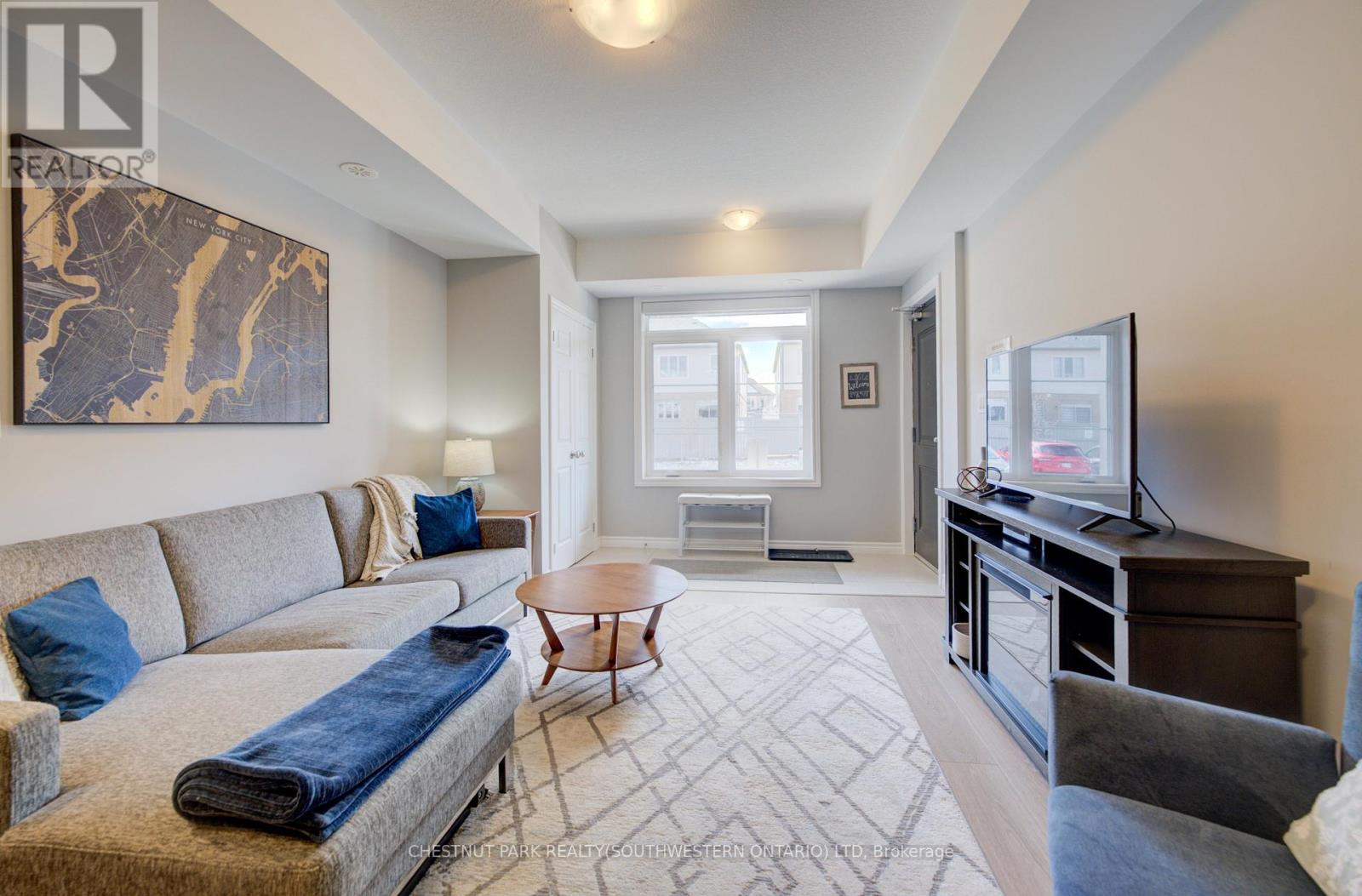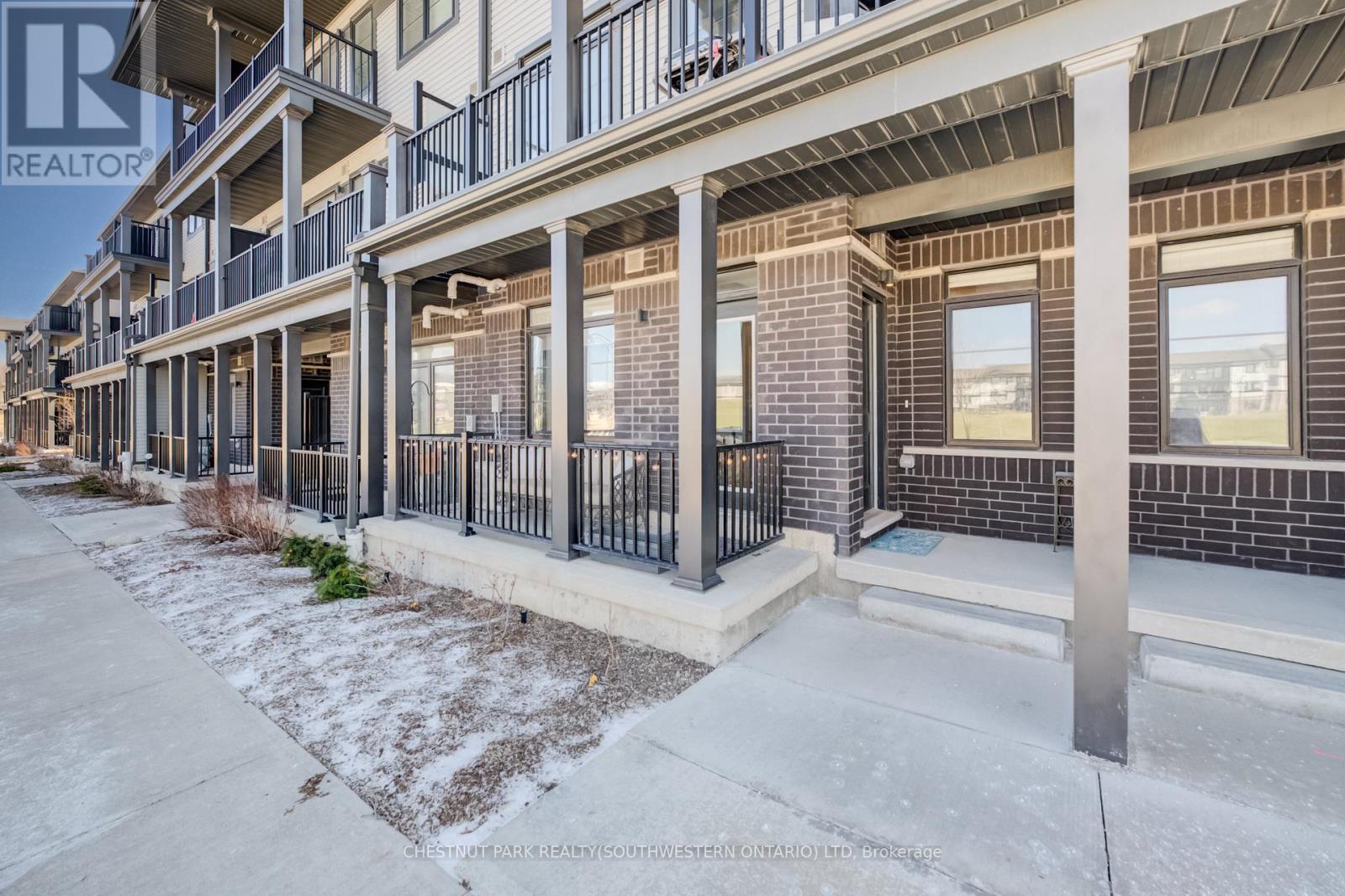 Have you been pondering your next step? Whether upsizing from your first apartment or downsizing into a very comfortable single-level lifestyle, that next step could be right into this bright and cheery, open-concept condo townhome in Huron Woods! 156 Wheat Lane presents two bedrooms and two bathrooms in a modern (2022) and impeccably maintained package, situated within easy walking distance to both the new Cowan Recreation Centre and RBJ Schlegel Park, the numerous amenities at Huron and Fischer-Hallman, and primary schools of both the public and separate boards. Next, step on into the naturally lit and sprawling primary living space. You'll appreciate the high ceilings here, as you carry on through to a gleaming kitchen, enhanced by some of the $20,000 worth of builder upgrades present in this home - namely, upgraded quartz countertops and under-cabinet lighting, with an additional inset for the microwave. Additional storage can be found in the walk-in pantry, en-route to the primary four-piece bath (which also features upgraded tile and quartz counters), and a convenient stacked laundry. Further down the hallway lie two nicely proportioned bedrooms, including the primary suite with its walk-in closet, three-piece ensuite bath, and private access to a balcony overlooking Wallaceton Park - an ideal spot to unwind and take in gorgeous sunsets over the park. Even more highlights include custom Hunter Douglas blinds throughout, oversized windows, and a private assigned parking space. Within walking distance of Huron Natural Area, and an easy hike from numerous parks (and some great winter sledding hills), it's a great option for any active family! Don't miss out on the chance to put down roots in this exceptionally family-friendly community - schedule a tour today. (id:64974)