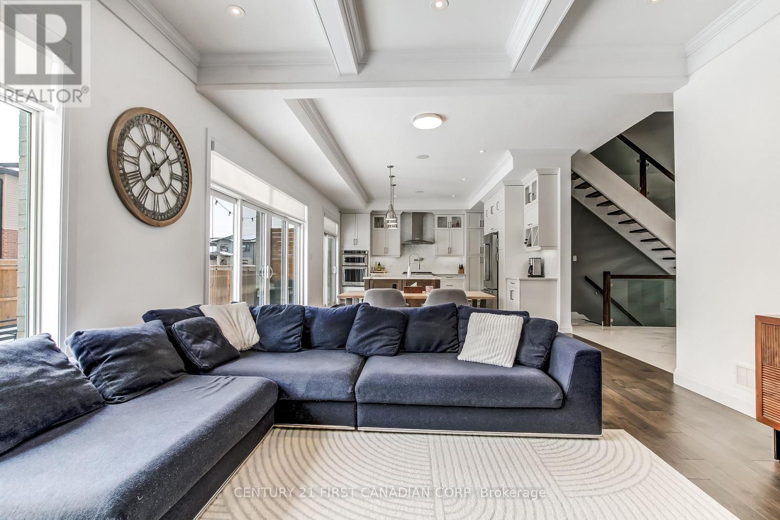 Located in beautiful Fanshawe Ridge, this 3000+ sqft family home is loaded with gorgeous quality finishes, style and contemporary design. This home features 4 generous bedrooms, 3.5 bathrooms, main floor office, spacious living room, elegant formal dining room and an amazing kitchen overlooking your comfortable family room. Granite countertops throughout, upgraded trim levels, gorgeous tile, gourmet kitchen, waffled ceilings, feature wall, engineered hardwood, transom windows, and so much more.Spacious basement with 9-foot ceilings-an open canvas ready for your creative vision. Fully fenced yard featuring well maintained landscaping, concrete walkways, covered patio deck and a fire pit-perfect for outdoor gatherings. Nestled in a calm neighbourhood and conveniently located near a brand-new plaza filled with great amenities. (id:64974)