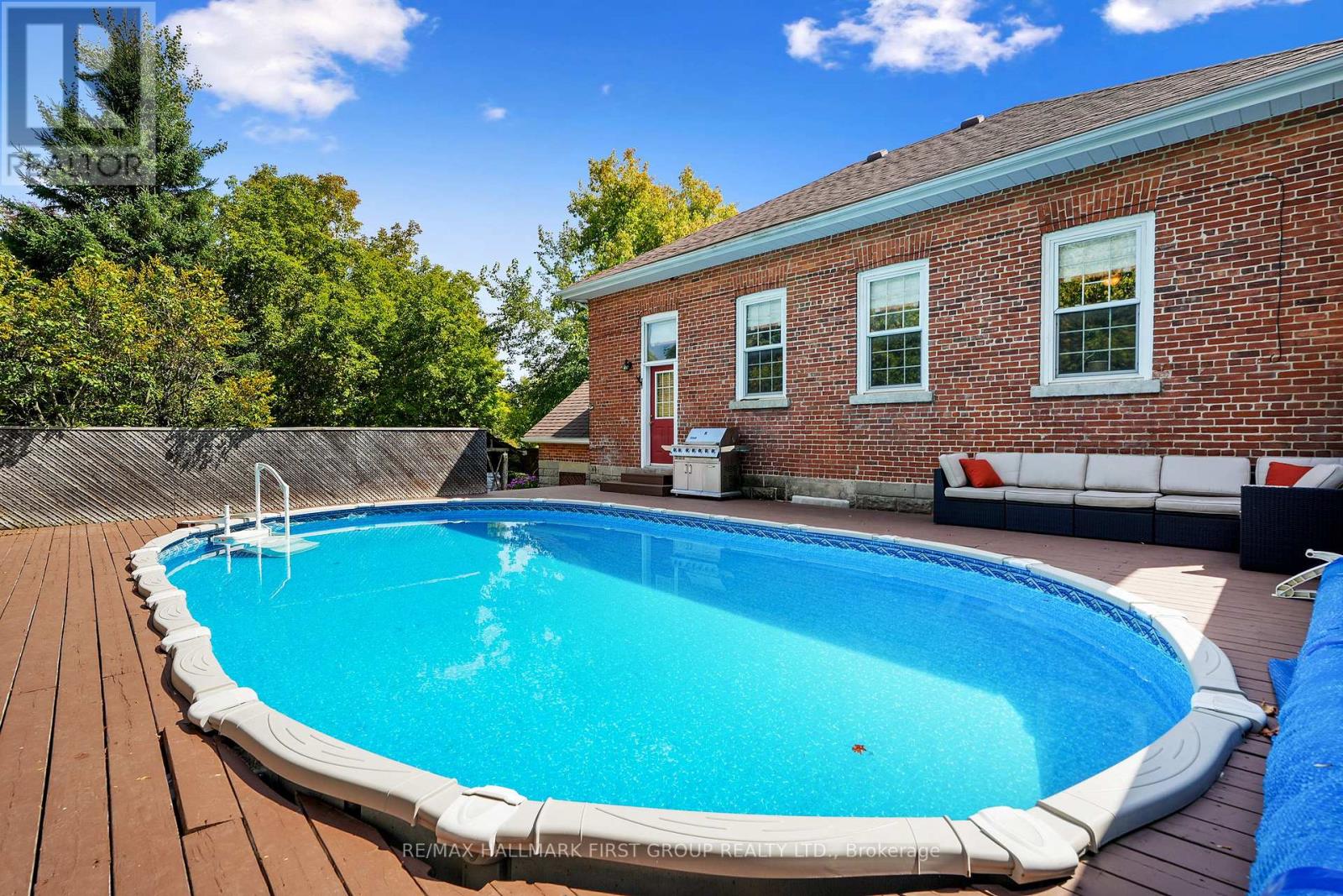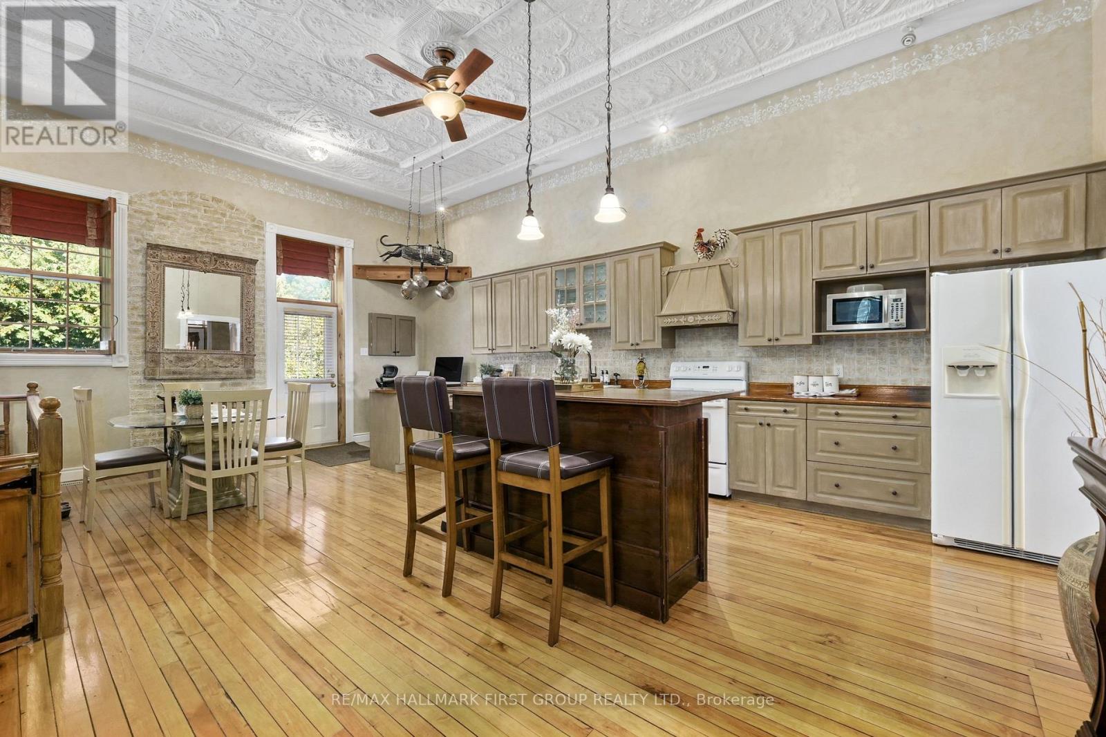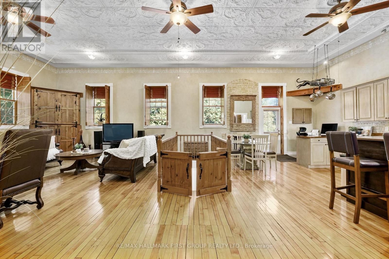 Once a historic schoolhouse, now beautifully transformed into a one-of-a-kind residence, this home is filled with character and charm, built in the early 1900s and thoughtfully updated for modern living. This unique property features a finished lower level with a separate entrance, ideal for a home-based business, in-law suite, or private guest retreat, as well as a backyard oasis that feels like a world of its own. The open principal living space showcases soaring original hand-hammered tin ceilings that have been powder-coated white, creating an unforgettable statement. Sunlight streams through large windows with custom wood shutters, illuminating the spacious living and dining areas designed for effortless entertaining. The expansive eat-in kitchen features an island with a breakfast bar, pendant lighting, matching appliances, a tile backsplash, and a walkout to the back deck. A cozy breakfast area with exposed brick is the perfect spot for informal family meals. On the main floor, you'll find the primary suite complete with dual closets, a private walkout, and a bathroom. Downstairs, the updated lower level offers a large recreation room with recessed lighting, perfect for lounging or game nights. A spacious bedroom, office or guest bedroom, three-piece bathroom and a powder room, plus a laundry room, provide excellent flexibility for today's needs. The outdoor spaces are just as captivating. A welcoming front deck sets the tone for morning coffee, while the backyard unfolds into a true retreat. Enjoy summer afternoons by the pool with a deck surround, relax beneath mature trees (including fruit trees), or wander through vibrant gardens. A rustic gazebo by the koi pond invites quiet moments, and even a chicken coop adds to the charm of this remarkable property. Ideally located close to schools, amenities, and access to the 401, this home seamlessly blends timeless character with modern convenience, a rare find ready to be cherished. (id:64974)