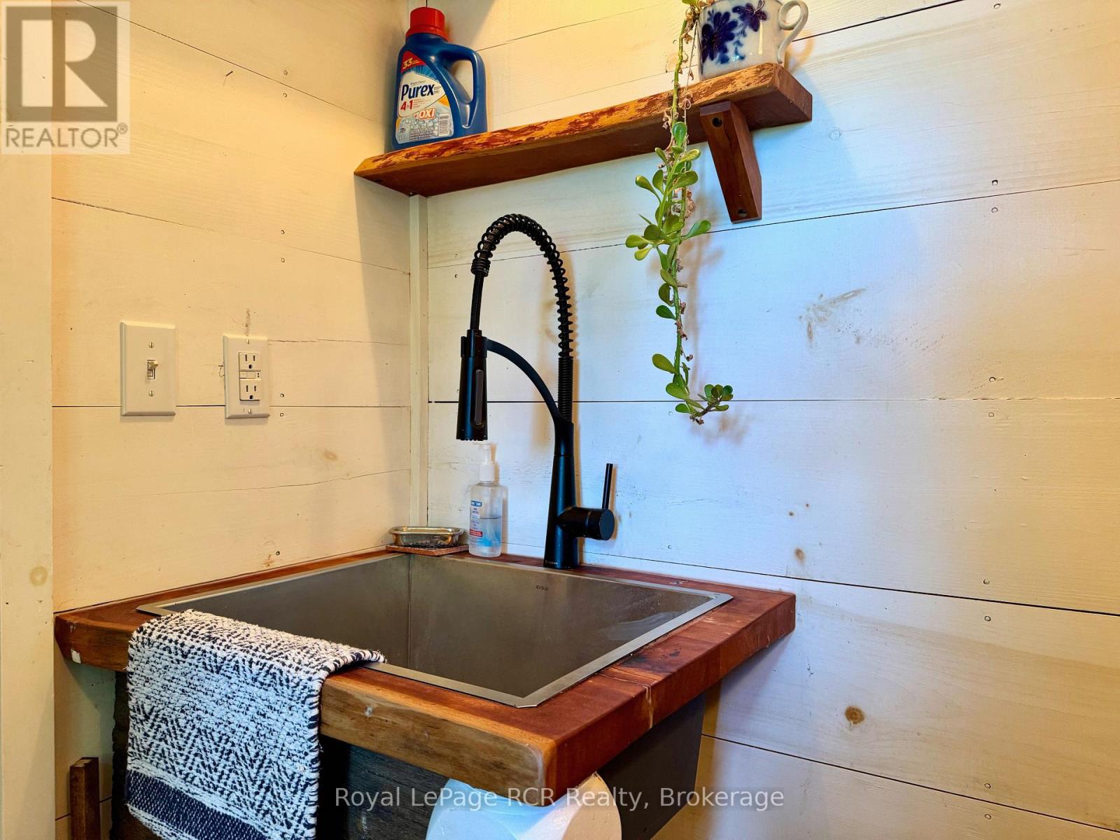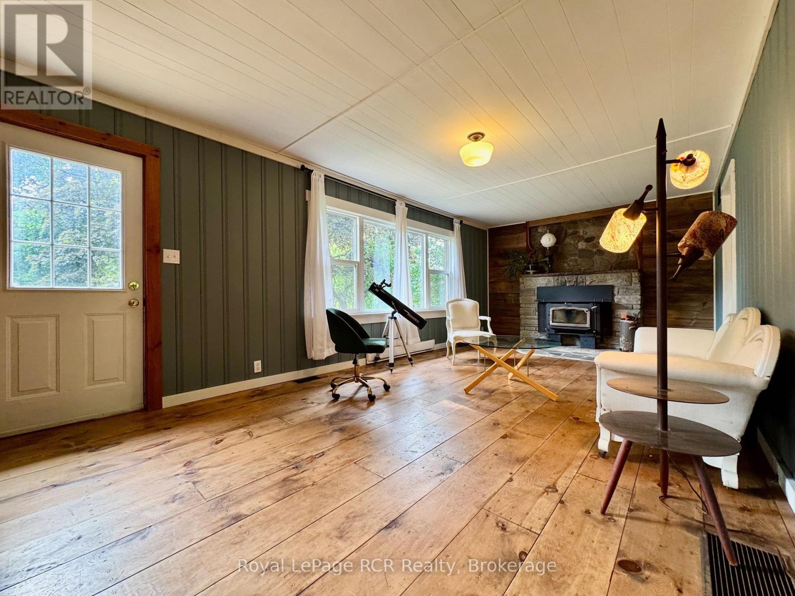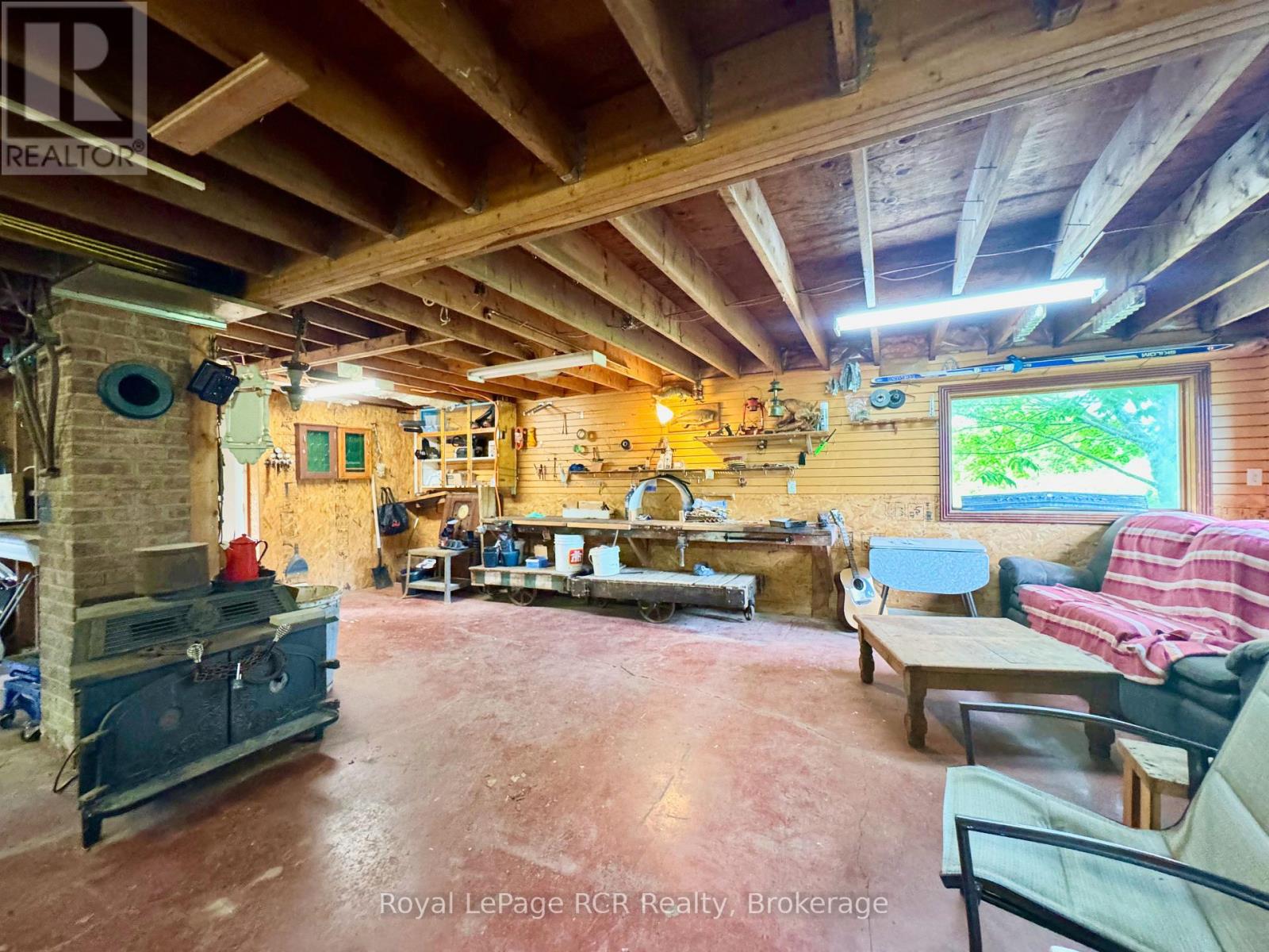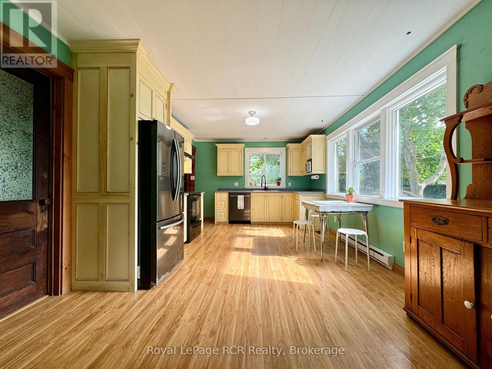 A HIDDEN GEM only fully appreciated with a VISIT! This ONE-FLOOR LIVING HOME or 4-SEASON VACATION RETREAT + a 2,100+ SQ FT GARAGE/SHOP set on a 1+ ACRE PROPERTY surrounded by lush pasture farmland & forest, and steps to BRUCE TRAIL ACESS! Entire property shows MODERN RUSTIC COUNTRY charm! The real hidden gem is apparent from the moment you enter the mudroom foyer with bold nautical blue colour, CUSTOM STONE-TILE floor and WOOD BUILT-INS. Step further into this home, you see a MODERN FINISH LAUNDRY ROOM including LIVE-EDGE WOOD folding counter and shelving, OPEN CONCEPT KITCHEN-DINING with NEWER CABINETRY and MODERN APPLIANCES, living room offers WIDE-PLANK WOOD FLOORING, BARN-BOARD FEATURE-WALL and stone fireplace w/EFFICIENT AIR-TIGHT WOOD INSERT. Two large, bright bedrooms with built-ins and PAINTED T&G WOOD CEILINGS, a 'SHOW STOPPER' CUSTOM FINISH BATHROOM w/mix of WOOD & NATURAL-STONE FLOORING, wood counter & COPPER SINK & HARDWARE . ... this raised bungalow offers 1,100+ sq ft of COMPLETE UNIQUENESS + 700+ SQ FT of DECKING! 1+ acre of property with 400ft of frontage and LUSH GREEN SPACE FOR PRIVACY. A fully INSULATED GARAGE-SHOP with 2,100+ SQ FT of extra work-living space ON TWO LEVELS w/200amp power & plumbing rough-in would make a perfect STUDIO or SEPARATE RESIDENCE! A great 'country' setting on paved road less than 10mins to the QUANT VILLAGE of Lions Head (shopping, hospital w/24hr emerg, health clinic, library, post office, marina & sand beach), 22 mins to National Park/Grotto, 30mins to Tobermory! This unique property offers PRIVACY and is SURROUNDED BY NATURE... definitely WORTH BOOKING A VIEWING!! (id:64974)