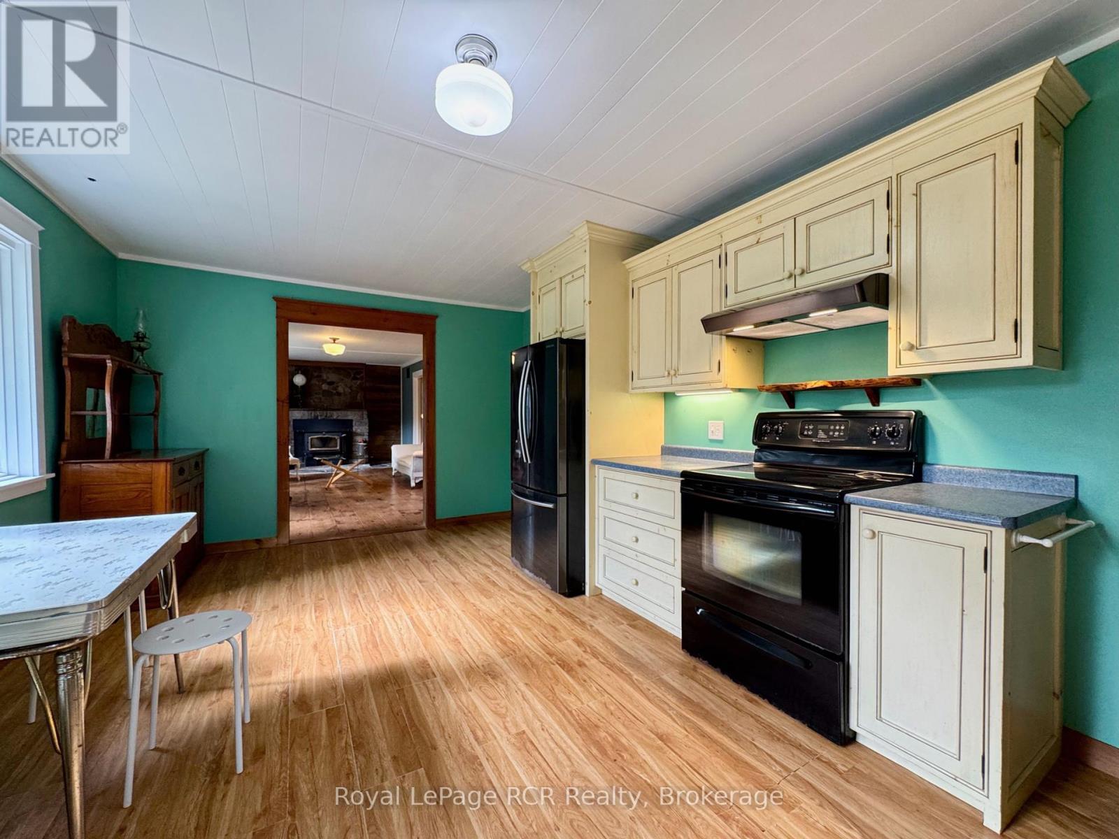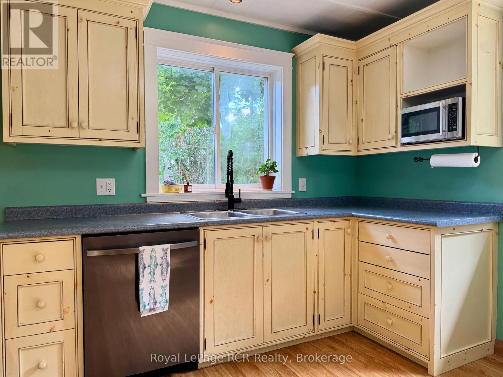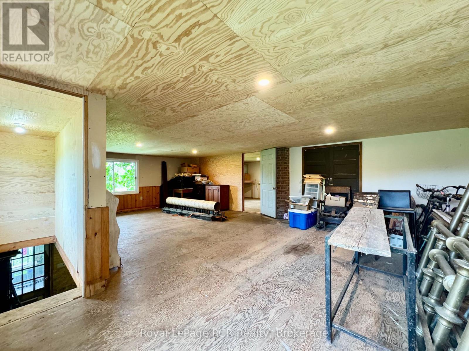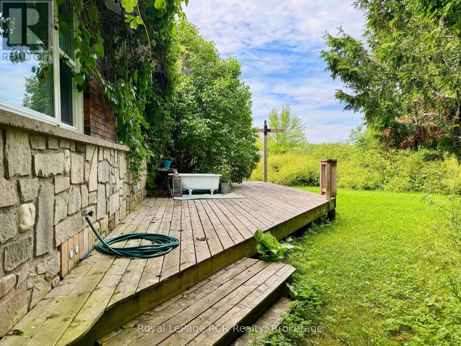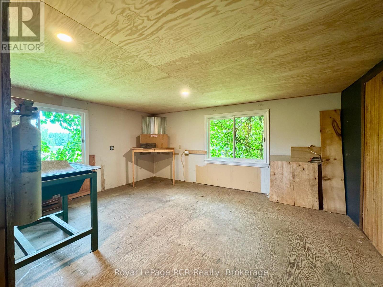 A HIDDEN GEM only fully appreciated with a VISIT! This ONE-FLOOR LIVING HOME or 4-SEASON VACATION RETREAT + a 2,100+ SQ FT GARAGE/SHOP set on a 1+ ACRE PROPERTY surrounded by lush pasture farmland & forest, and steps to BRUCE TRAIL ACESS! Entire property shows MODERN RUSTIC COUNTRY charm! The real hidden gem is apparent from the moment you enter the mudroom foyer with bold nautical blue colour, CUSTOM STONE-TILE floor and WOOD BUILT-INS. Step further into this home, you see a MODERN FINISH LAUNDRY ROOM including LIVE-EDGE WOOD folding counter and shelving, OPEN CONCEPT KITCHEN-DINING with NEWER CABINETRY and MODERN APPLIANCES, living room offers WIDE-PLANK WOOD FLOORING, BARN-BOARD FEATURE-WALL and stone fireplace w/EFFICIENT AIR-TIGHT WOOD INSERT. Two large, bright bedrooms with built-ins and PAINTED T&G WOOD CEILINGS, a 'SHOW STOPPER' CUSTOM FINISH BATHROOM w/mix of WOOD & NATURAL-STONE FLOORING, wood counter & COPPER SINK & HARDWARE . ... this raised bungalow offers 1,100+ sq ft of COMPLETE UNIQUENESS + 700+ SQ FT of DECKING! 1+ acre of property with 400ft of frontage and LUSH GREEN SPACE FOR PRIVACY. A fully INSULATED GARAGE-SHOP with 2,100+ SQ FT of extra work-living space ON TWO LEVELS w/200amp power & plumbing rough-in would make a perfect STUDIO or SEPARATE RESIDENCE! A great 'country' setting on paved road less than 10mins to the QUANT VILLAGE of Lions Head (shopping, hospital w/24hr emerg, health clinic, library, post office, marina & sand beach), 22 mins to National Park/Grotto, 30mins to Tobermory! This unique property offers PRIVACY and is SURROUNDED BY NATURE... definitely WORTH BOOKING A VIEWING!! (id:64974)