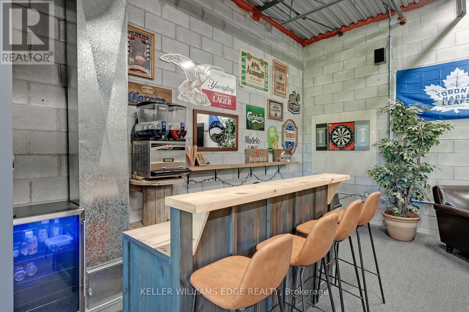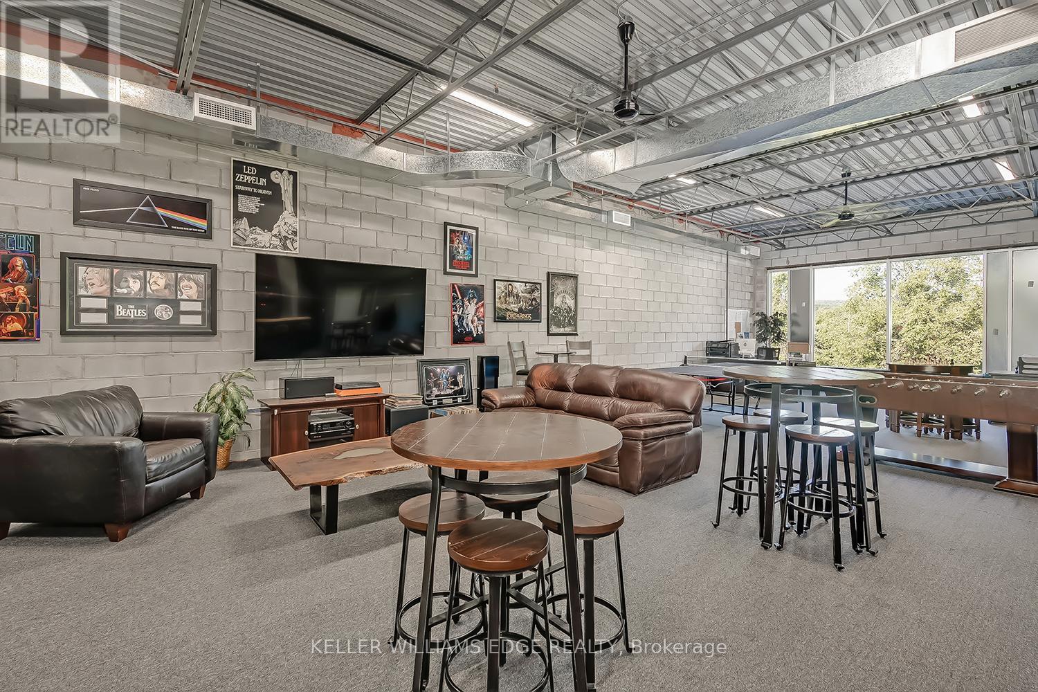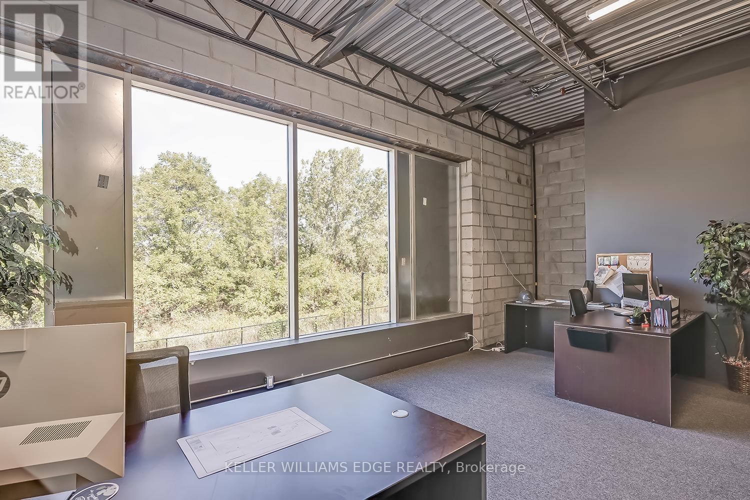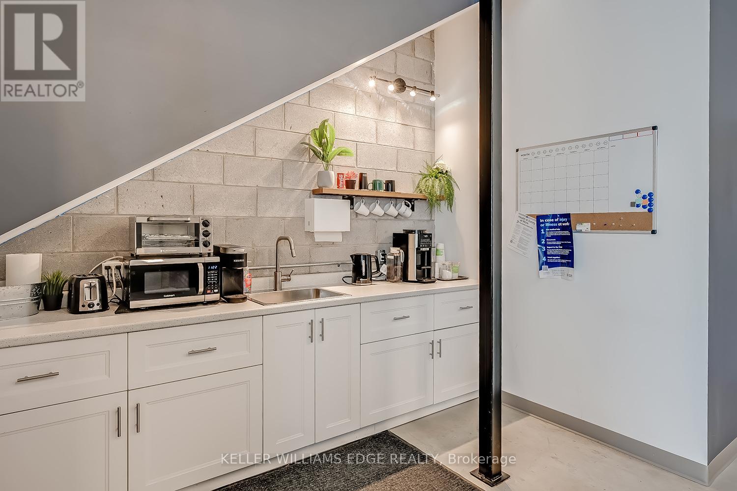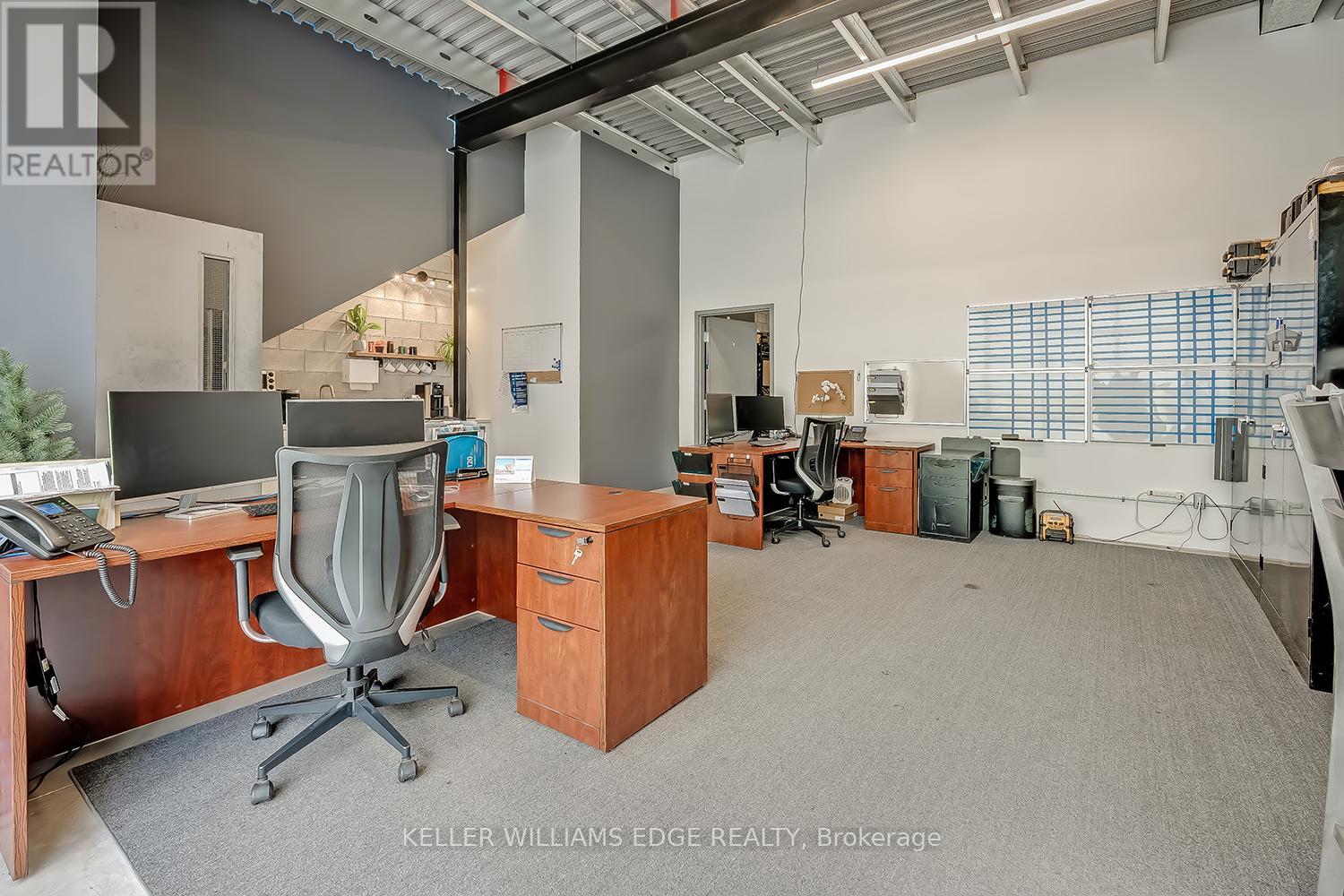 PRIME INDUSTRIAL-COMMERCIAL OPPORTUNITY - This rare and versatile unit offers approximately 2,172 sq. ft. of functional space, including a 1,000 sq. ft. upper mezzanine. Bright and inviting with expansive windows, a glass front entry, and a 10' x 10' drive-in shipping door, this property is designed to meet a wide range of business needs. The main floor features polished concrete floors, a functional kitchenette, spacious washroom, and dedicated storage. The open-concept mezzanine provides flexible options for additional storage, offices, meetings or collaborative work and even includes a wet bar. Additional highlights include 3-phase 60amp/600v electrical service, sprinkler system, and ample on-site parking for staff and visitors. With excellent visibility from King Road and convenient access to Highways 403, 407, QEW, and GO Transit, the location is as strategic as it is practical. Seller is willing to close the adjoining wall or leave it open should you wish to expand by leasing the neighbouring unit. (id:64974)