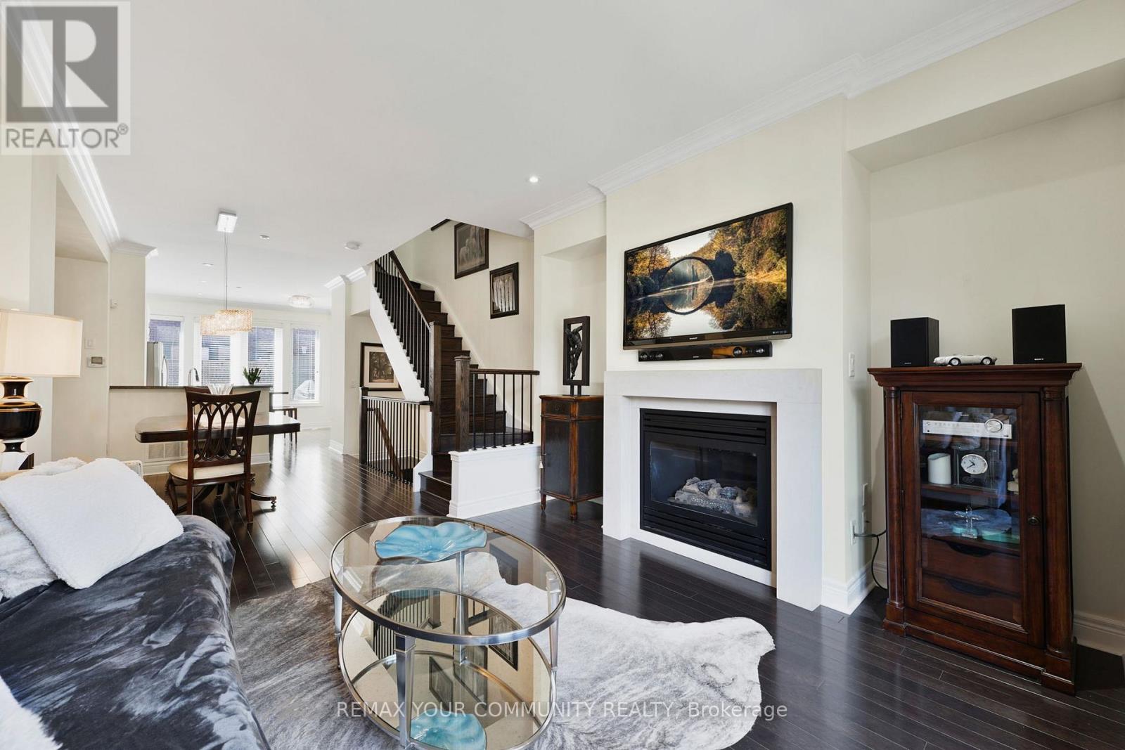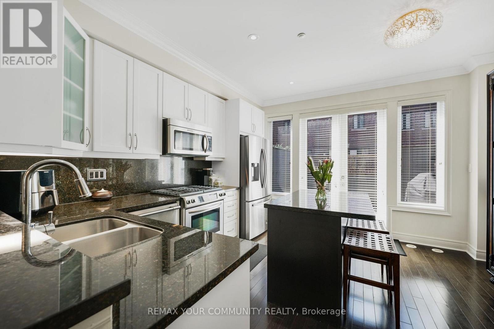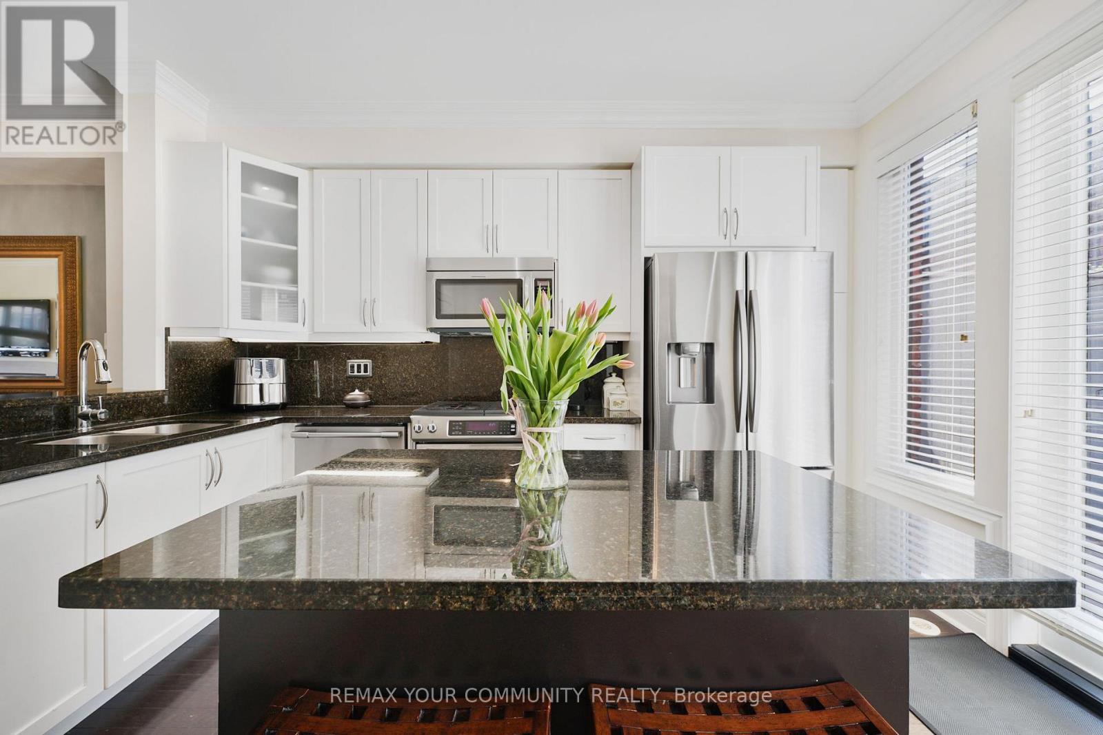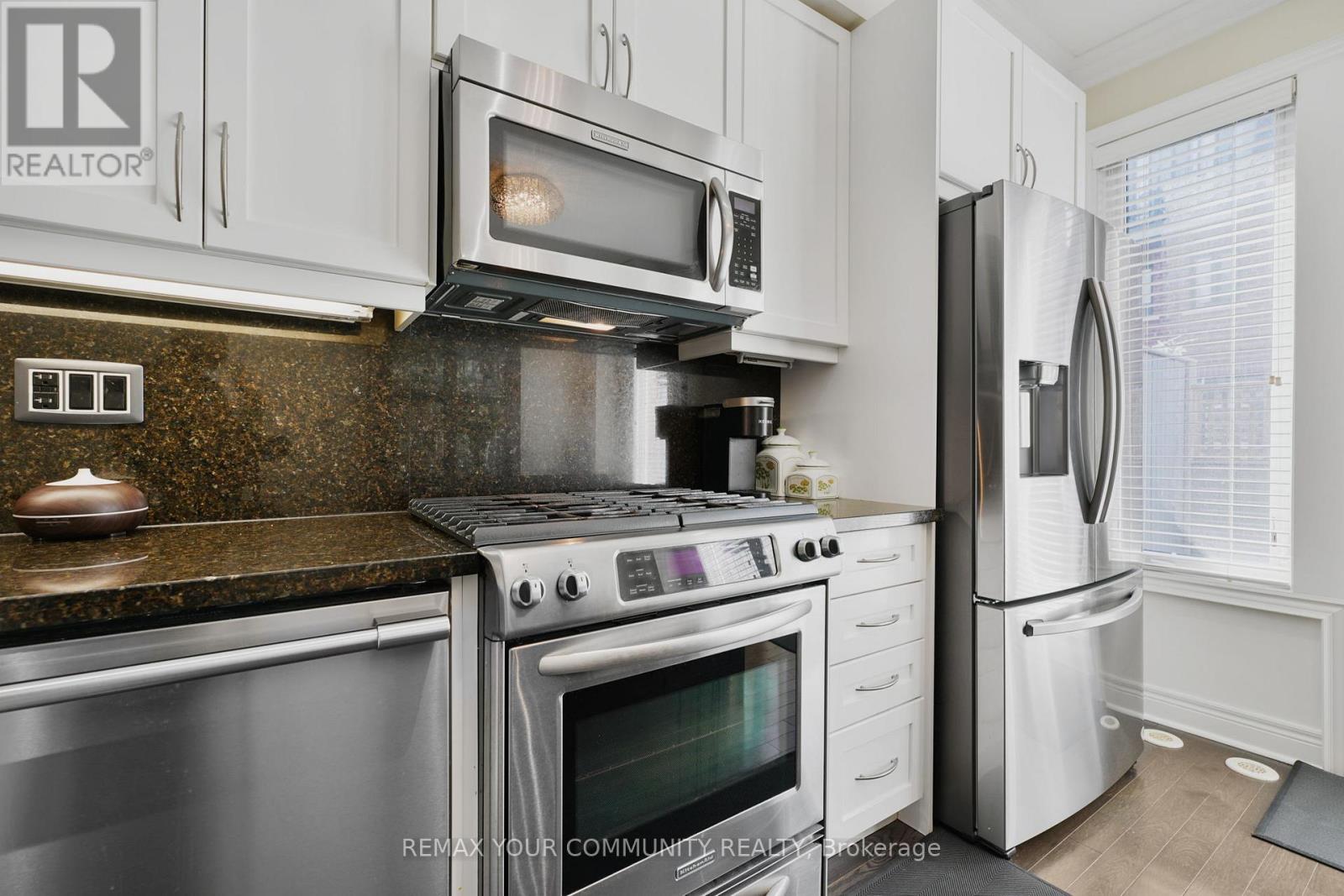 Riverside Luxury Townhouse for Sale. Welcome to a peaceful luxury townhouse community in matured Woodbridge, surround by Market Lane Shops, Restaurants, Supermarkets, Public Transit, easy access to HWY 27, 427, 407 and 50. A premium lot, facing a quiet private community park. It provides a save, elegant, spacious and economical life-style-living, with security monitored, concealed ceiling fire-sprinklers throughout and an oversized indoor two-car tandem garage with generous storage space. Rich wood floors and stairs with 9ft ceilings and crow-moldings are throughout the home. The entry-level floor has heated ceramic floors, one washroom and a spacious den with large wood shutter windows facing the private park area - ideal for office, exercise or bedroom use. The primary floor level has an open-concept layout with large windows facing the private park. A gas fireplace with stone-facing enriches has spacious living and dining area. The Kitchen has generous cabinet storage and a pantry. Granite countertops, including the kitchen island has generous cabinet storage and a pantry. Granite countertops, including the kitchen island with additional storage space. The refrigerator, dishwasher and gas-stove are stainless steel, and large size microwave. Double French doors exit's the kitchen into a spacious private outdoor patio balcony. The secondary floor level has 2 spacious bedrooms, one with wall-to-wall windows for a breathtaking view of the community private park. A full bathroom services the floor level, along with the laundry room with ample storage space. The grand master bedroom has a walk-out balcony, a custom-built walk-in closet and a large spa-like 5 pcs ensuite with double-sink and a jacuzzi. (id:64974)