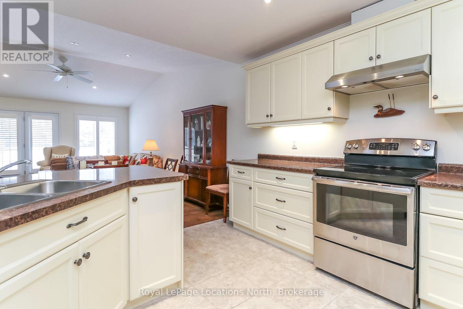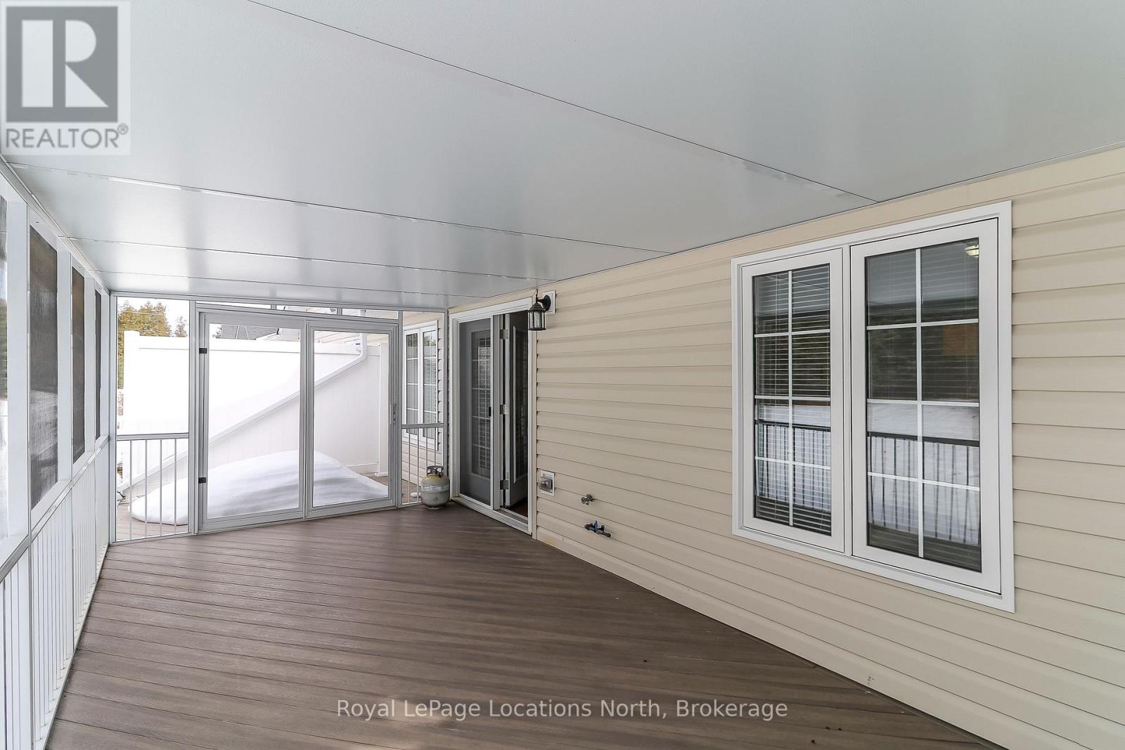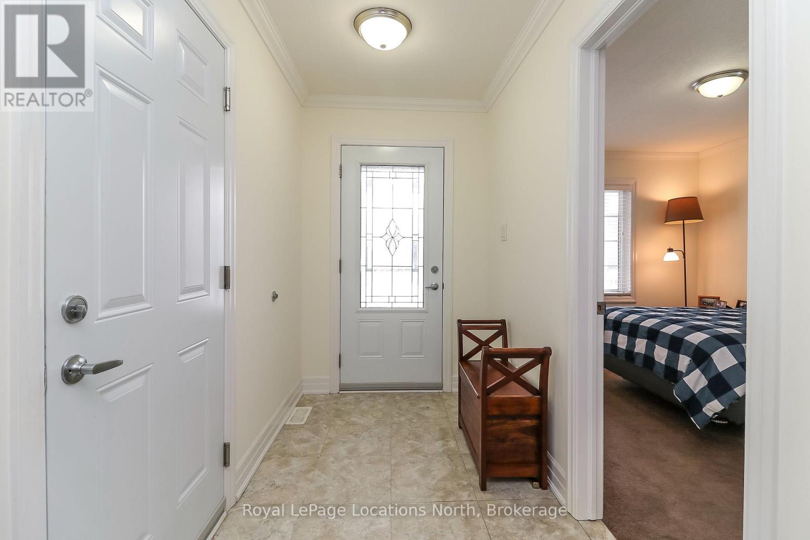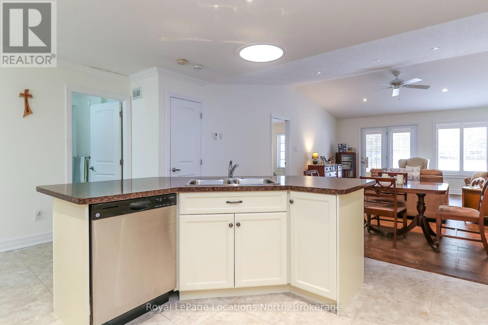 Spotlessly clean, wonderfully laid-out true bungalow (no steps at front door) located in a popular adult (age 55+) land lease community in a very quiet & tranquil area of Wasaga Beach. This 10-year-old, 1,248 sq. ft. semi-detached end-unit home has 2 bedrooms/2 bathrooms & shows like new. Features include open-concept principal living areas (kitchen, dining area & living room); vaulted ceilings with pot lights; elegant crown moulding; an upgraded kitchen (with a center island/breakfast bar & stainless steel appliances); low-maintenance flooring [a nice mixture of engineered laminate (living & dining areas), carpeted bedrooms, & laminate flooring (kitchen, bathrooms, laundry & foyer)]. You'll appreciate a covered front entrance & porch, a 10' x 29' screened-in rear deck (composite) with an open BBQ area, the 12' x 25' (extra deep) garage, & a double-wide, paved driveway with room to park 2 cars. Located nearby is some very convenient visitor's parking too. As for HVAC, the house features an economical forced-air gas furnace, central air-conditioning, & an HRV in the 4'5" crawl space (with a cement floor, great for off-season storage). Located in the 6th & final phase known as Founder's Village within Park Place (one of Wasaga Beach's premier adult land-lease communities). The nearby private pond (with a water fountain feature & gazebo) makes for a very private, peaceful, & tranquil neighbourhood. This gorgeous community (with trails) is part of 115 acres of forest & fields, water & wilderness in Wasaga Beach. Numerous amenities on-site include a 12,000 sq. ft. recreation complex, an indoor saltwater pool, game rooms, a woodworking shop & more. This neighbourhood is private yet still ideally located within minutes from the beach, shopping, Marlwood Golf Course, the trail system & other amenities. Monthly fees to new owners will be $1,014.13 [Land Lease ($800) + Lot Tax ($60.40) + Structure Tax ($153.73)]. Buyers are responsible for snow removal & lawn maintenance. (id:64974)