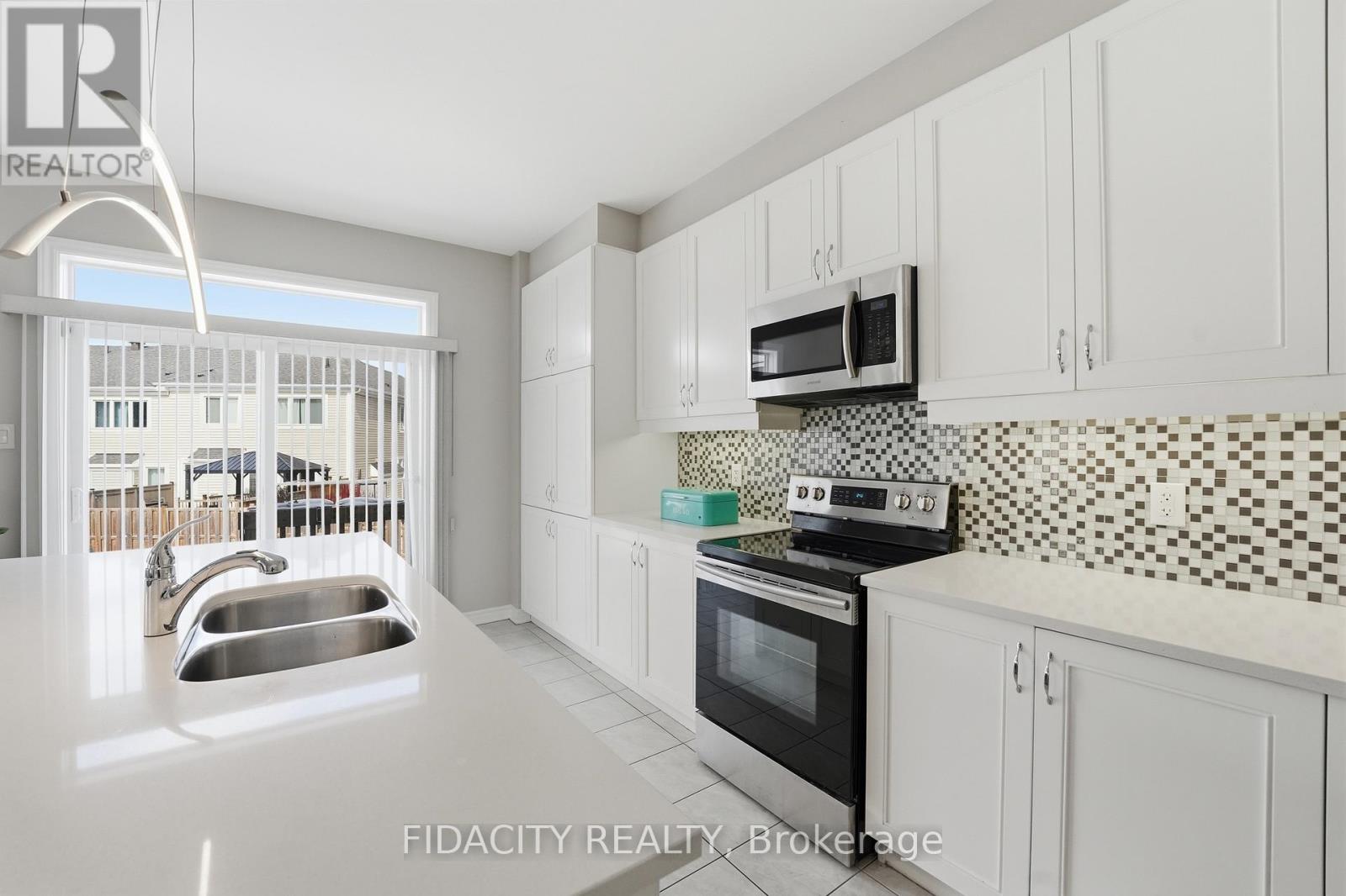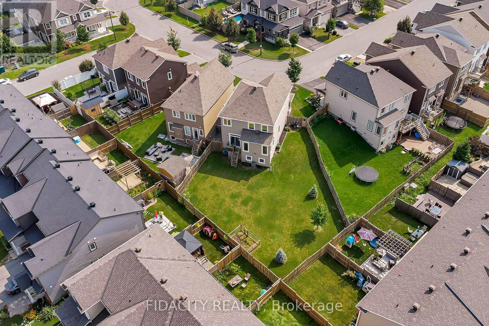 Welcome to a home that gives you space-inside and out. Set on an oversized lot in the sought-after Fairwinds community, with a double car garage, this 4-bedroom, 4-bathroom home offers a great balance of comfort, layout, and location. Located on a quiet circle, yet just minutes to the 417, Canadian Tire Centre, Tanger Outlets, schools, grocery stores, multiple parks, splash pads, outdoor rinks and much more!The main level is bright and open with 9-foot smooth ceilings, hardwood and ceramic flooring, and a layout that flows easily from room to room. Extra windows bring in tons of natural light and offer a beautiful view of the expansive backyard. The living room is anchored by a gas fireplace, adding warmth and a natural focal point. The chef's kitchen is the centre of it all, featuring quartz countertops, a large island with seating, a dedicated coffee bar, and plenty of storage, all open to the dining and living areas for easy entertaining. Upstairs offers three well-sized bedrooms, including a spacious primary suite at the back of the home with a walk-in closet and a full ensuite with double sinks, a deep soaker tub, and a separate walk-in shower. A full main bathroom and second-floor laundry complete this level.The finished basement adds valuable living space with a fourth bedroom with proper egress, a full bathroom, and a rec room-perfect for guests, teens, or a home office setup.Outside, the fully fenced oversized yard provides plenty of room to relax, entertain, or enjoy time outdoors, with mature trees (2 spruce, and one red maple) offering added privacy in the summer months. Move-in ready in a location that keeps everything close by. Completed in recent years: mature trees added, ceilings smoothed, second-floor carpet replaced with hardwood, basement finished with bedroom, a large bathroom with glass shower, and driveway resealed. (1907 sq ft above grade + finished basement) (id:64974)